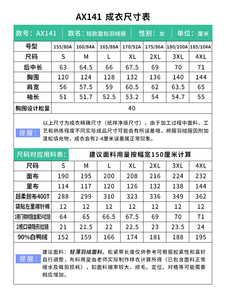 裁缝学苑AX141短款羽绒服纸样女装韩版面包服外套上衣版型