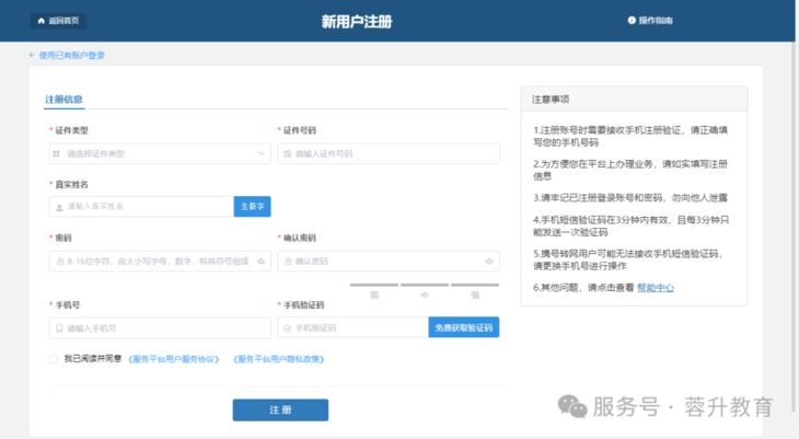 ▶️ 点击右上角「注册」→ 选择证件类型 → 填写姓名、证件号、手机号 → 设置密码(含大小写字母 + 数字 + 符号)