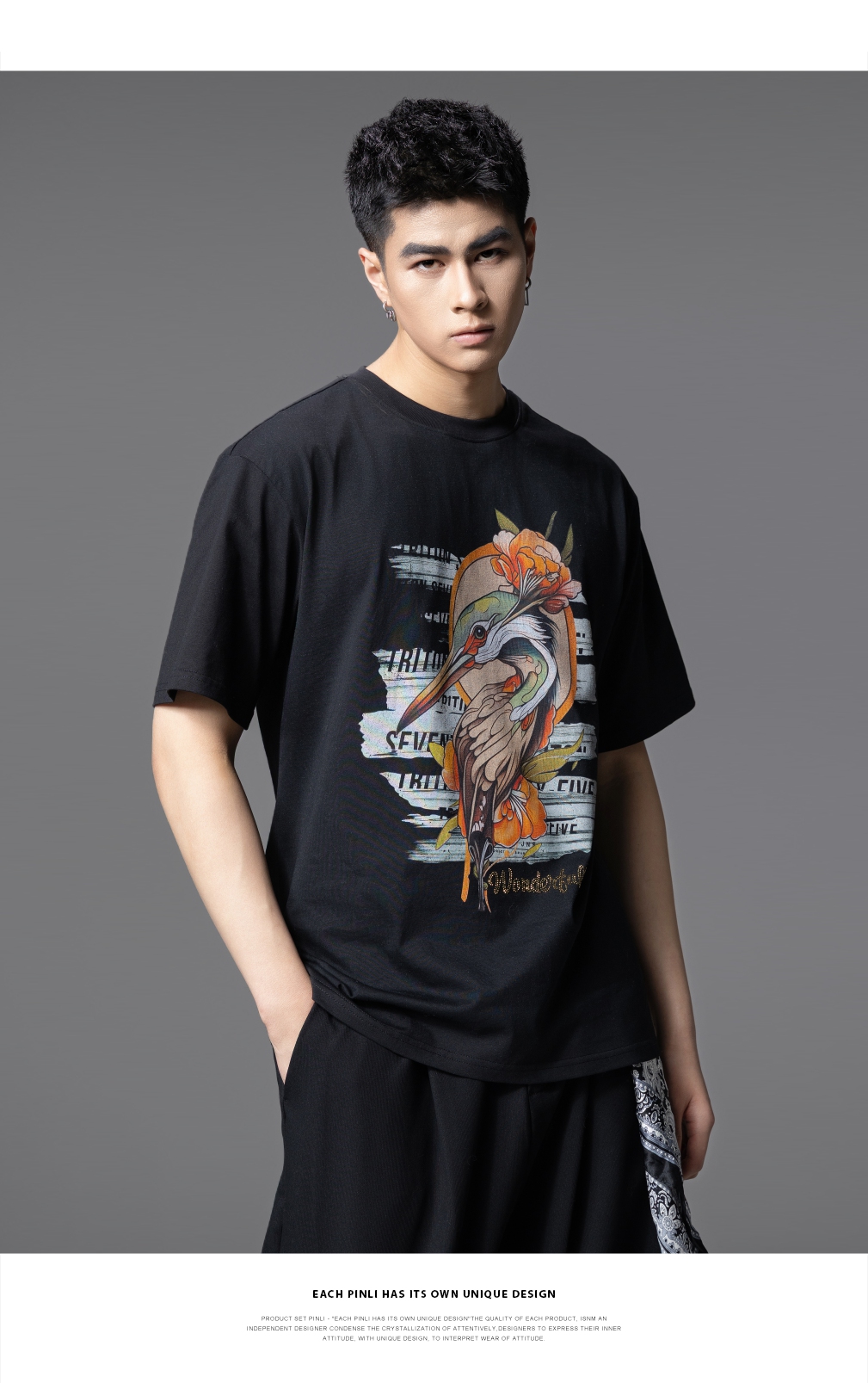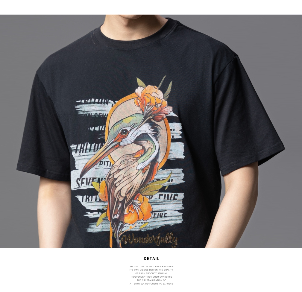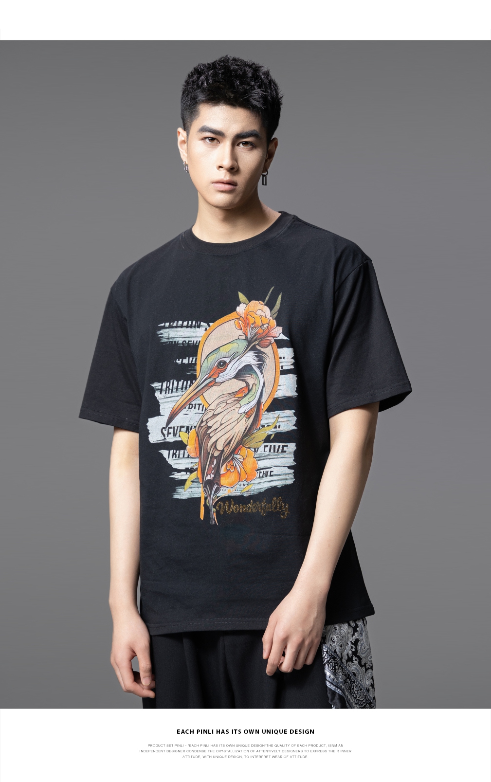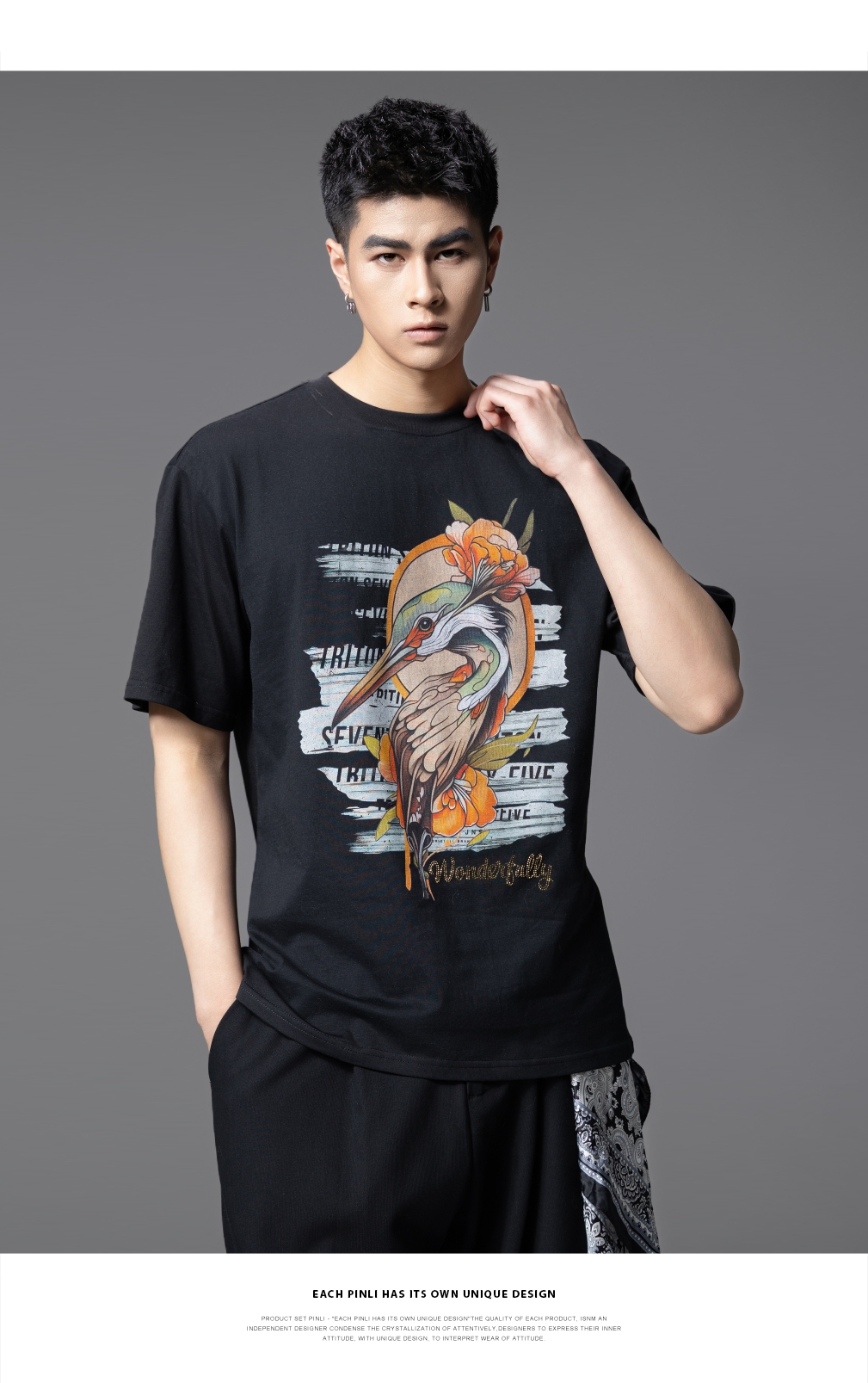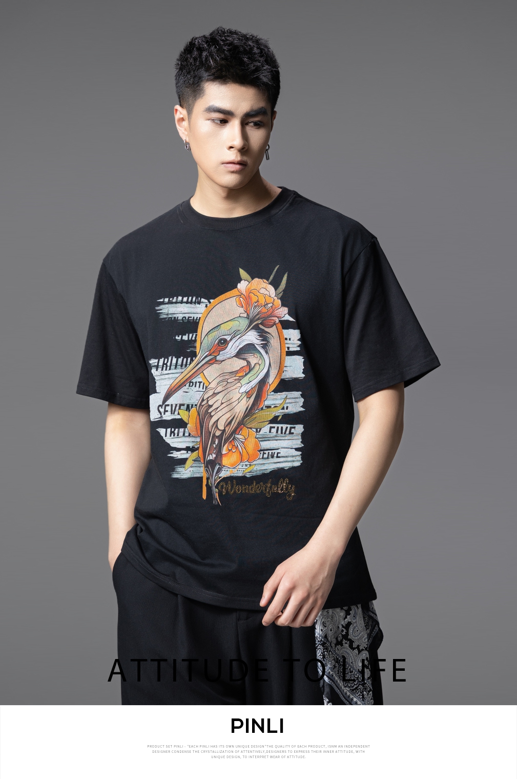 PINLI品立2025夏季新款动物印花烫钻短袖T恤男休闲圆领体恤衫上衣BG252111030