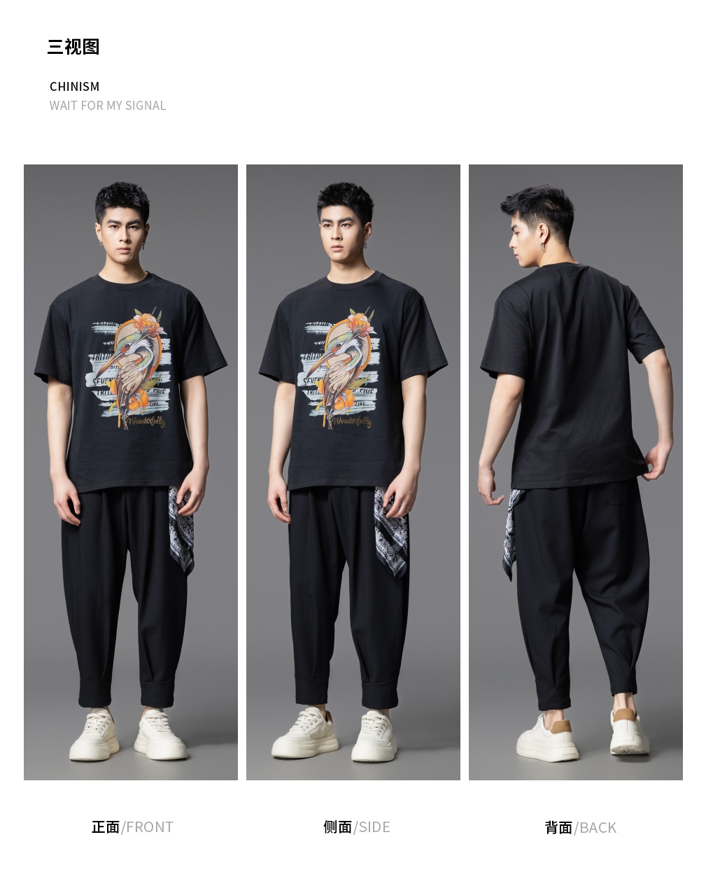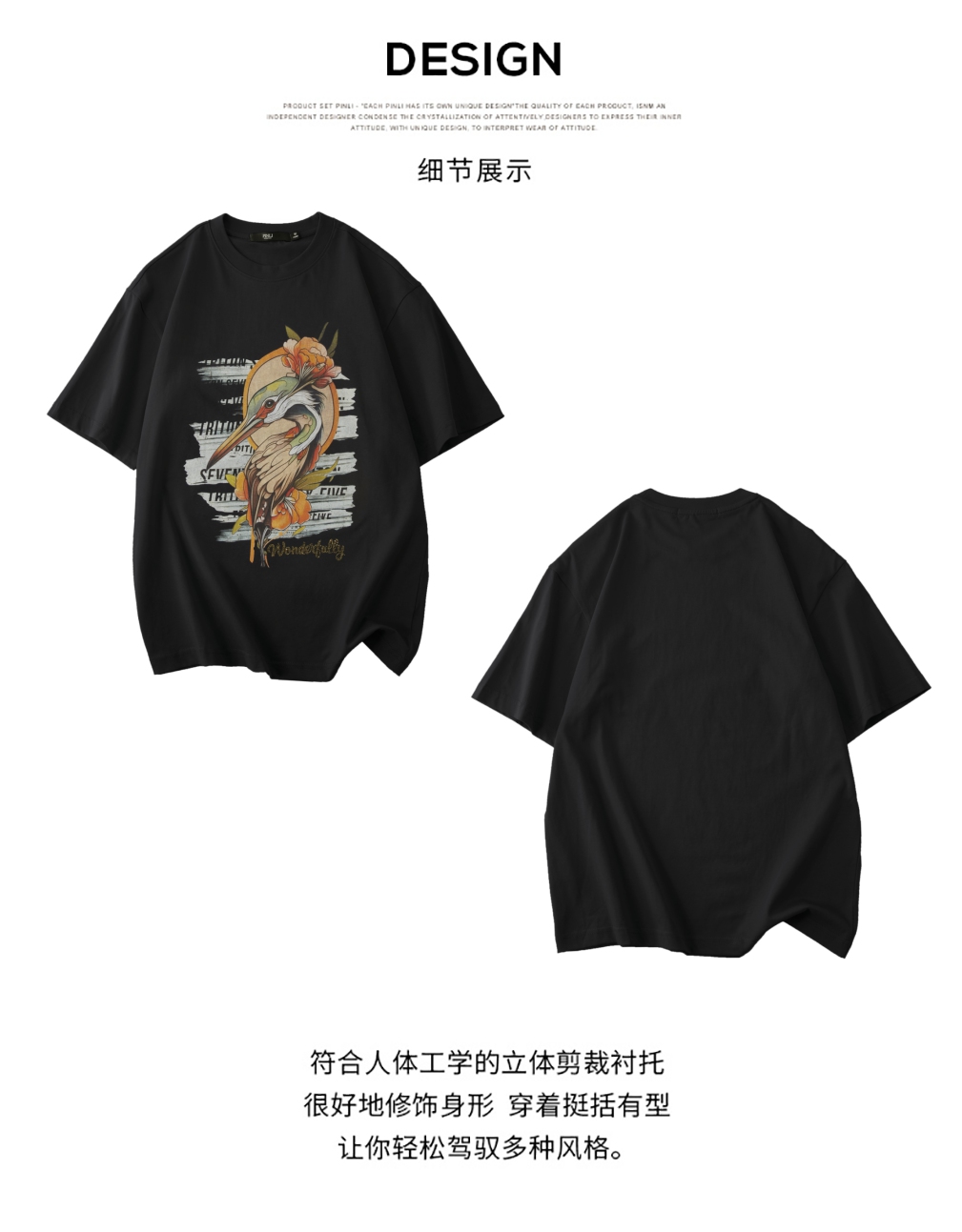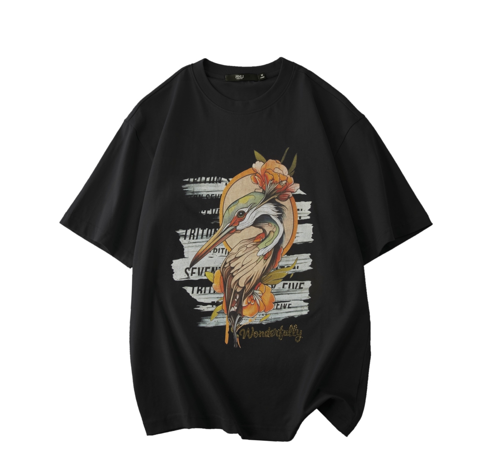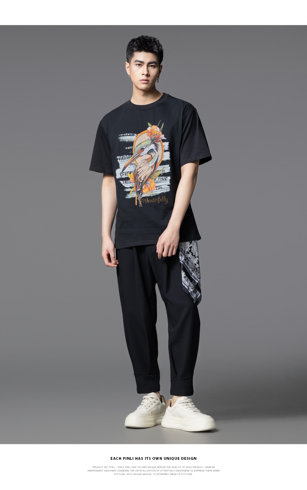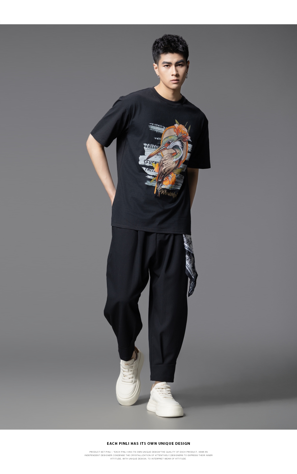PINLI品立2025夏季新款动物印花烫钻短袖T恤男休闲圆领体恤衫上衣BG252111030