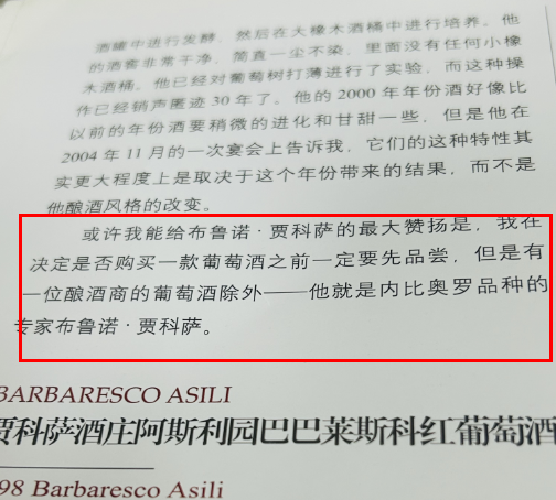 罗伯特·帕克(Robert Parker)曾在其著作《世界葡萄酒及酒庄全书》中评价道:“我在决定是否购买一款葡萄酒之前一定要先品尝,但是有一家酿酒商的葡萄酒除外——他就是内比奥罗品种的专家布鲁诺·贾(嘉)科萨。”