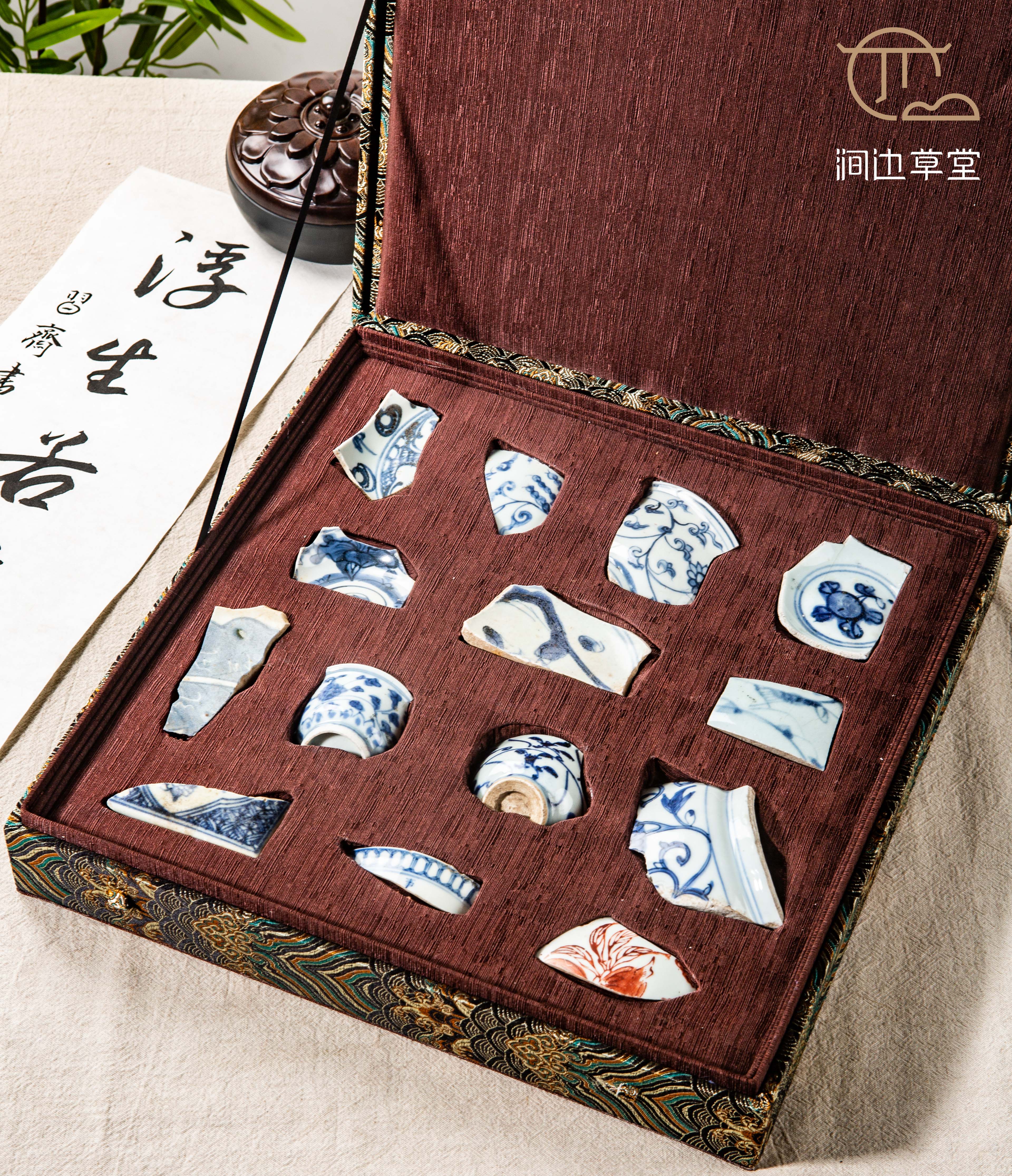 明清青花瓷标本全套,一套14片,分别是:明永宣时期花卉纹、明成弘时期葡萄纹、明正德时期缠枝莲、明嘉万时期折枝花、明天启时期茶花纹、明崇祯时期山水人物、明空白期鱼纹、清顺治时期青花留白、清康熙时期青花瓷片、清雍正时期青花瓷片、清乾隆时期缠枝花、清嘉道时期青花盖残片、清同光时期文字片、民国时期福寿纹,是学习明清瓷器的优良范本,配有高档锦盒,同时也是收藏佳品。