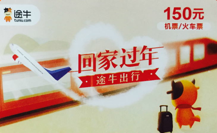 宝贝四:途牛出行心意卡(兑换价值150元途牛机票/火车票优惠劵)