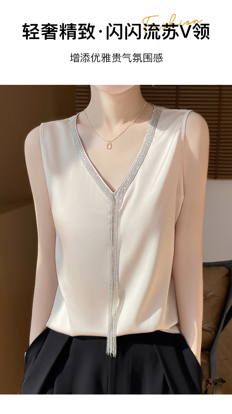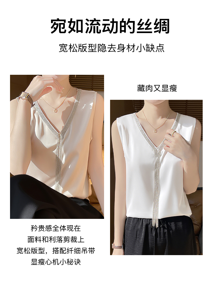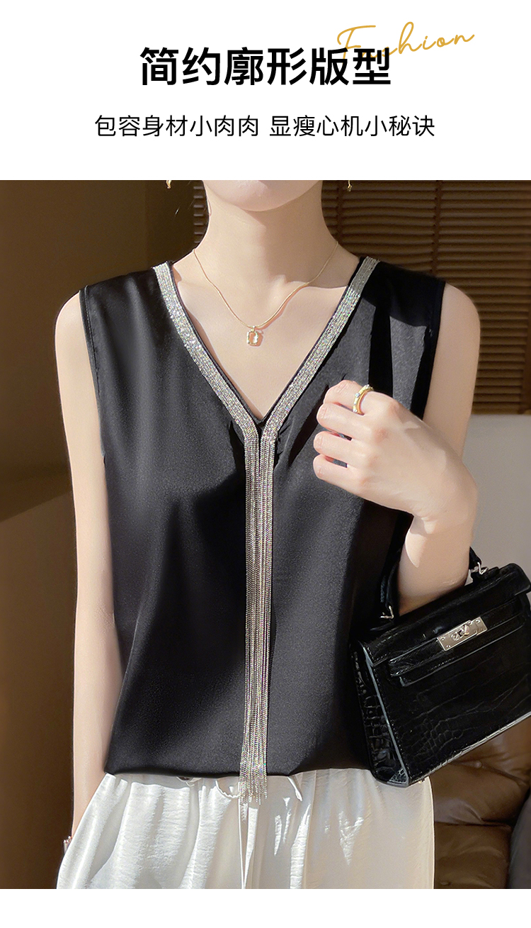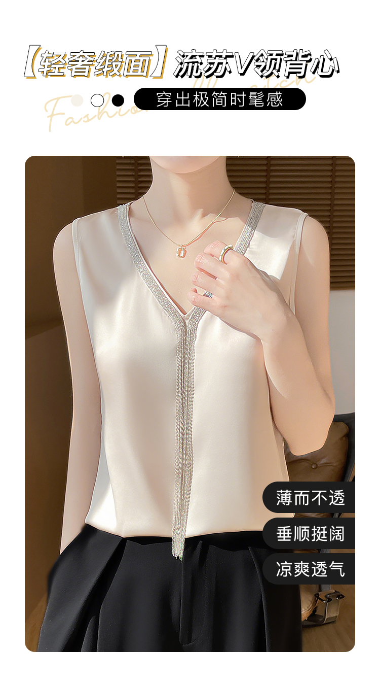 夏季薄款仿真丝高级感西装内搭轻奢缎面V领水钻背心女宽松显瘦A68流苏背心