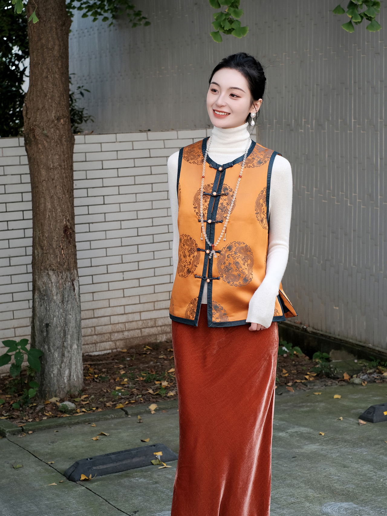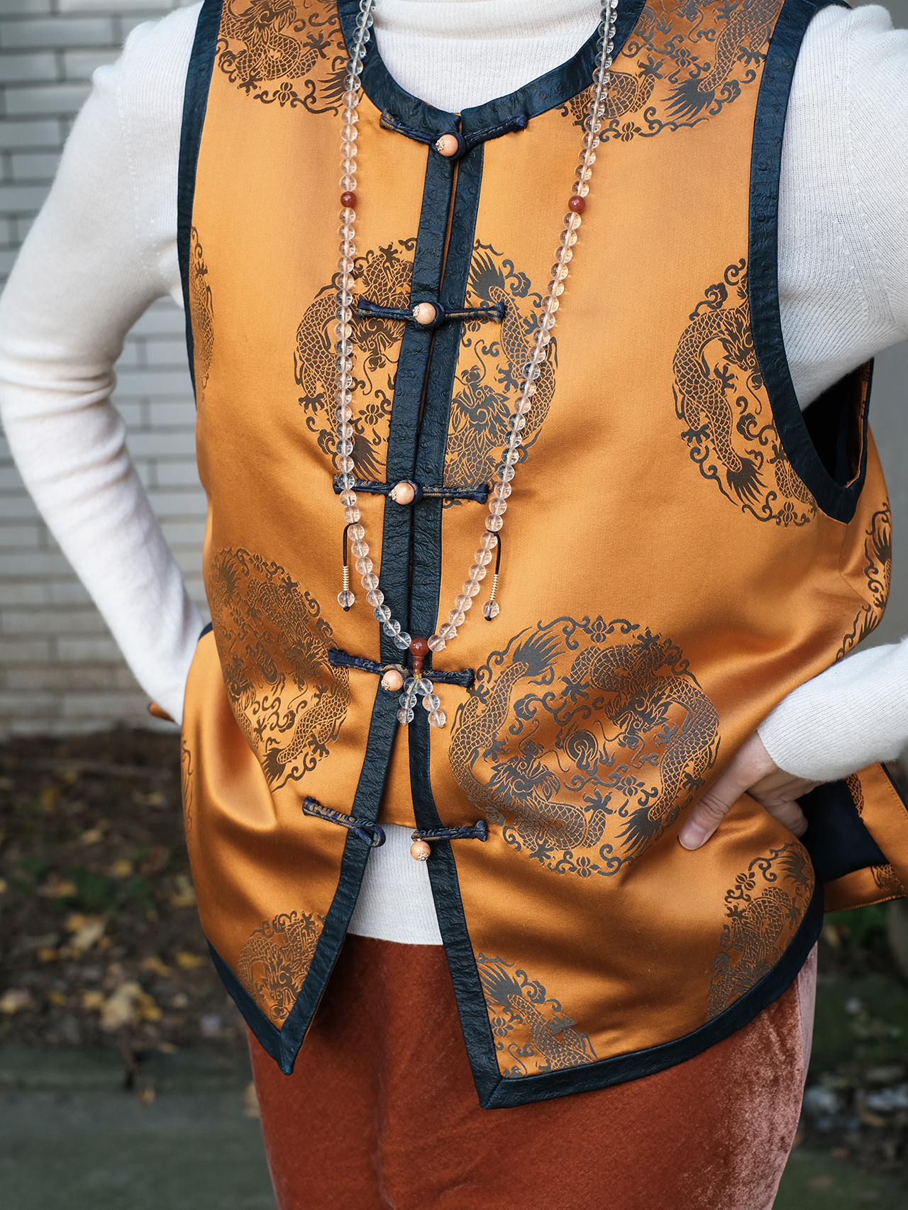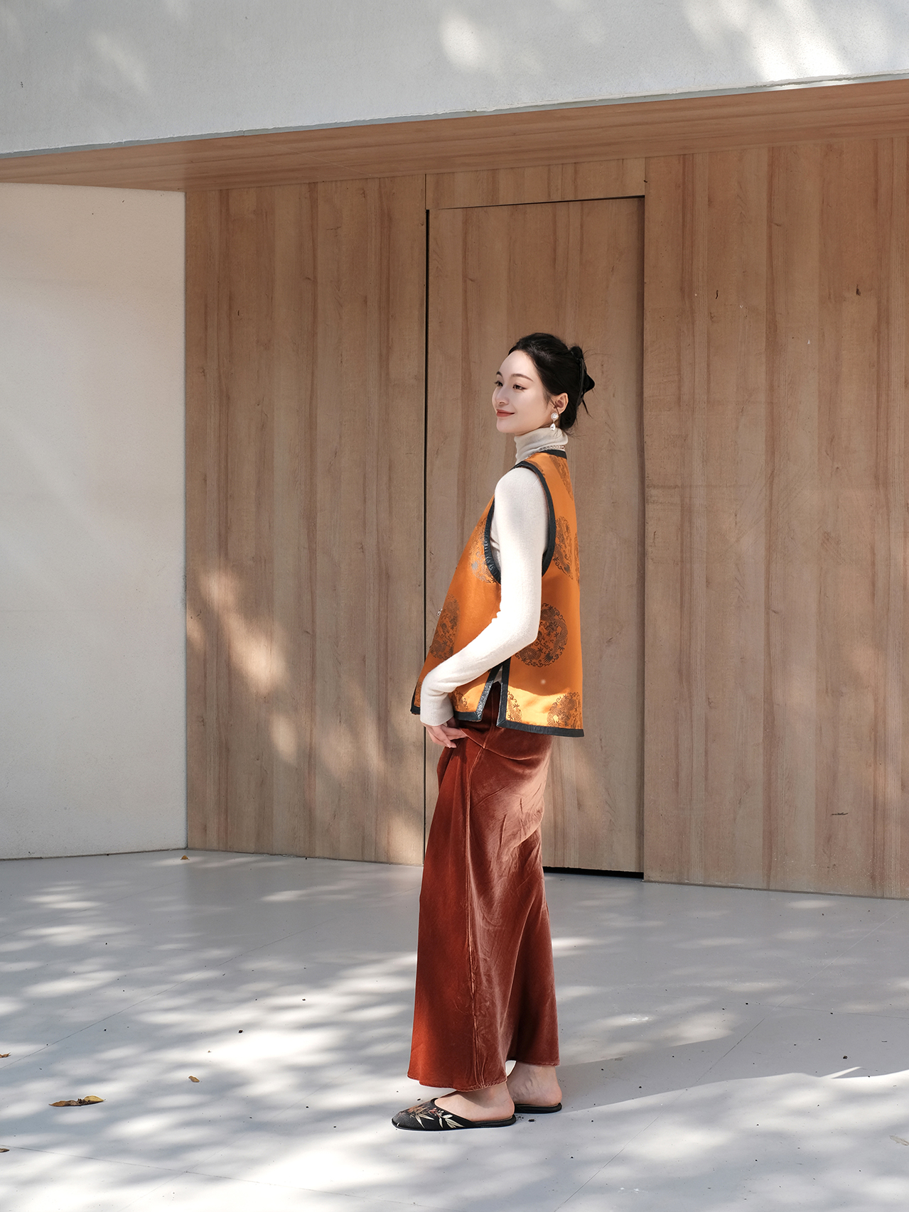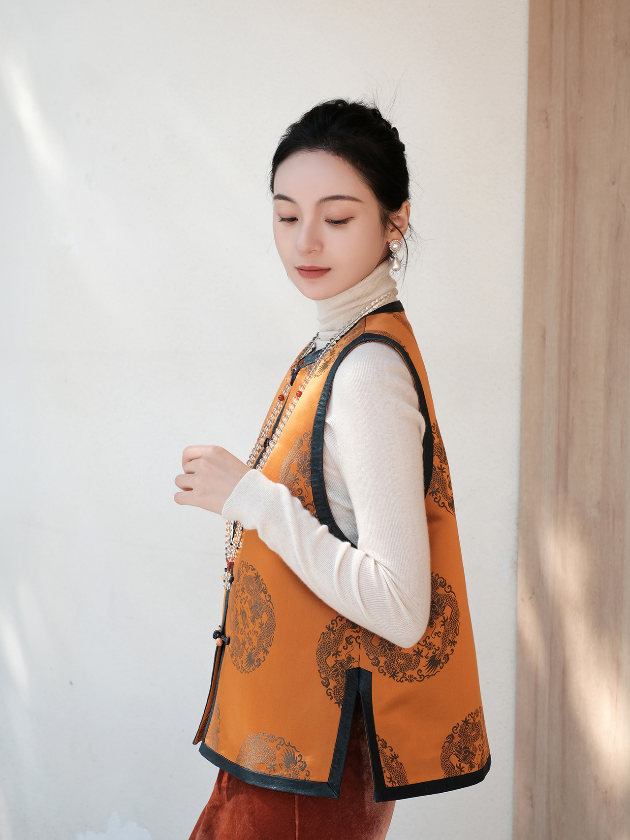 盛唐婧| 新中式库缎拼绵羊皮对襟马甲
