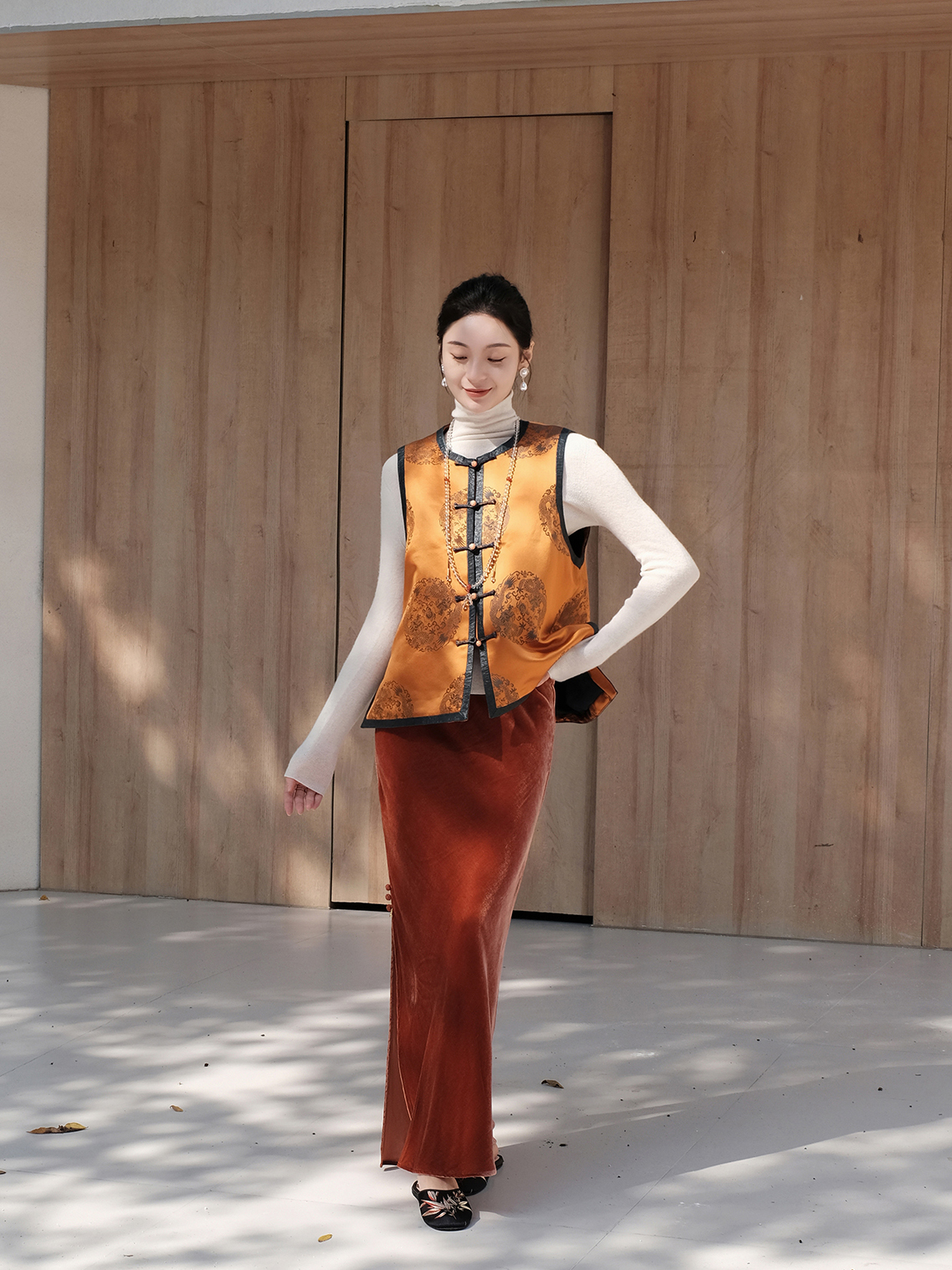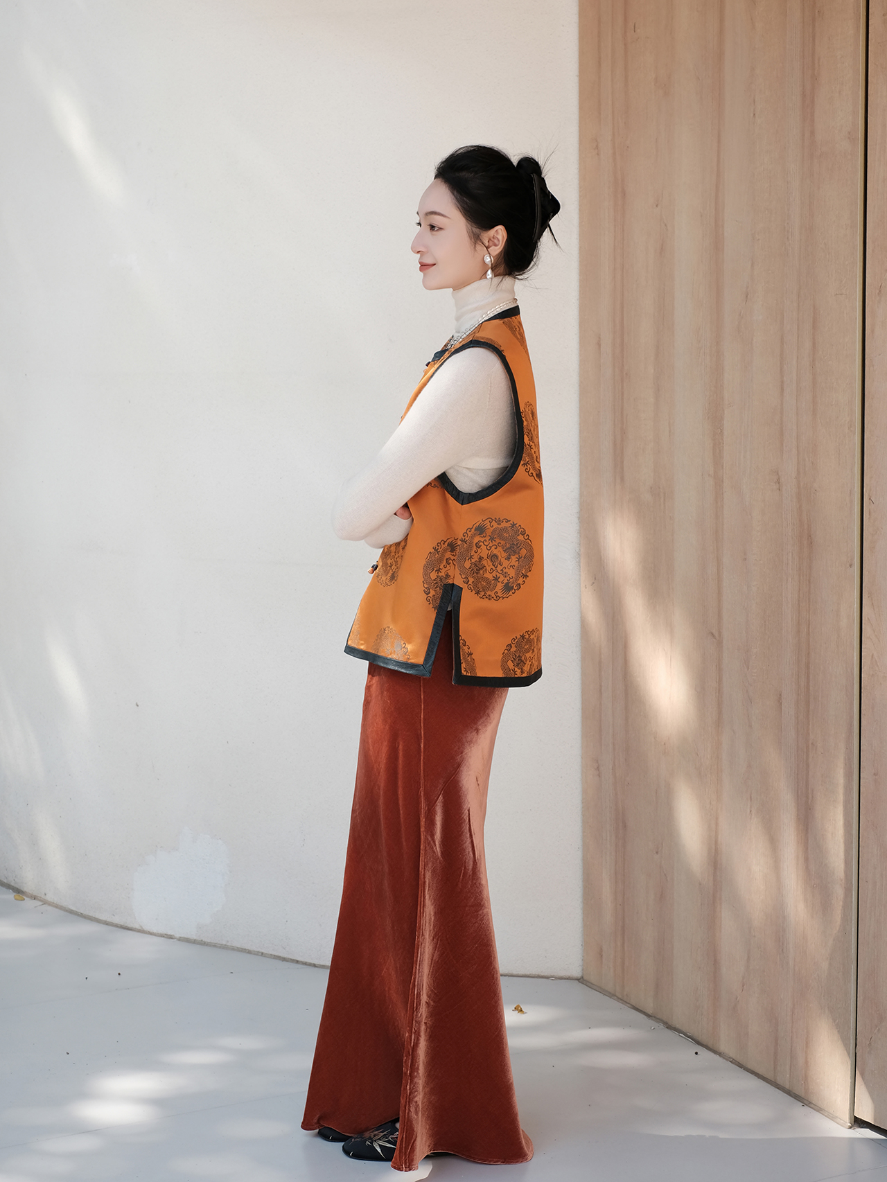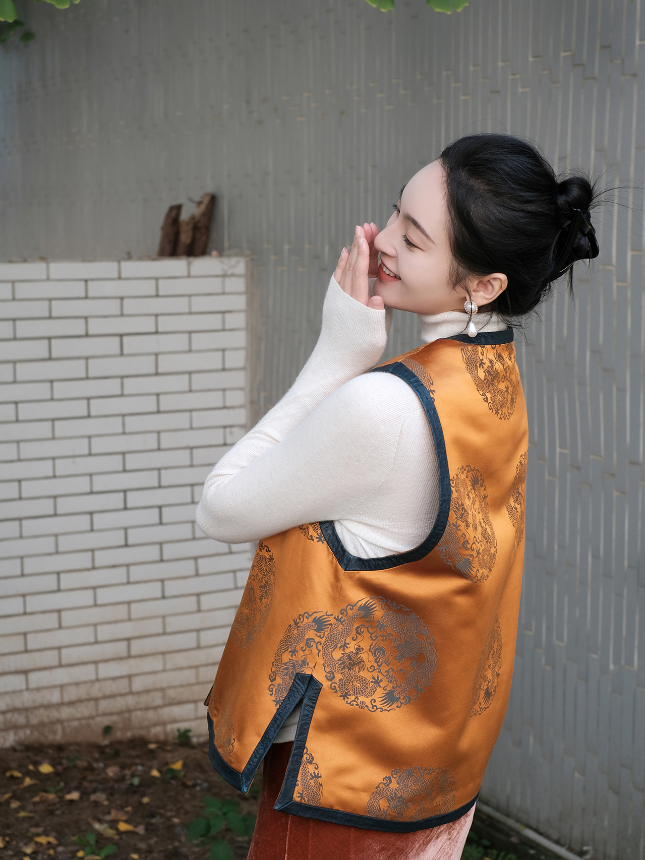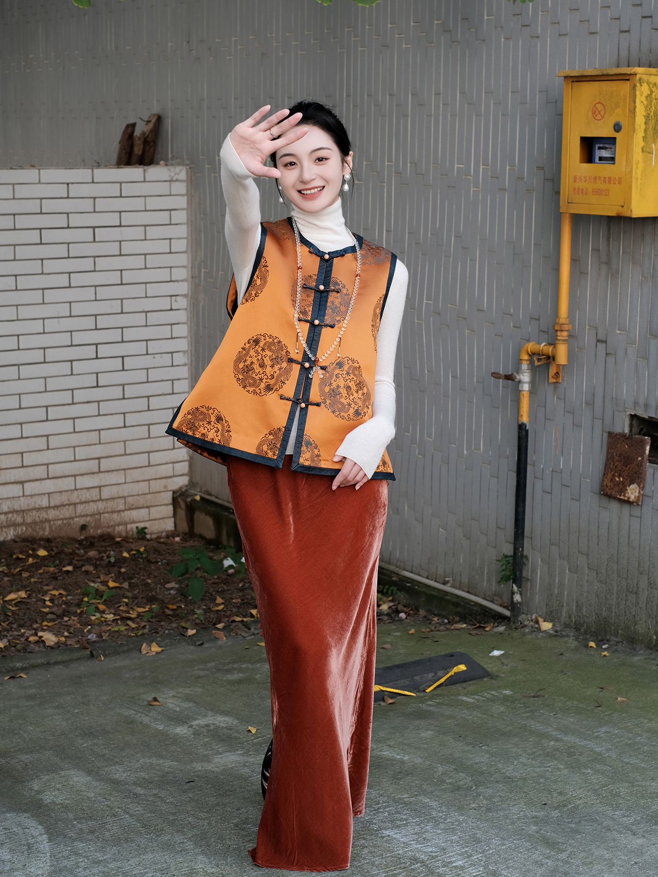 盛唐婧| 新中式库缎拼绵羊皮对襟马甲