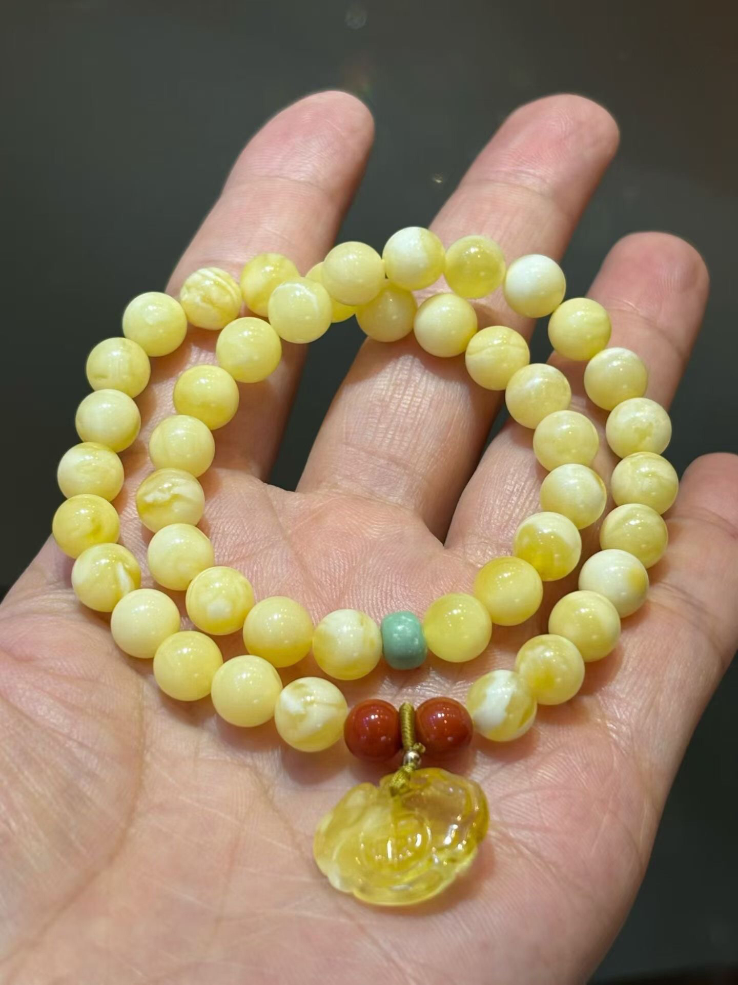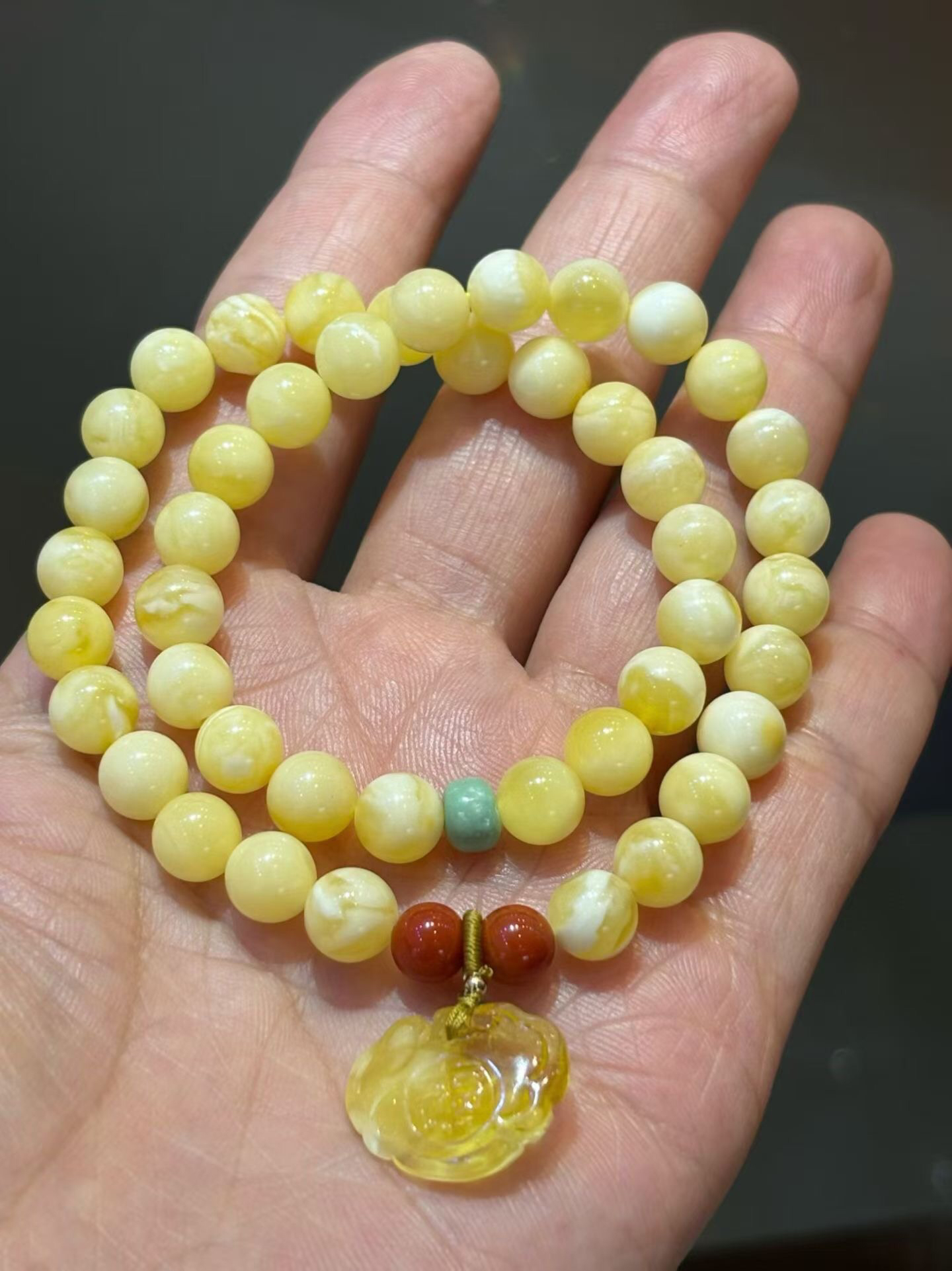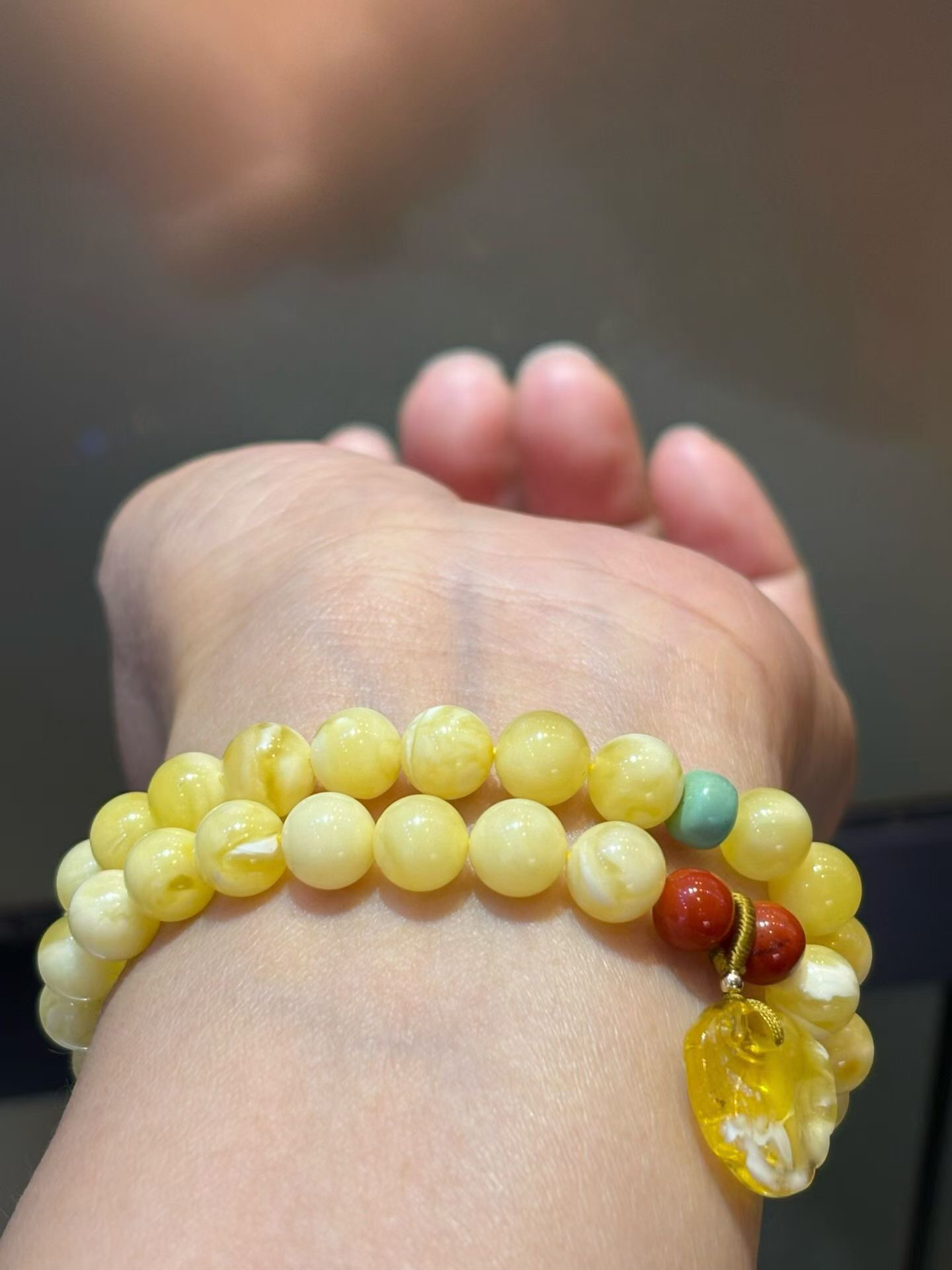 俄料白花蜡蜜蜡2圈手链,蜡质浓郁,纹理清晰明了,搭配原矿绿松,南红,蜜蜡小如意,佩戴精致好看!