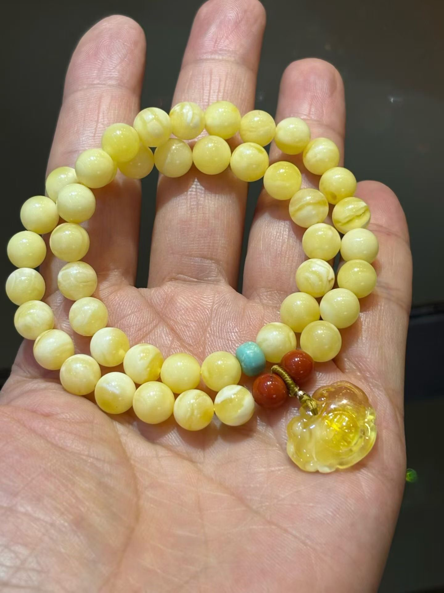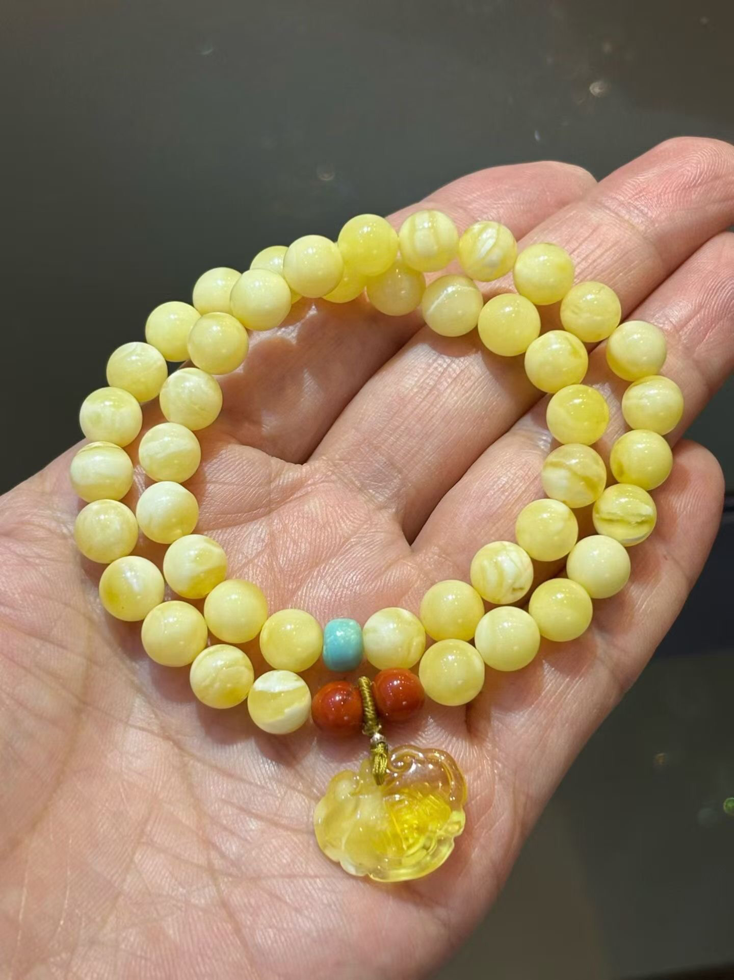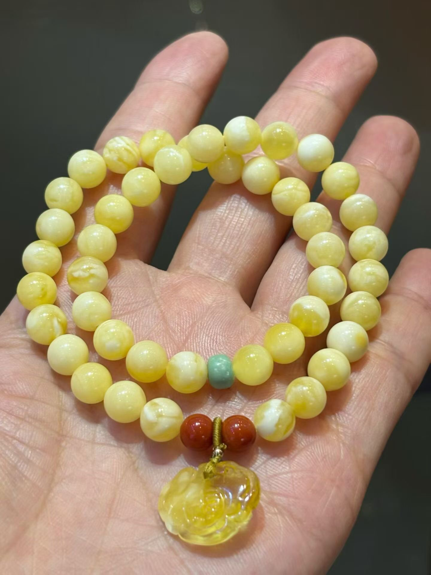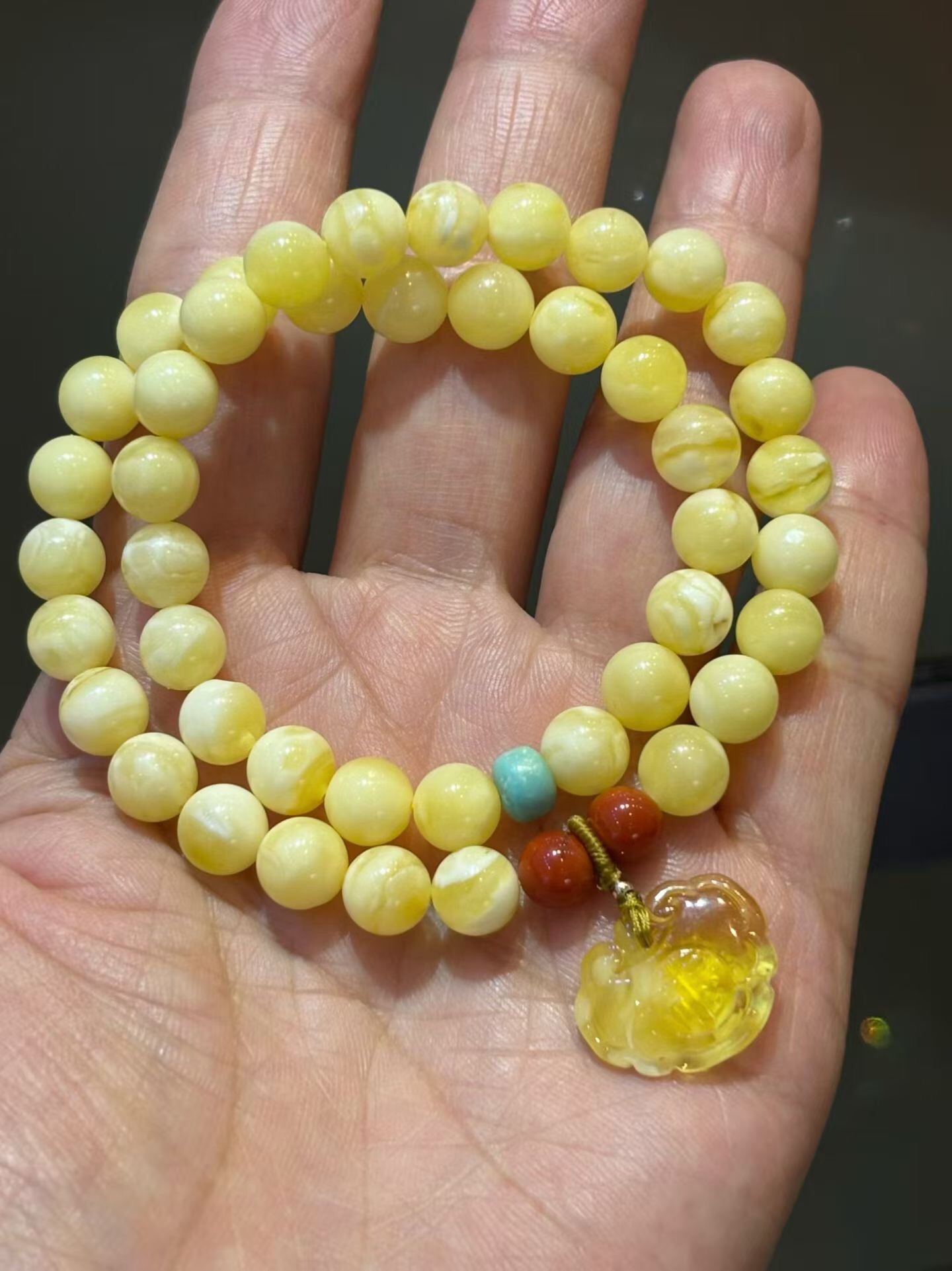 俄料白花蜡蜜蜡2圈手链,蜡质浓郁,纹理清晰明了,搭配原矿绿松,南红,蜜蜡小如意,佩戴精致好看!