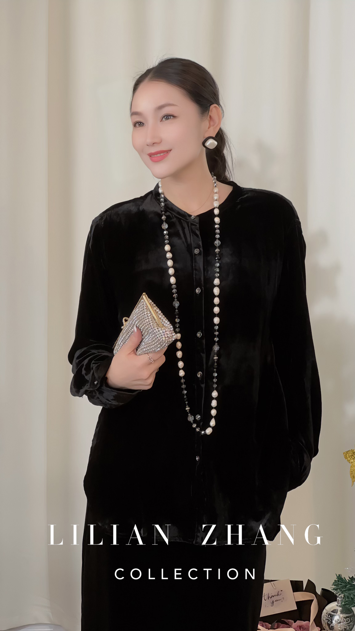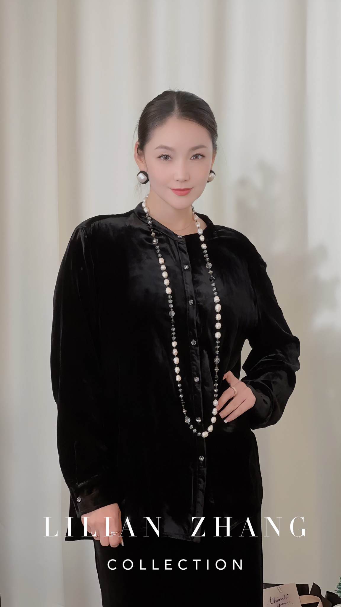 LILIAN ZHANG——定制、法式复古优雅丝绒纽扣气质黑色上衣 2402028