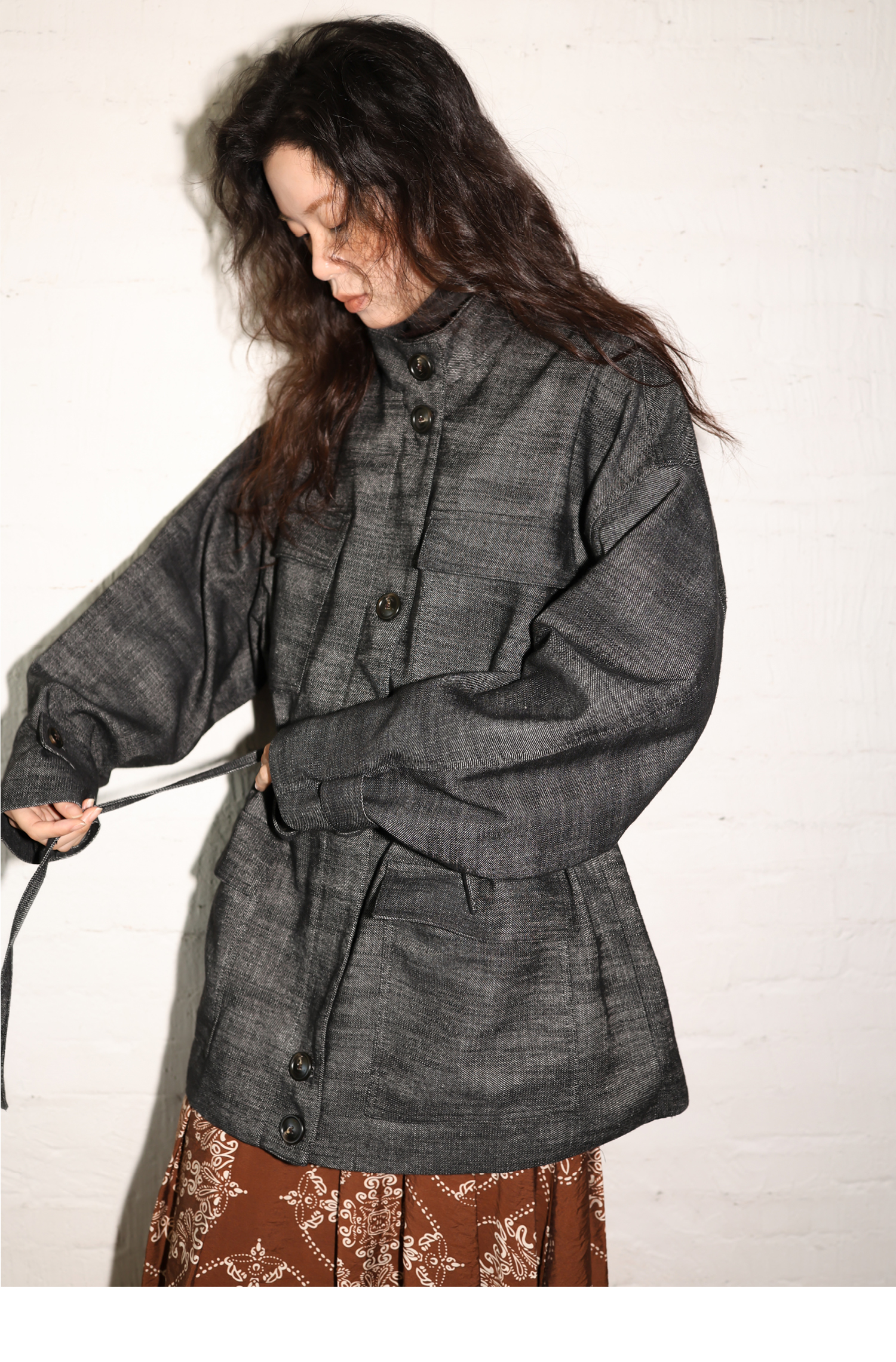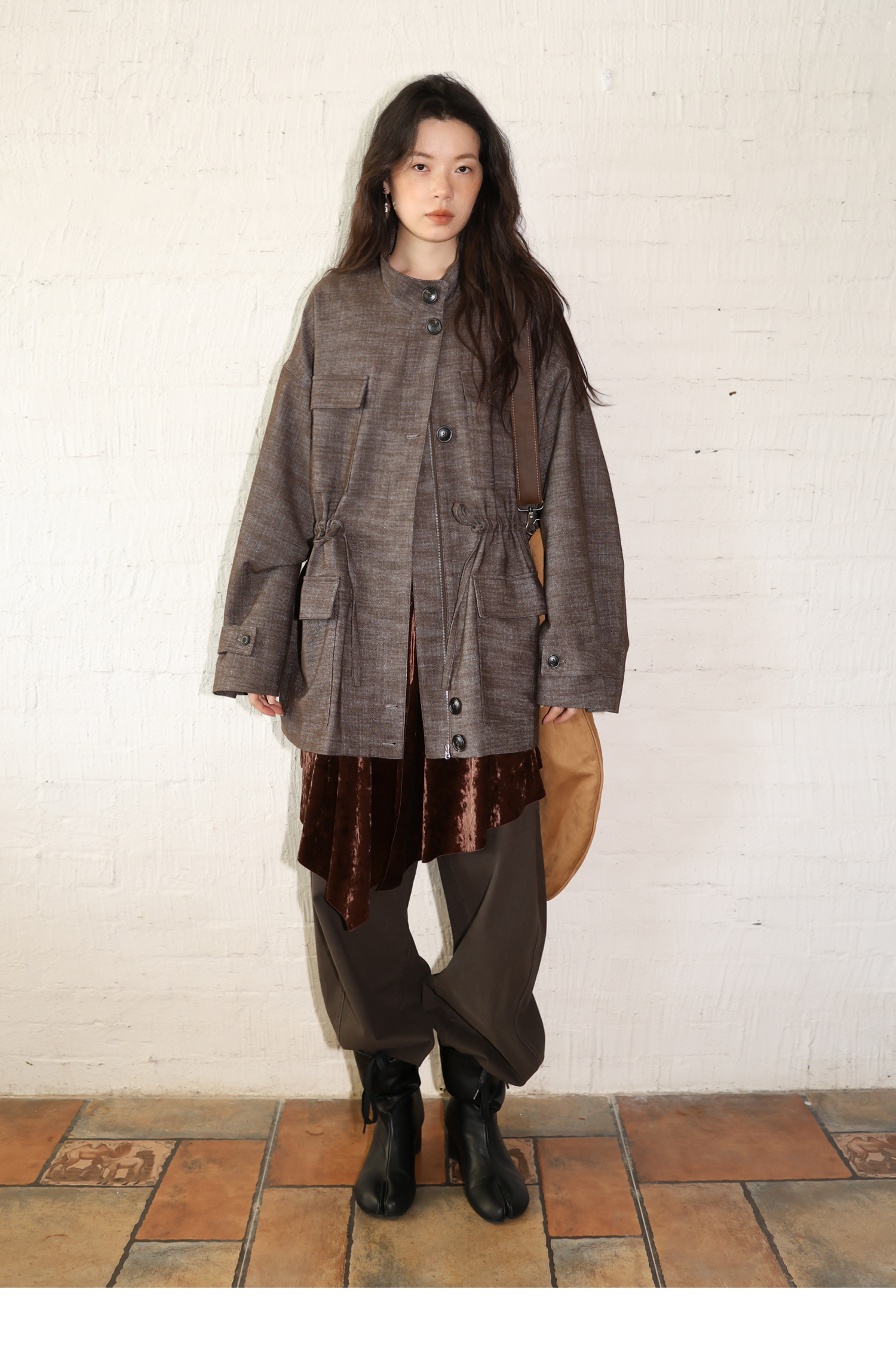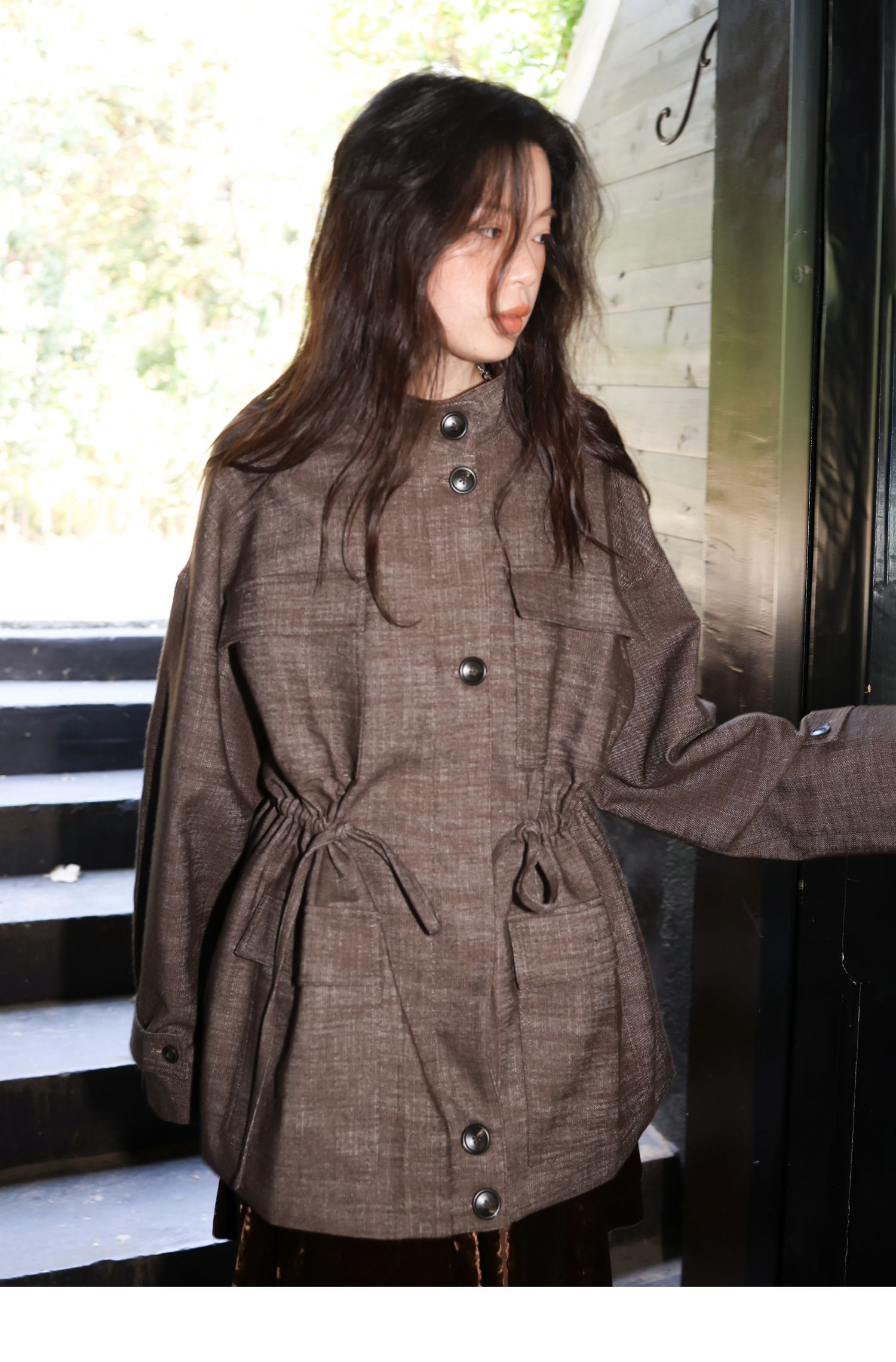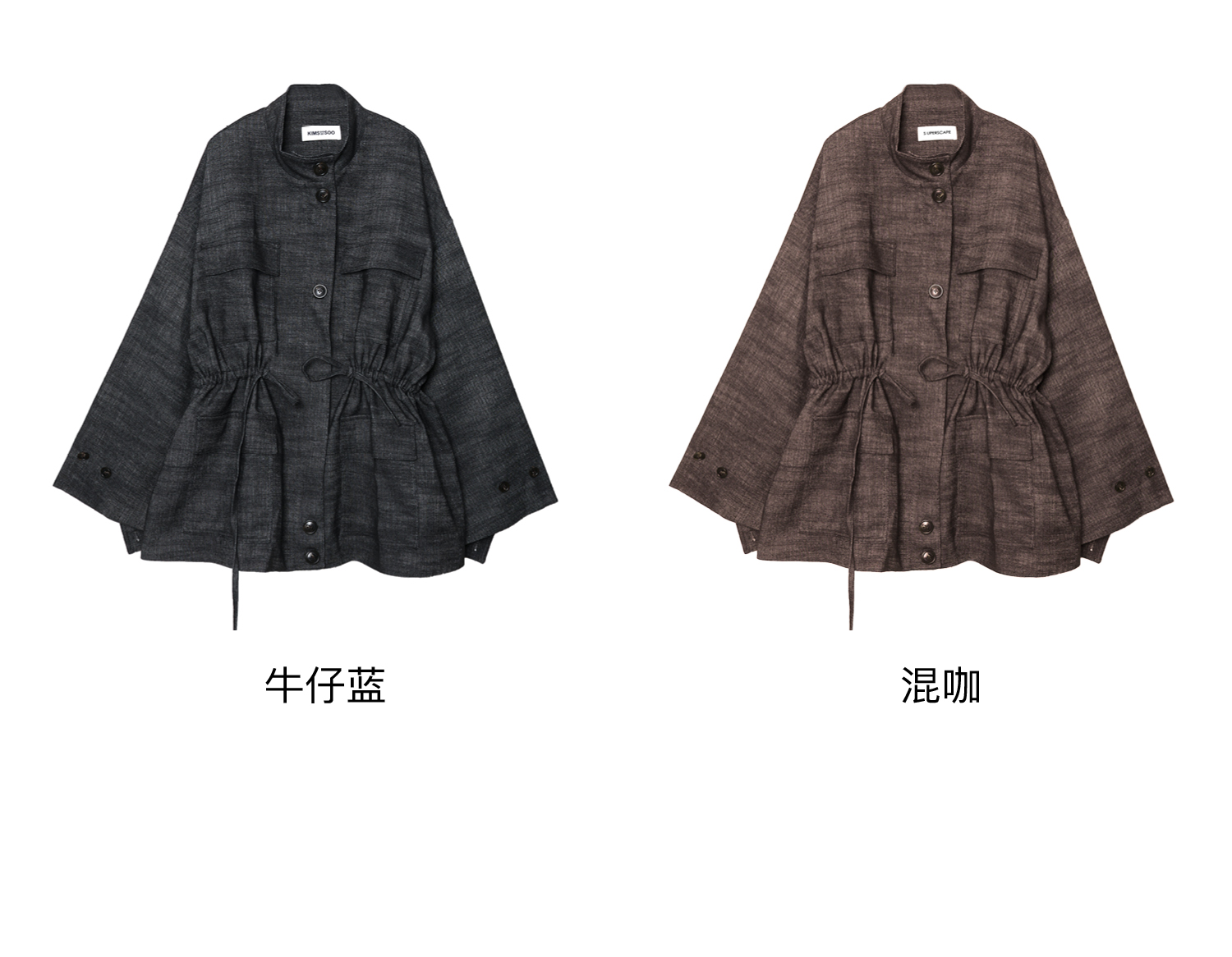 素舶 亚麻棉混纺肌理感立领工装大口袋抽绳短风衣夹克外套