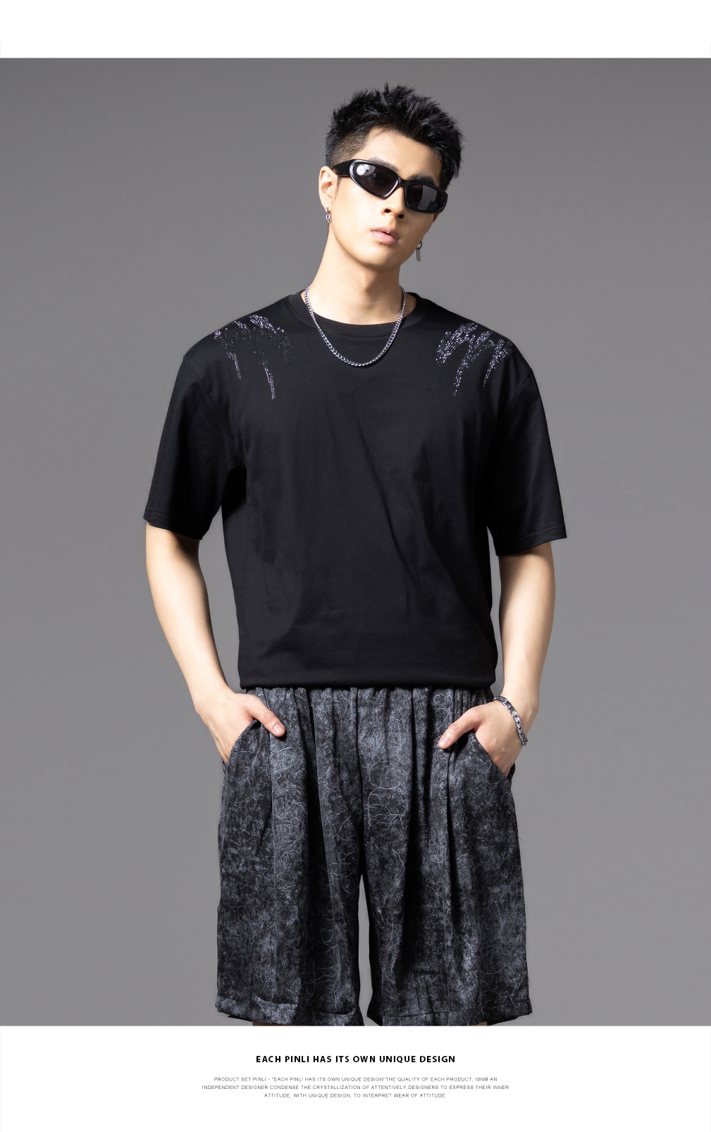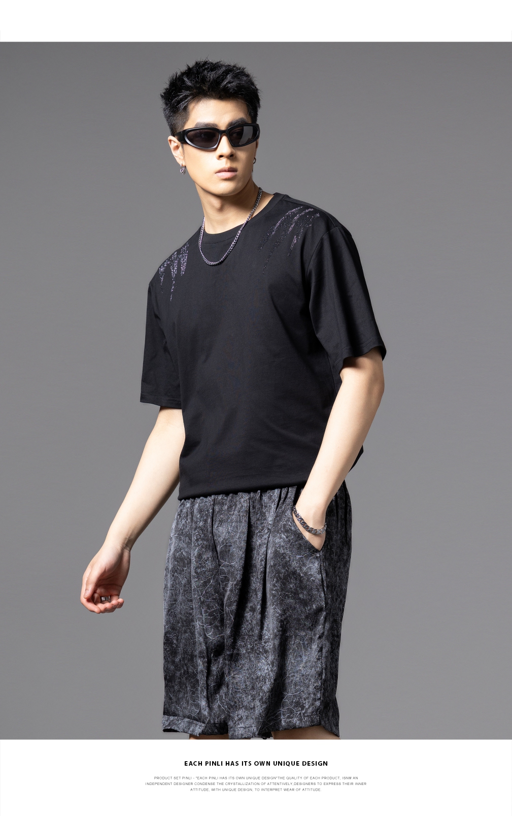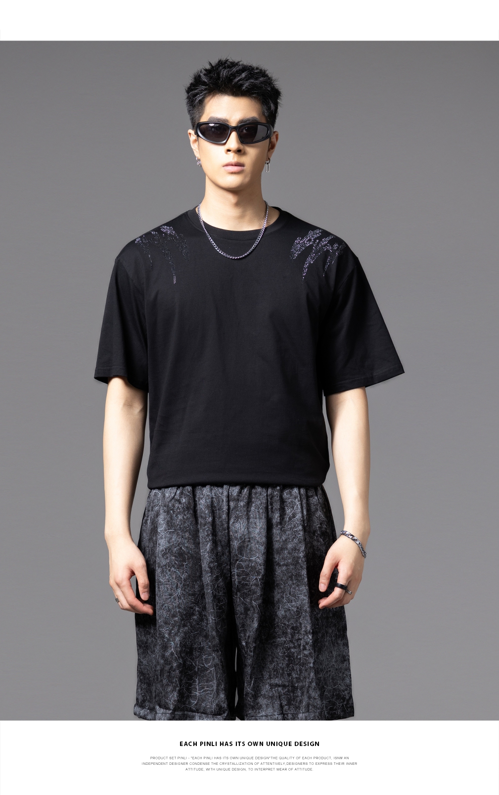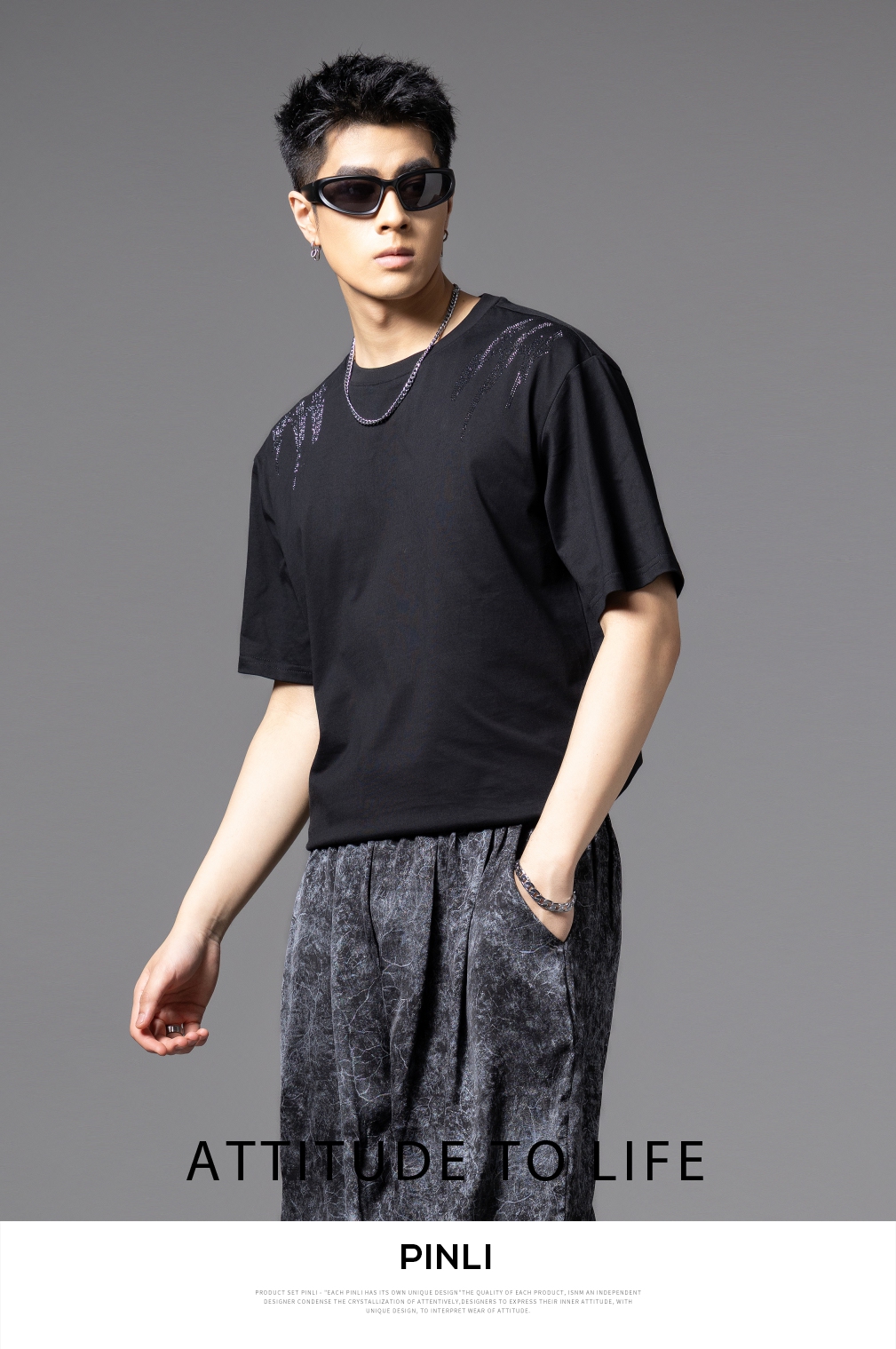 PINLI品立2025春夏新款男士圆领抓痕烫钻短袖T恤潮牌百搭半袖上衣BG252111010