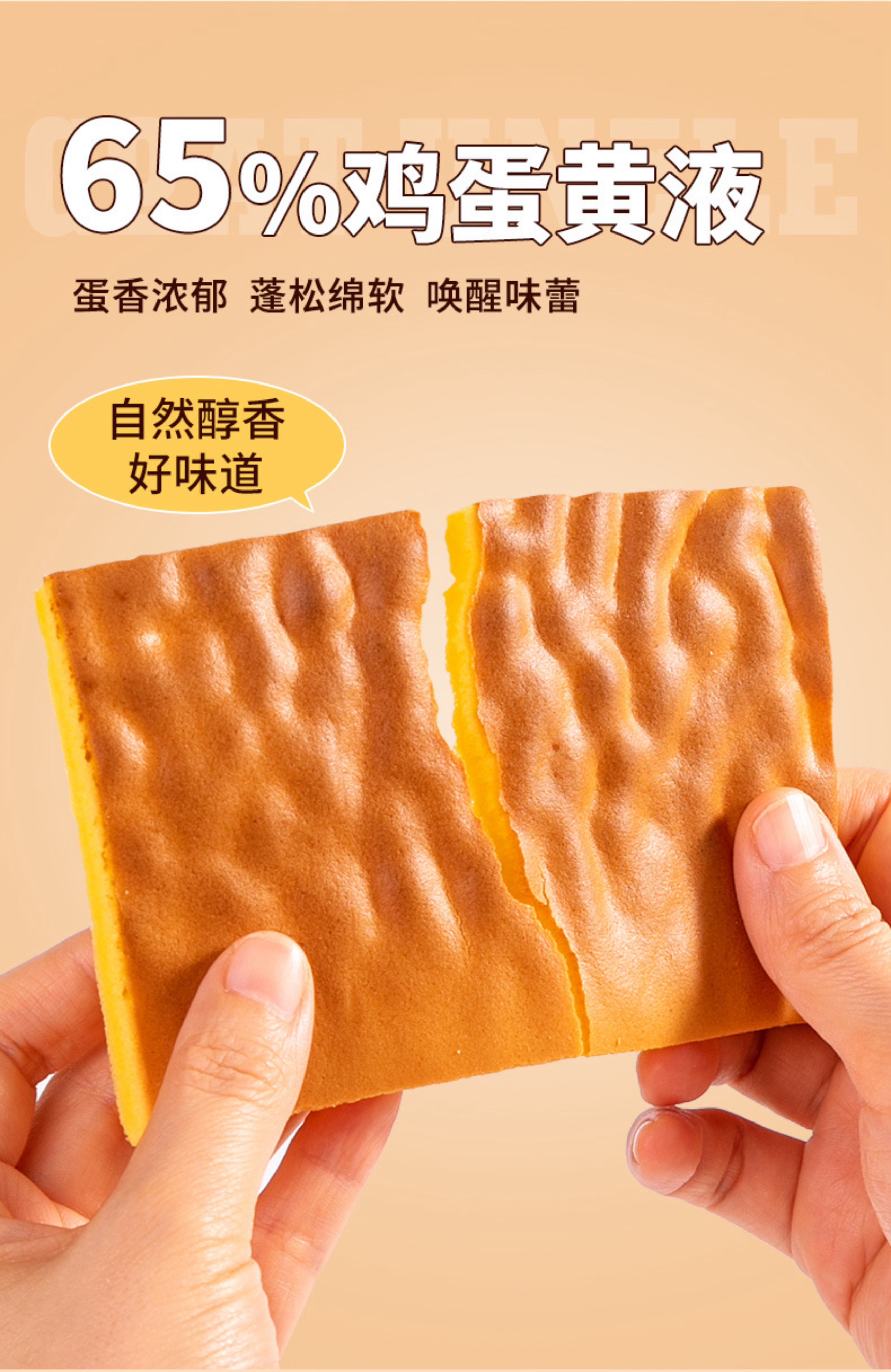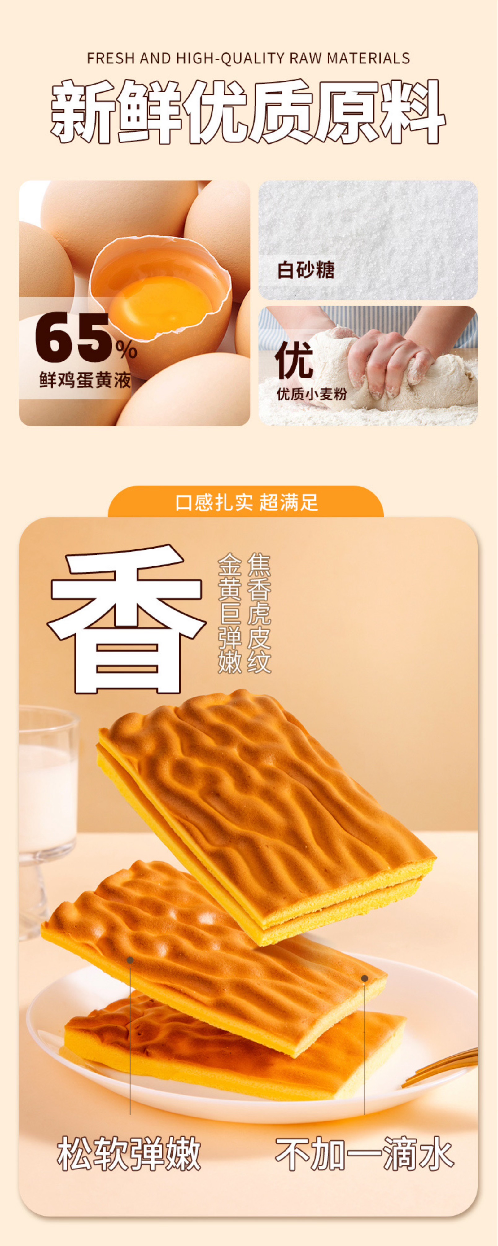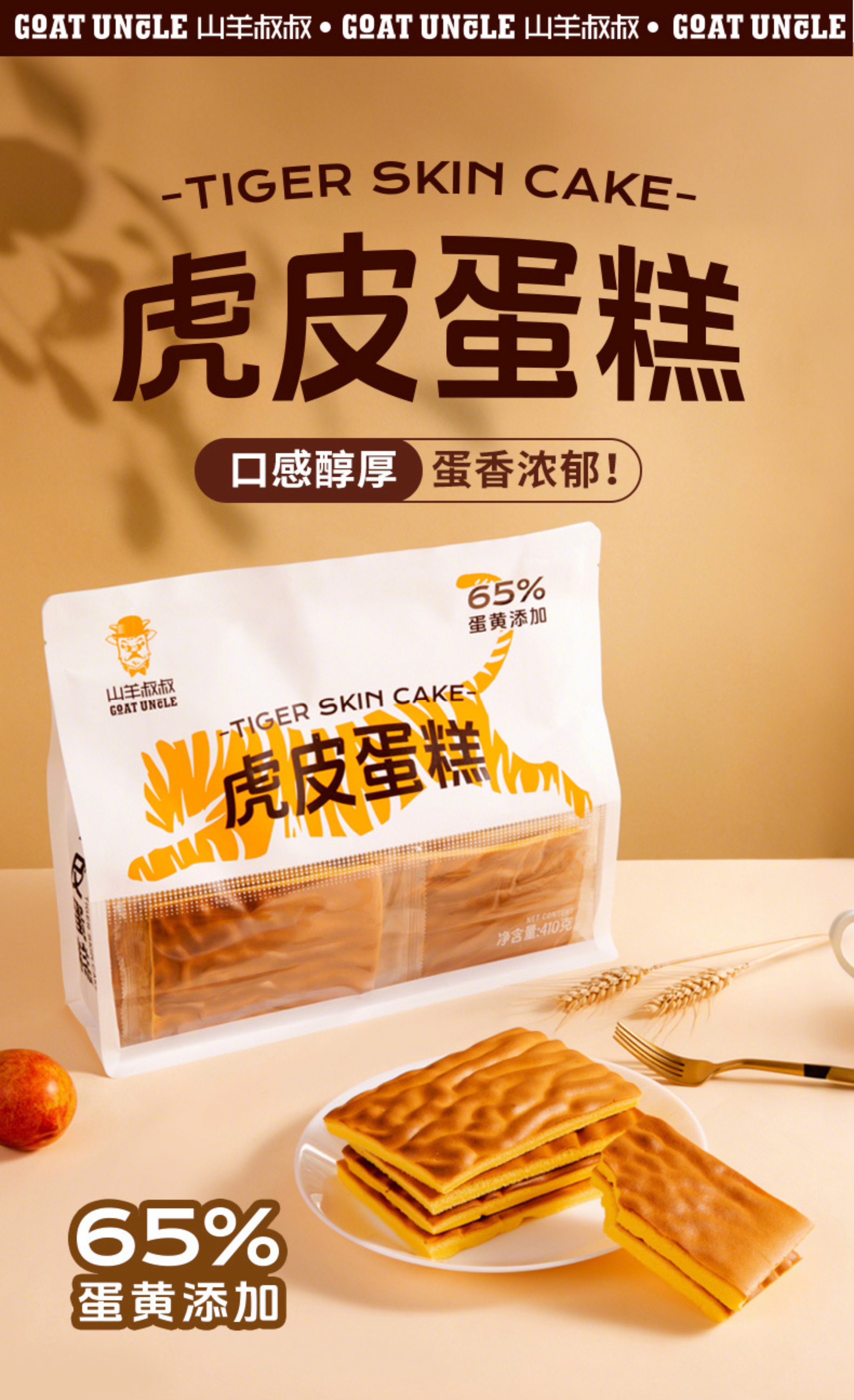 山羊叔叔虎皮蛋糕坚持选用新鲜优质原料,只为让每一口都萦绕着自然醇香。它的主要成分中,鲜鸡蛋黄液占比高达65%,再搭配白砂糖与优质小麦粉,从源头奠定了扎实的口感基底。更以先进烘焙技术加持,全程不加水的配方,最大程度锁住鸡蛋的浓醇香气;精准把控烘焙时间与温度,让蛋糕呈现出松软弹嫩、入口即化的绝佳口感;而独特的工艺更让蛋糕表面自然形成焦香诱人的虎皮纹路,从视觉到味觉都带来双重享受!