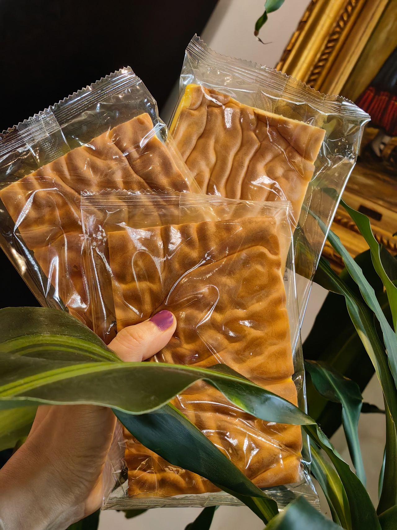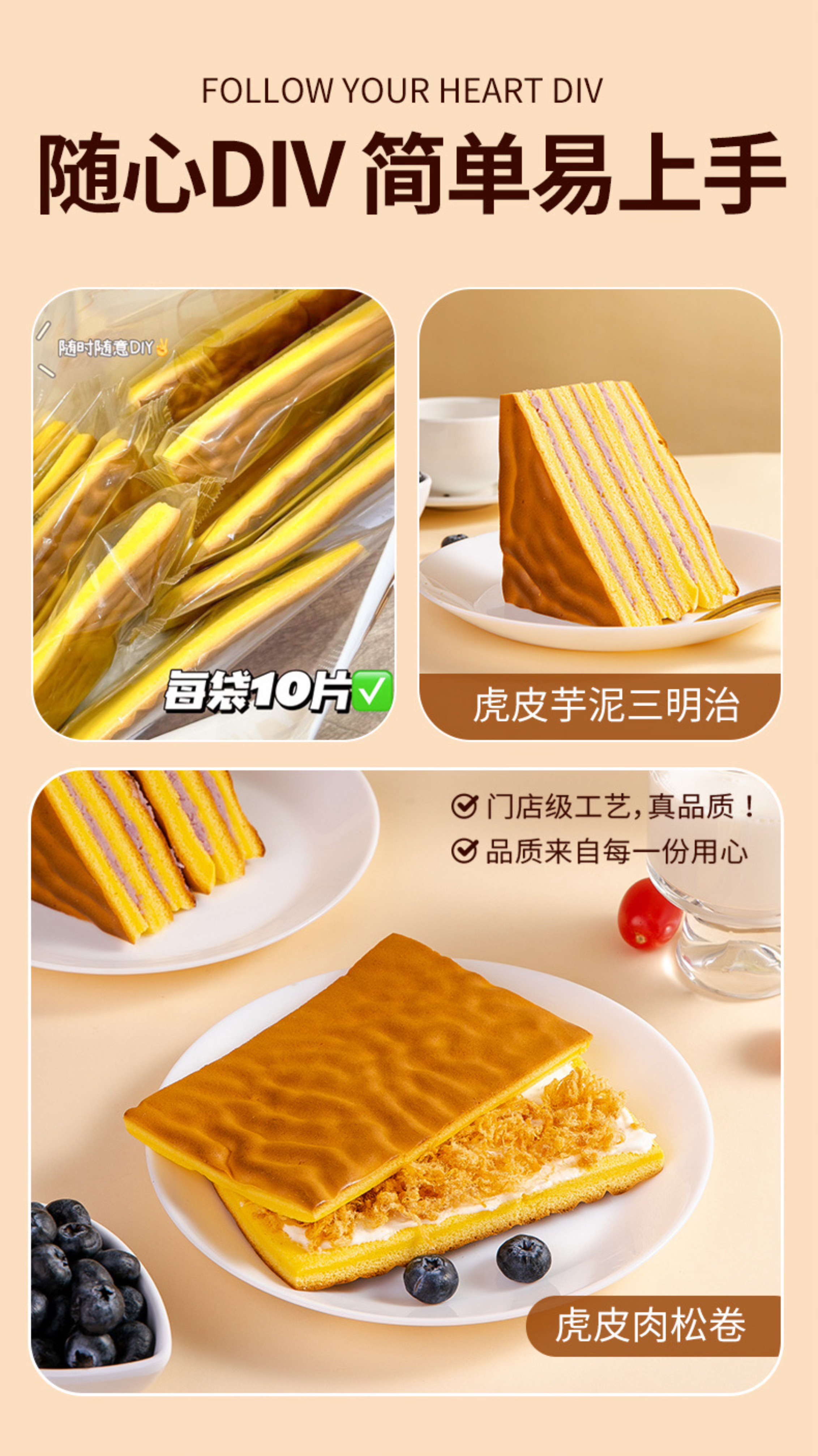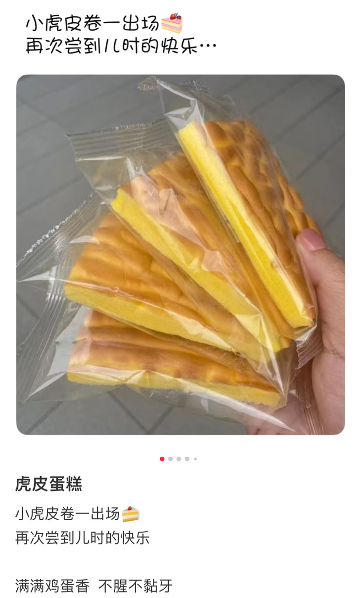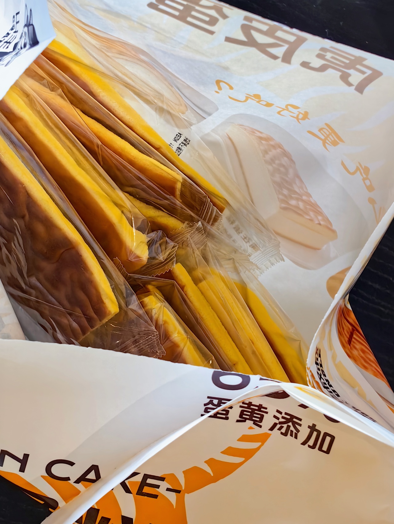 撕开大袋子,10片裹着透明外衣的小蛋糕整整齐齐。拆开一片,指尖先触到蛋糕体的松软,送进嘴里轻轻一抿,浓郁的鸡蛋香瞬间在舌尖炸开。最妙的是那层虎皮,比普通蛋糕多了几分韧劲,还带着微焦的甜,弹牙又绵密,两种口感在嘴里层层叠叠,甜度也拿捏得刚刚好,一点不会腻!赶时间时塞两片在包里,配上热牛奶就是一顿满足的早餐,要是时间允许,还可以自己夹奶油夹水果,发挥小宇宙,定制独一无二的美食哦!