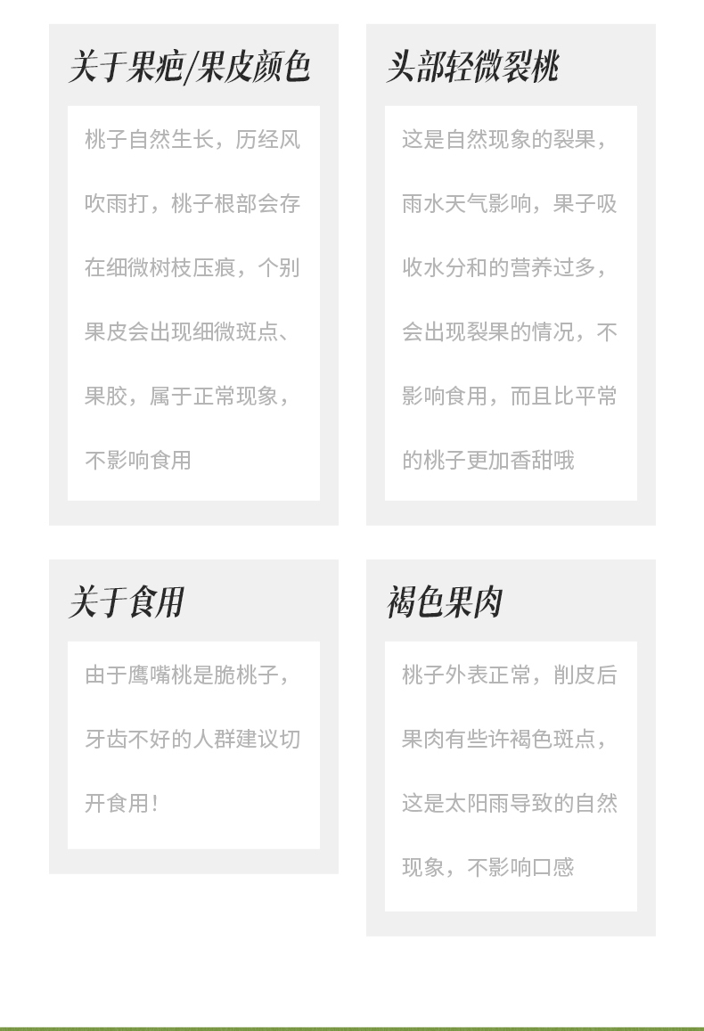 2、受雨水天气影响,部分鹰嘴桃出现头部轻微裂果情况,不影响食用,不在售后范围内,介意者慎拍!