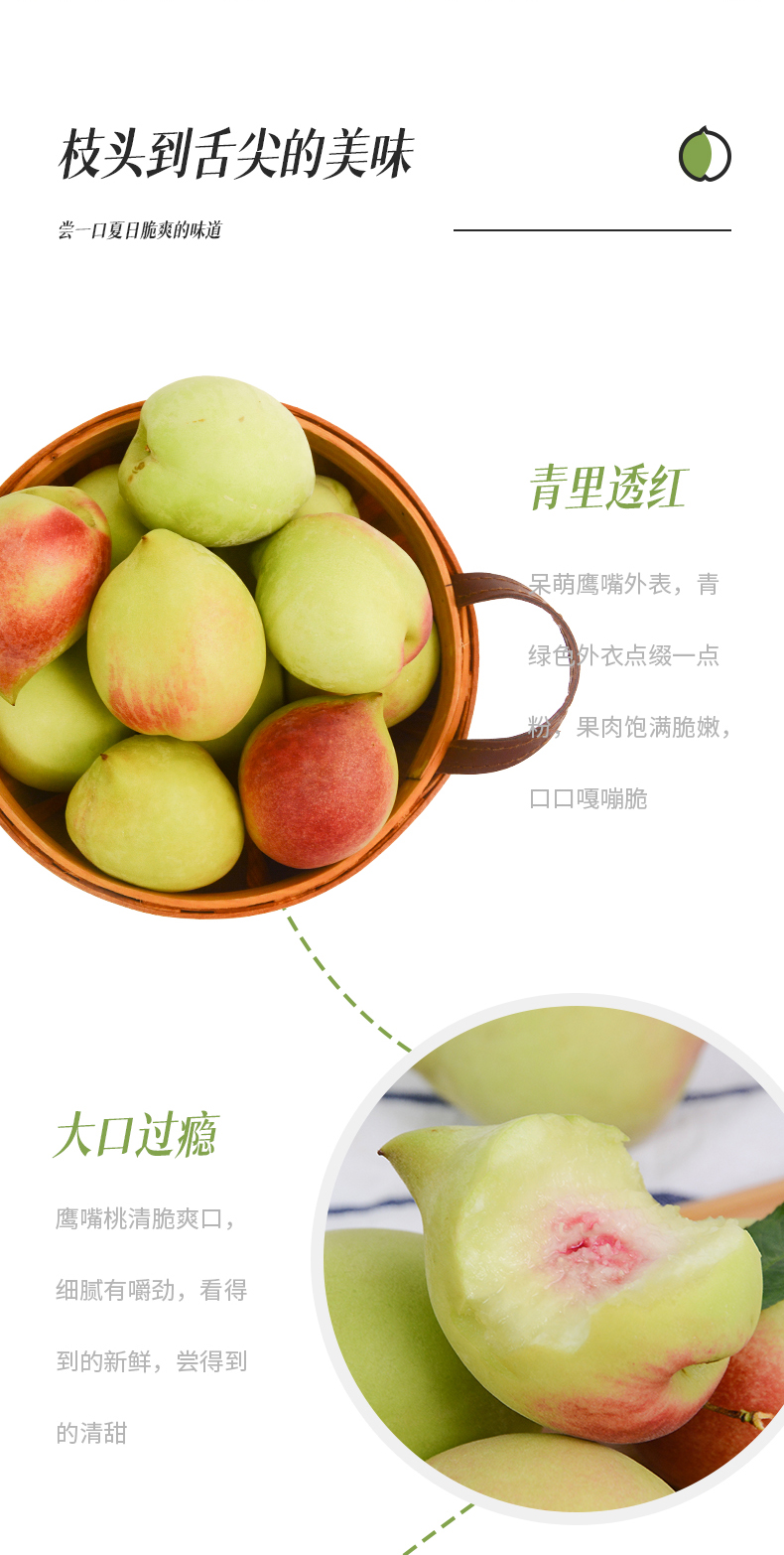1、鹰嘴桃属于脆桃,牙口不好的人可以切块食用,收到后先挑泛白的食用,颜色偏绿的可以放一放,口感甜嫩,两种都可以食用!
