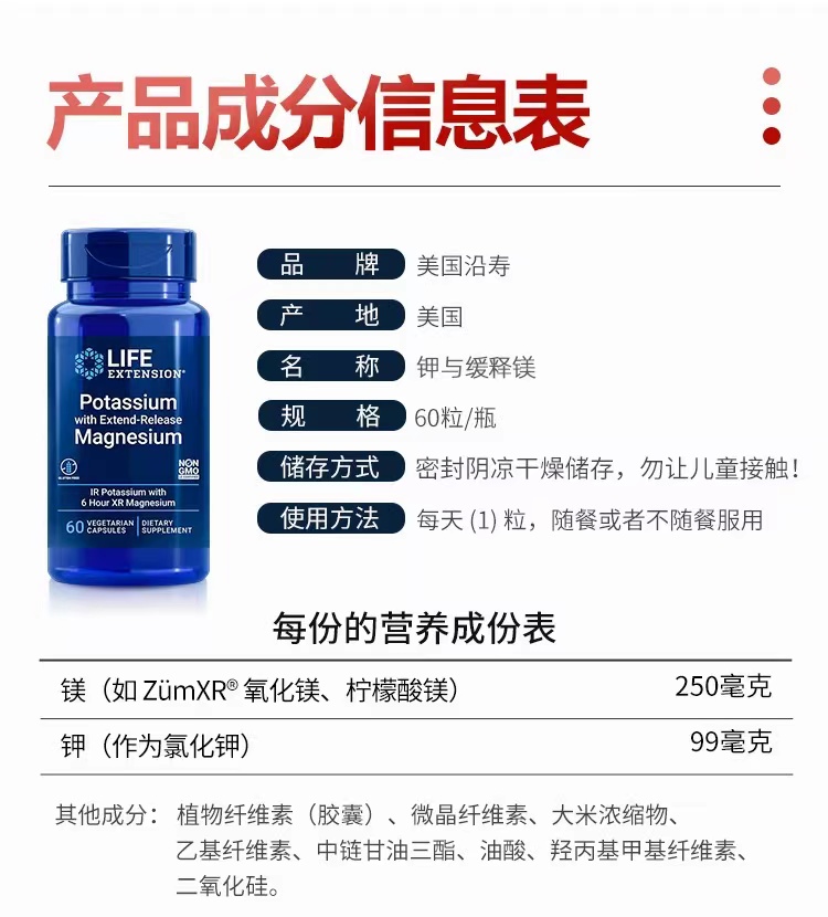 沿寿LIFE EXTENSION 钾与缓释镁素胶囊60粒|Potassium with Extend-Release Magnesium 60'