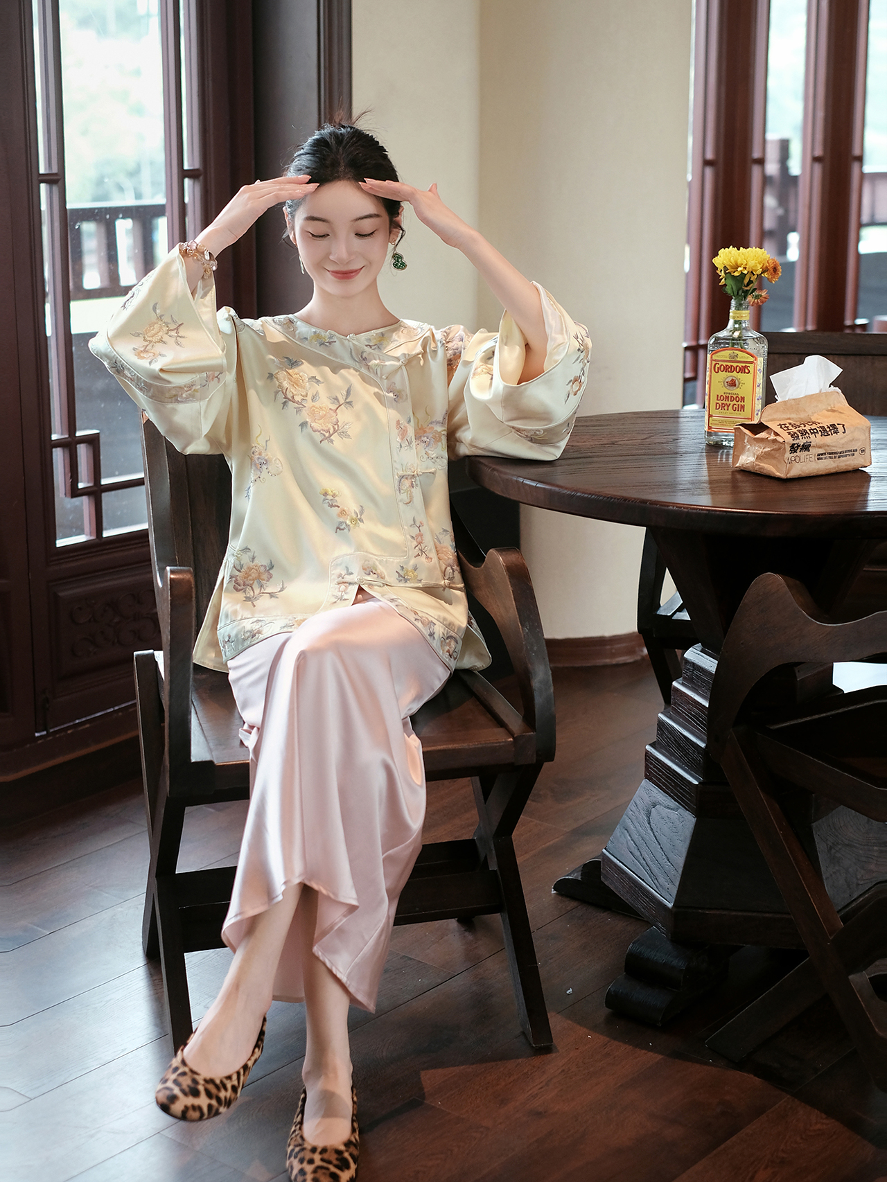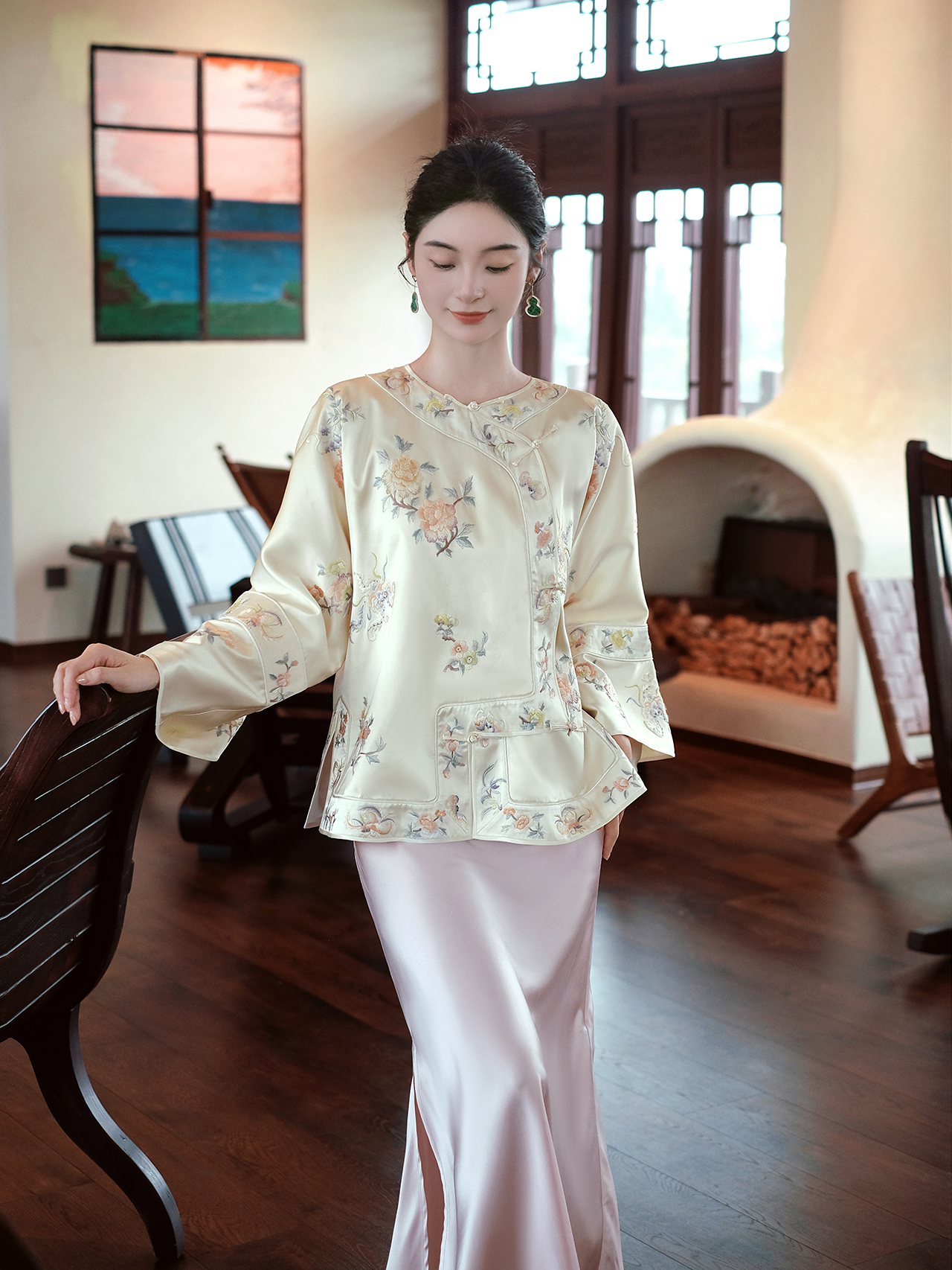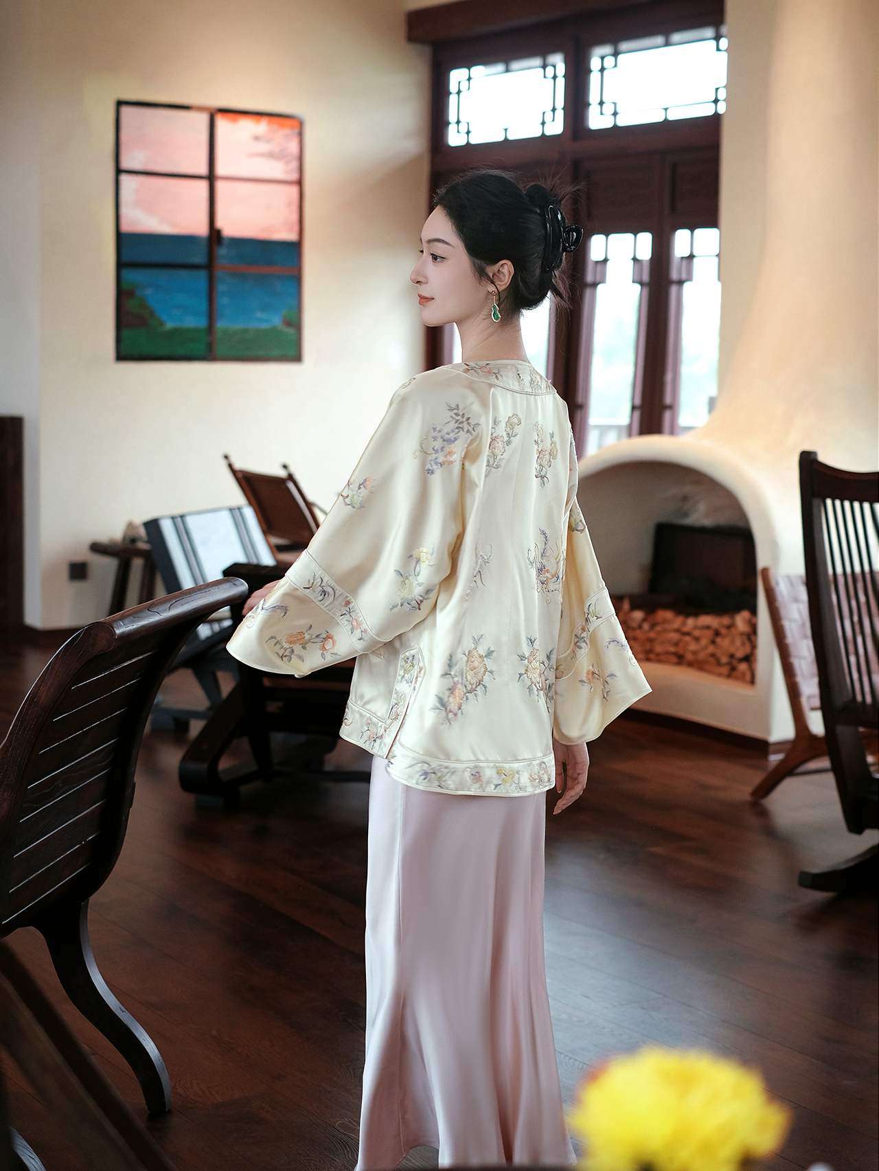 盛唐牡丹大师系列| 重缎真丝手绣偏襟外套-浅黄