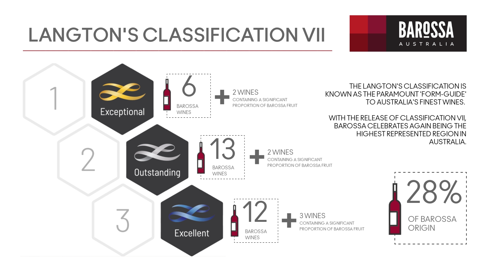 巴罗莎谷在全球葡萄酒市场亨有盛誉,被誉为“新世界葡萄酒的典范”。巴罗莎拥有大量未受根瘤蚜侵害的老藤,许多西拉和歌海娜藤龄超过100年,为全球罕见。这里的葡萄酒常年在国际比赛中斩获高分,尤其受到《詹姆斯·哈利德葡萄酒指南》(James Halliday Wine Companion)和《葡萄酒观察家》(Wine Spectator)的高度评价。在澳大利亚本士的权威分级--兰顿分级(Langton's Classification)中,28%的葡萄酒来自巴罗莎谷。奔富Penfolds、翰斯科Henschke、托布雷Torbreck等酒庄以顶级西拉酒款闻名巩固了巴罗莎谷的国际地位。巴罗莎谷以其深厚的酿酒传统、多样化的风土和卓越品质的葡萄酒,成为新世界葡萄酒的重要名片。