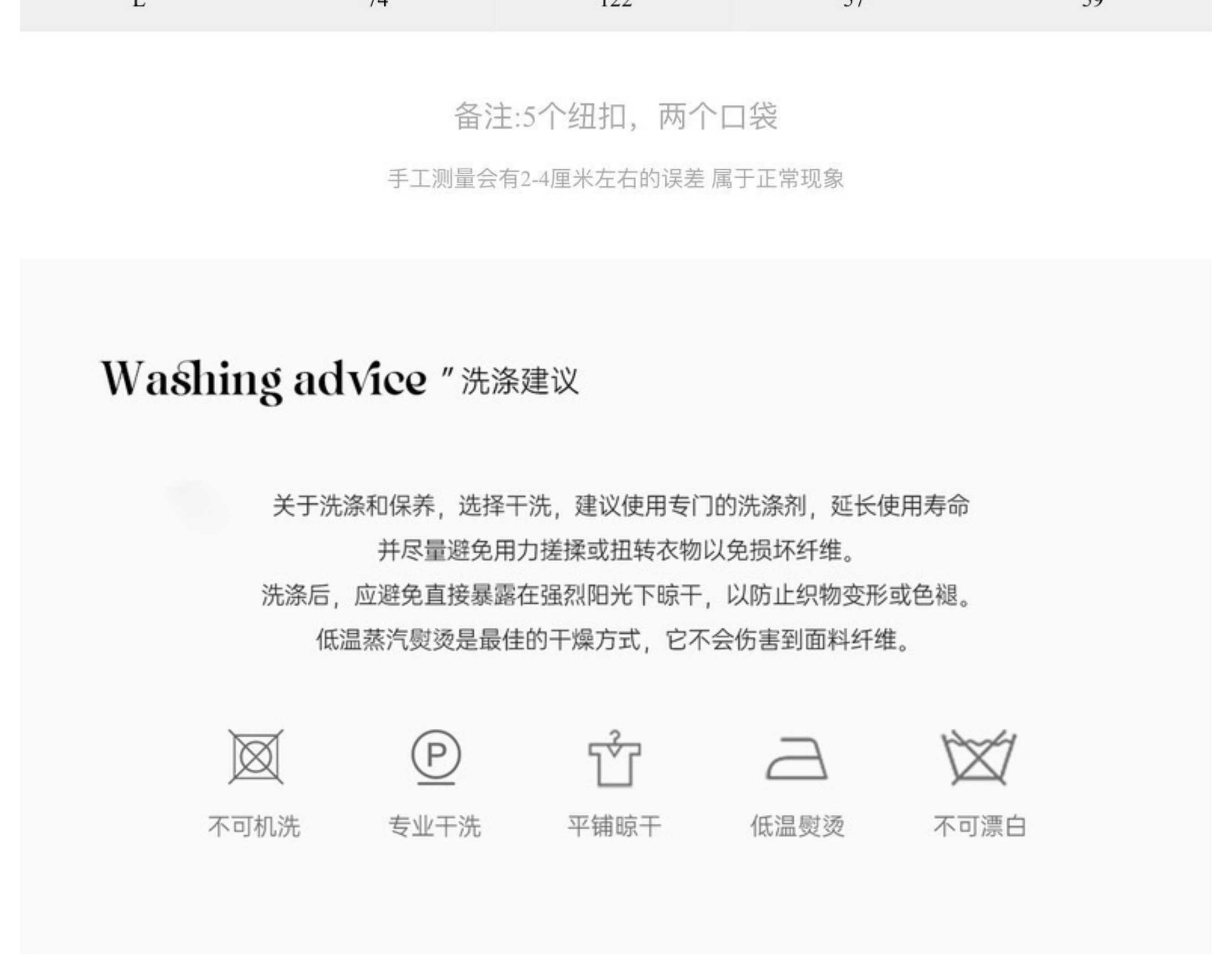 | 售后标准 | 圆通拦截费统一收费5元 顺丰拦截费统一收费8元 不影响二次销售,支持7天无理由退换!运费自理。 针织/服装类务必及时签收,及时验货,切勿水洗,穿过有味道或水洗不再售后!尺码建议仅供参考,因个人原因导致尺码大小的退换货,售后运费自理。 质量问题签收起48小时之内带快递面单与产品同框拍照报售后,超时不予处理望谅解 |