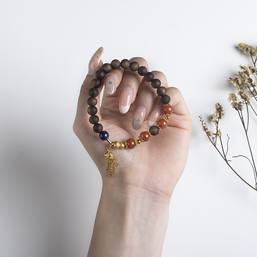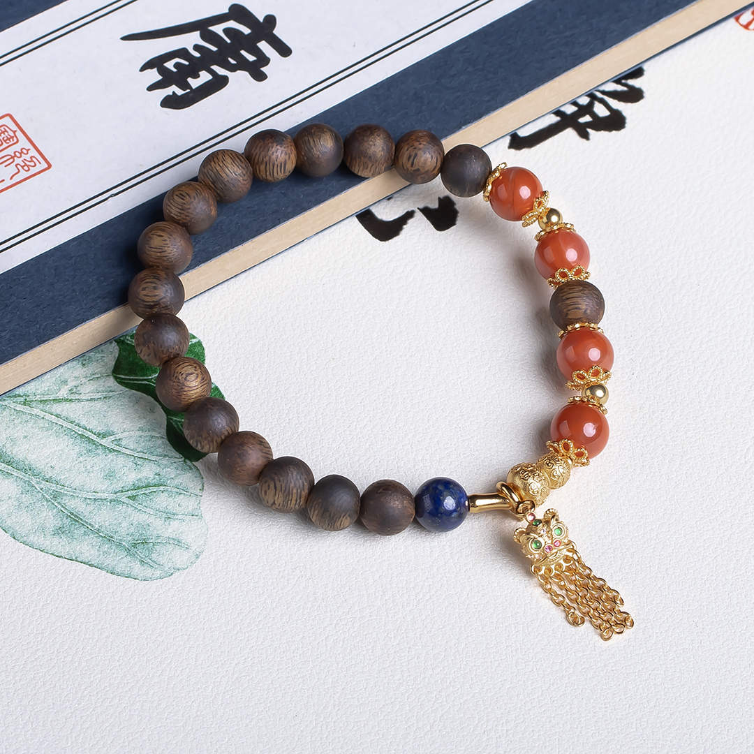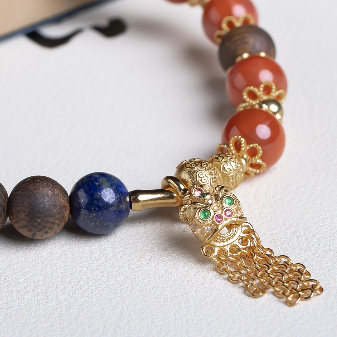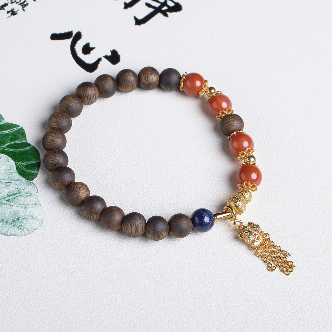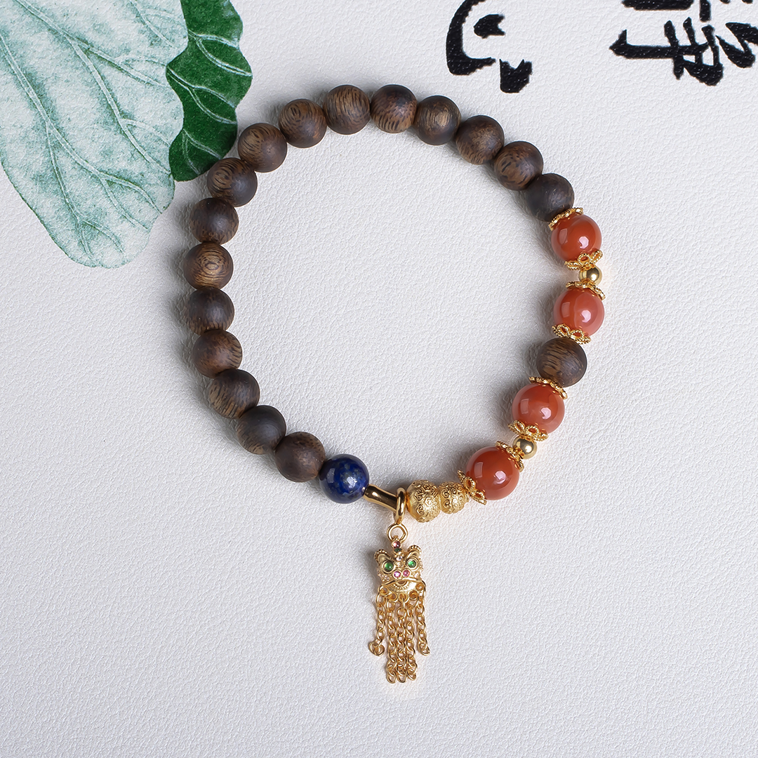 xy0568沉香+南红青金石醒狮手串.银,天然沉香约7.4mm,原色原味,香味自然清甜,款式设计:一枚宝物葫芦连吐多颗宝珠,意为吉祥、好运、喜庆大丰收。再搭配一枚醒狮小坠子,更有辟、牙.阝、好彩头之意,也是传统文化传承的特色。