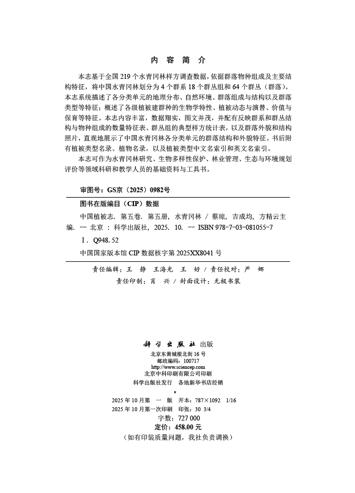 本志基于全国219个水青冈林样方调查数据,依据群落物种组成及主要结构特征,将中国水青冈林划分为4个群系18个群丛组和64个群丛(群落)。本志系统描述了各分类单元的地理分布、自然环境、群落组成与结构以及群落类型等特征;概述了各级植被建群种的生物学特性、植被动态与演替、价值与保育等特征。本志内容丰富,数据翔实,图文并茂,并配有反映群系和群丛结构与物种组成的数量特征表、群丛组的典型样方统计表,以及群落外貌和结构照片,直观地展示了中国水青冈林各分类单元的群落结构和外貌特征。书后附有植被类型名录、植物名录,以及植被类型中文名索引和英文名索引。