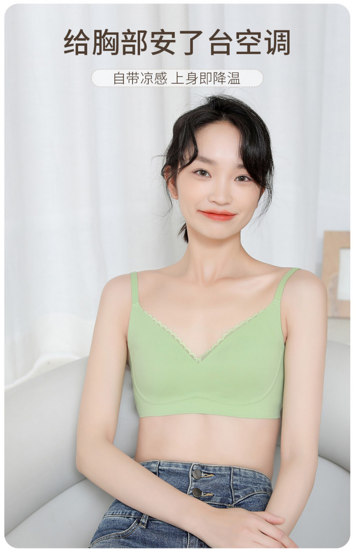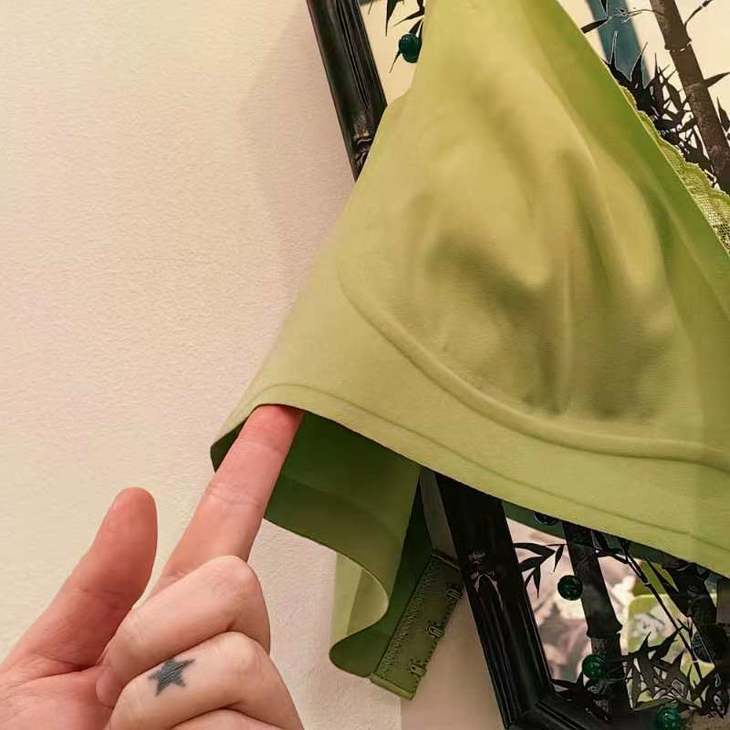 真的是太过美貌,我也就又一次豁出去上身拍拍!现在还两色,我留了温温柔柔的绿,光泽感很亚光,柔韧蕾丝花边搭配深V领,性感中带点可爱!上手则是综合了棉的柔软和丝的滑溜,自带凉感,夏天真的需要!而且整体重量是比大部分文胸都轻薄的,表层像一层奶皮,整个文胸50g不到,真如若无物!