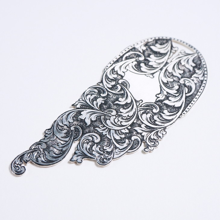 一枚独特的书签。经典卷草纹。可作为书签或吊坠使用。赠送925银做旧银链一根。雕金,Engraving,是欧洲的一种手工的金属雕刻工艺,利用各式各样的刻刀在金属上雕刻出装饰花纹。欧洲中世纪,金工工匠们开始将雕金运用在金属制品上。在一百年前的意大利,Mario Buccellatti创新了一种雕刻方法——织纹雕金,即在金属上雕刻出织物般的花纹,并与镂空蕾丝的Tulle工艺相互结合。使其呈现出蕾丝面料的效果。