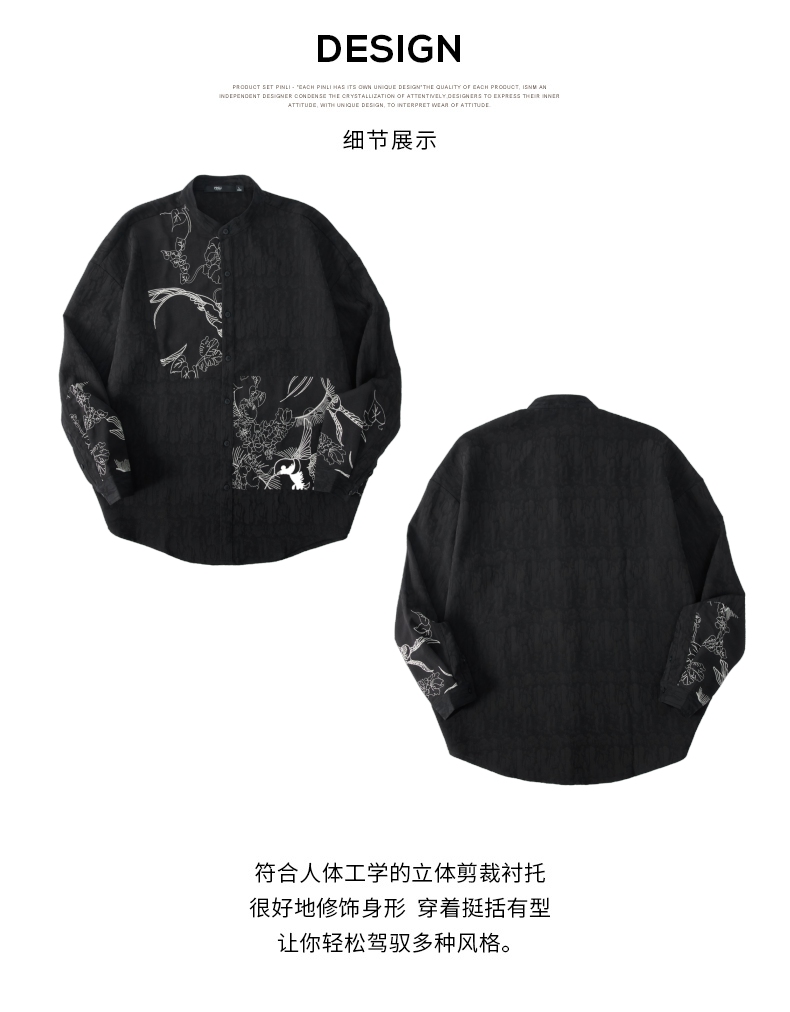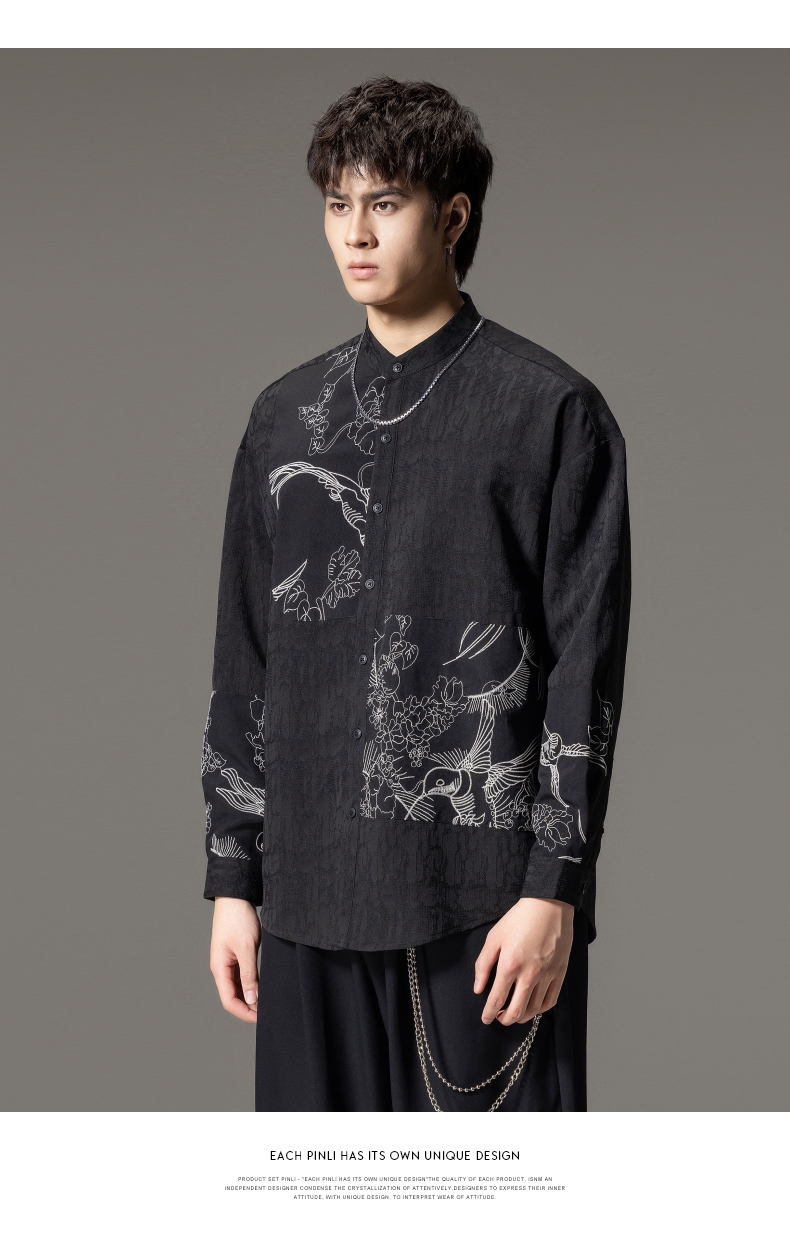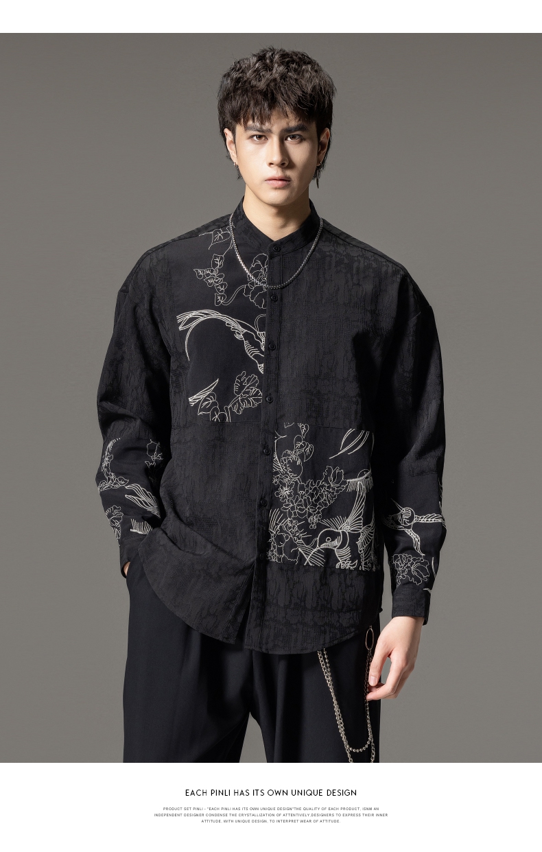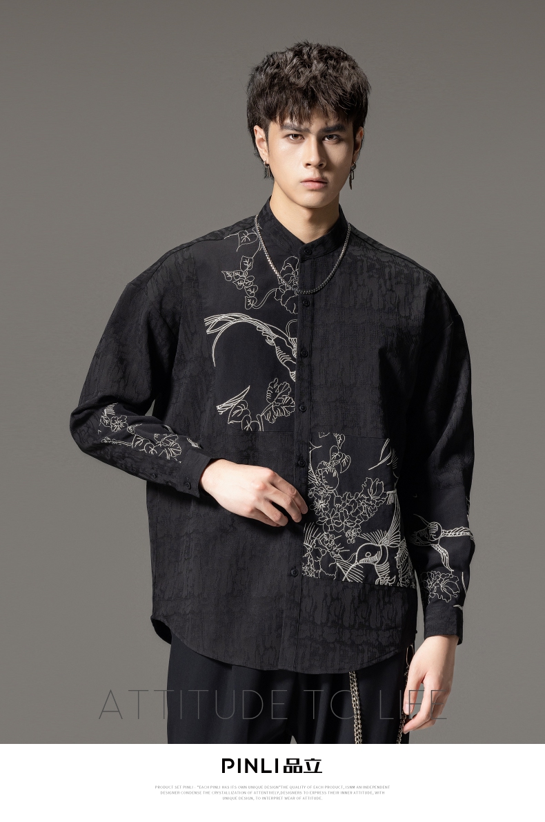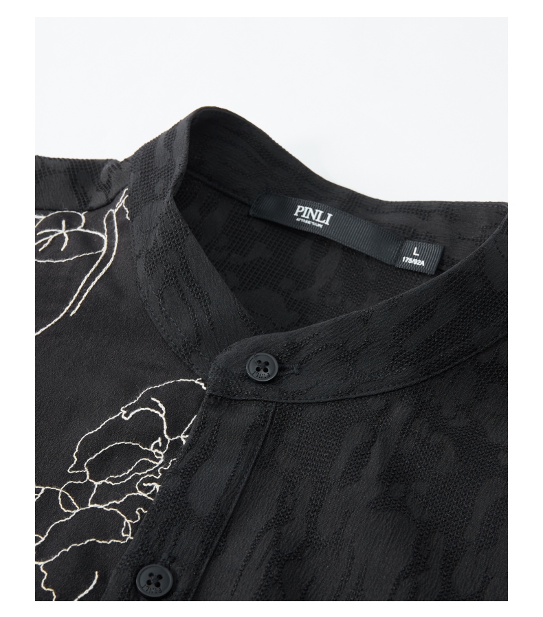 PINLI品立春季新款新中式立领刺绣衬衫男士拼接长袖国潮衬衣B243113012
