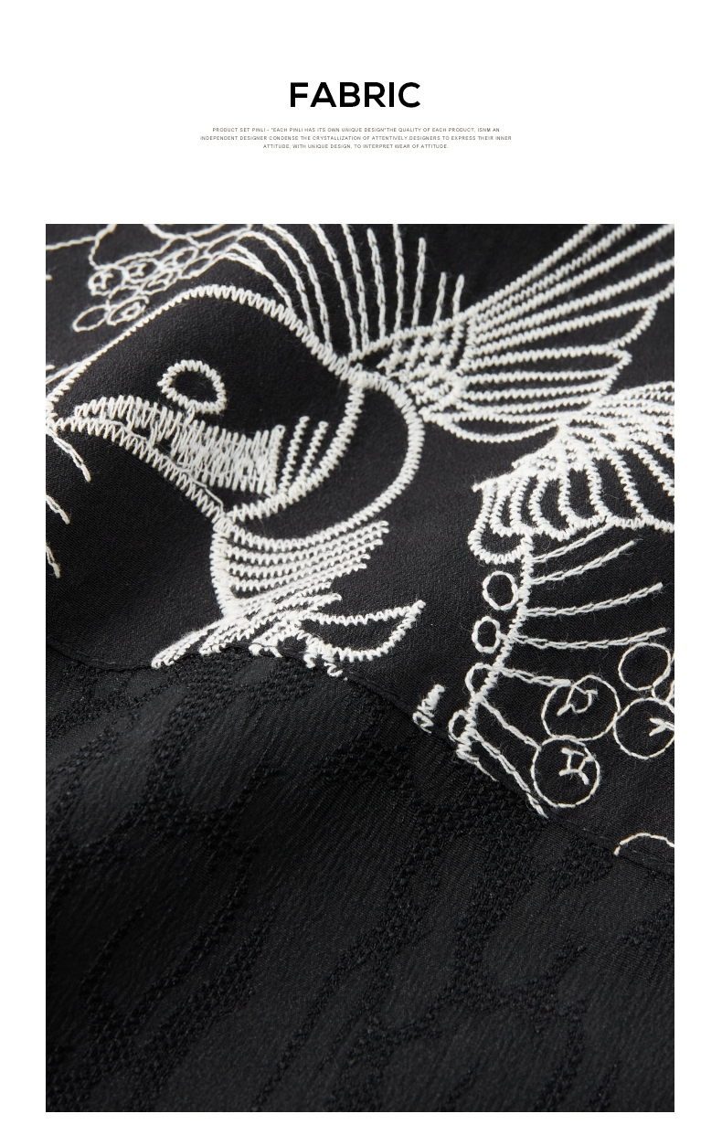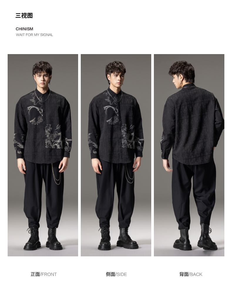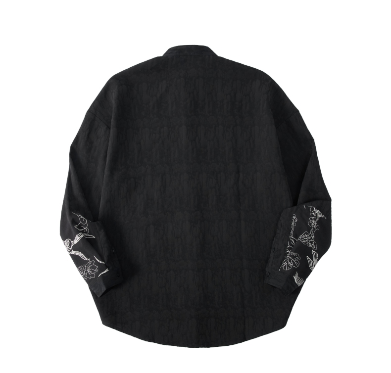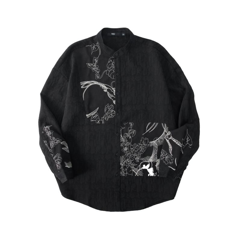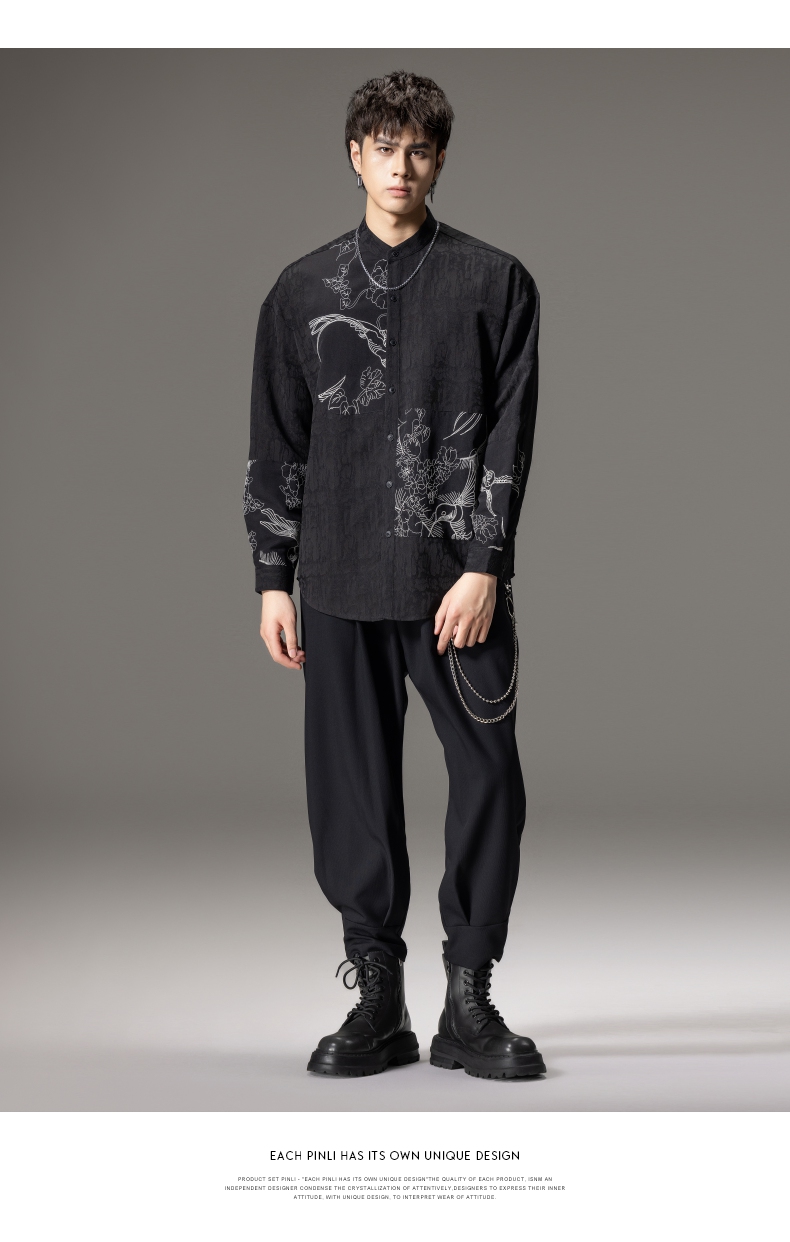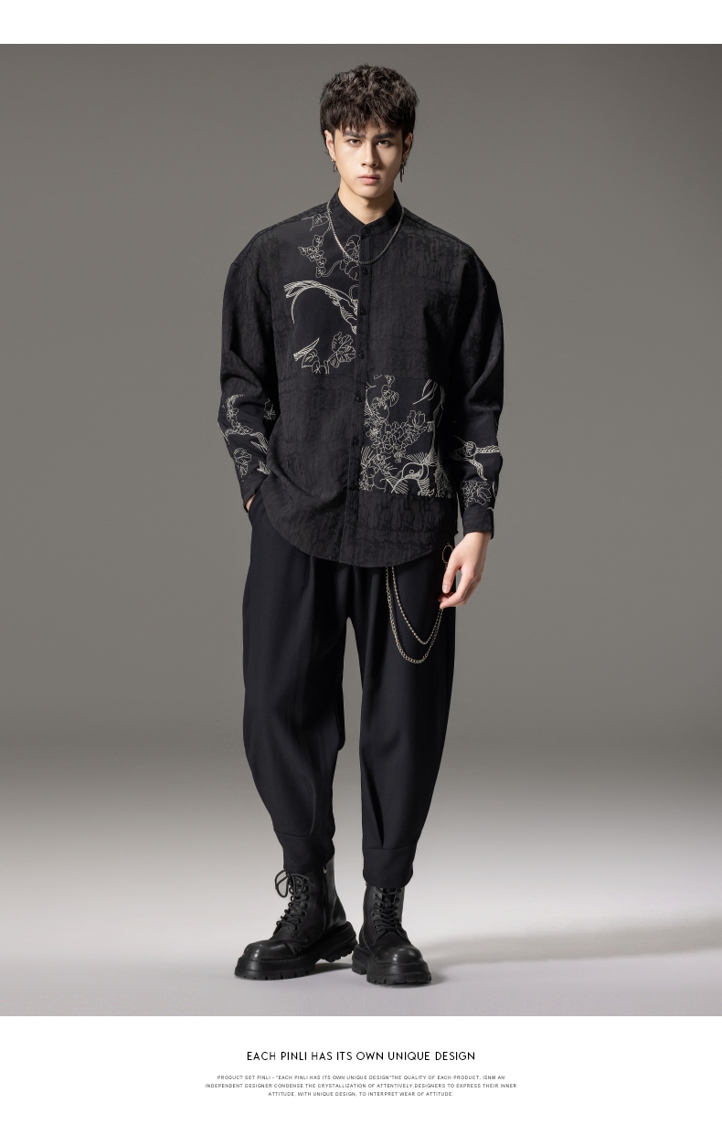 PINLI品立春季新款新中式立领刺绣衬衫男士拼接长袖国潮衬衣B243113012