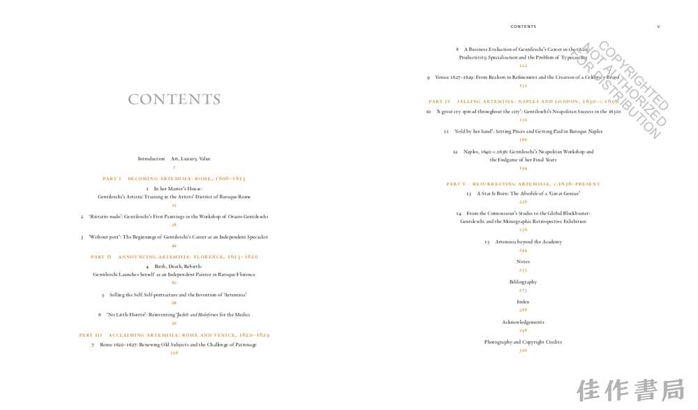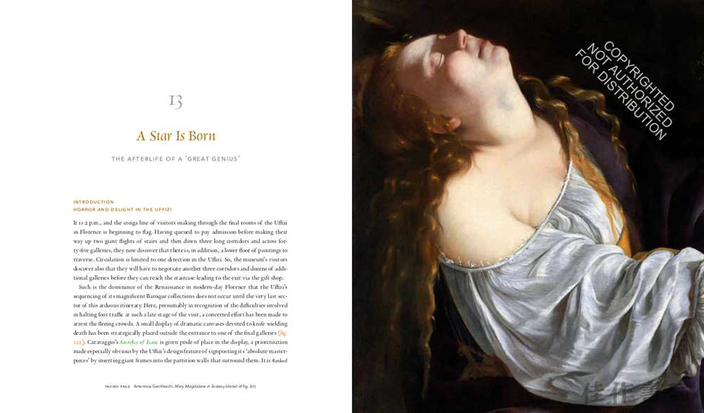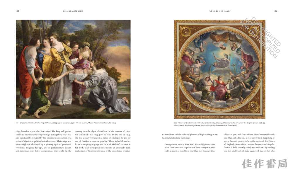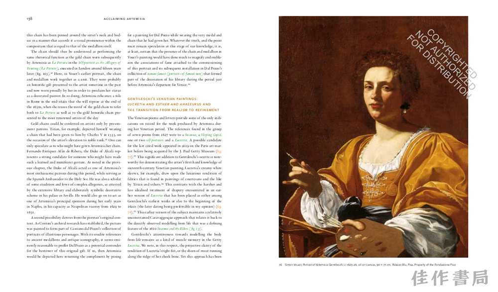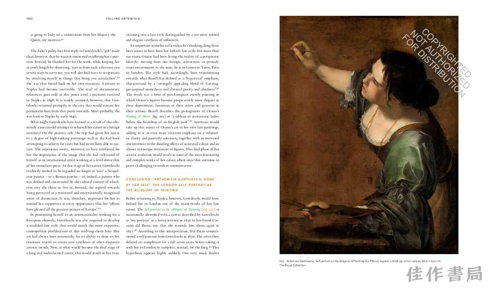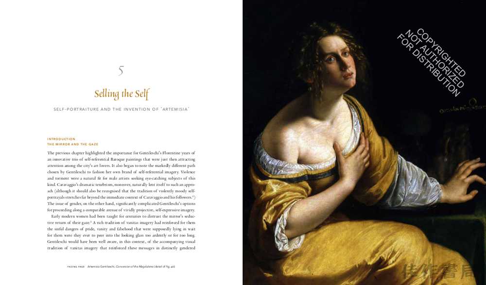 结合最新的研究成果和对新归属画作的详细分析,本书突出了真蒂莱斯基在意大利各艺术中心向公众推销自己时,发展出标志性风格背后的商业考量。她早期佛罗伦萨画作中的伪装自画像被重新评估为塑造自己形象、打造名人品牌的一种努力。此外,本书挑战了真蒂莱斯基的杰作仅限于其早期卡拉瓦乔风格作品的普遍看法,强调了其被忽视的晚期那不勒斯作品的重要性,这些作品被重新解释为对巴洛克工作室传统实践的创新回应。