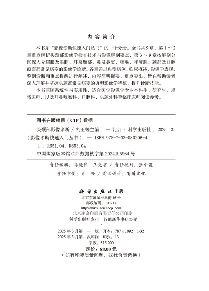 本书系“影像诊断快速入门丛书”的一个分册。全书共9章,第1~2章重点解析头颈部影像学检查技术与影像解剖要点,第3~9章按解剖区深入介绍眼及眼眶、耳及颞部、鼻及鼻窦、咽喉、唾液腺、颈部及口腔颌面部常见病变的影像学诊断。各章通过典型病例、临床概述、影像学表现、鉴别诊断和重点提醒进行阐述,内容简明扼要、重点突出,旨在帮助读者深入理解并掌握头颈部常见病变的典型影像学特征,提升诊断技能。