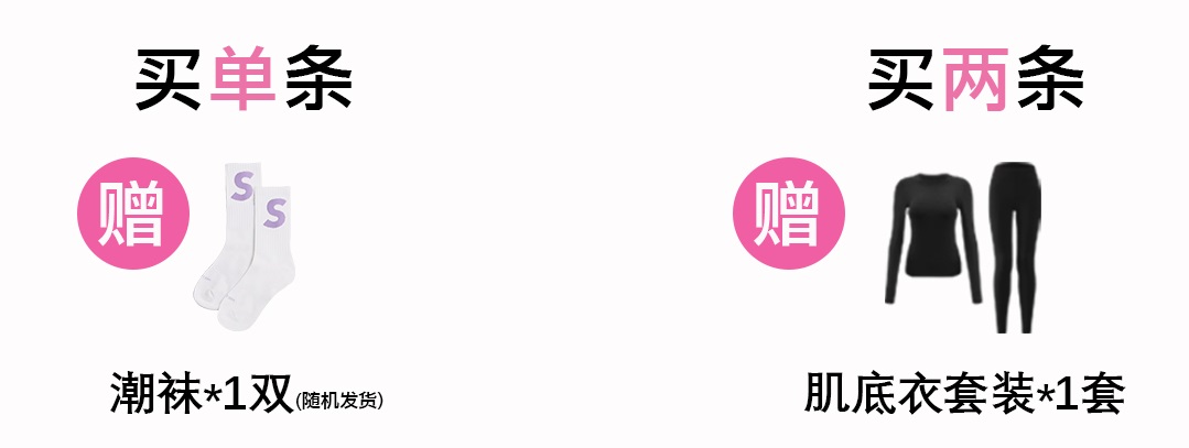 下单秋冬款6.0Pro鲨鱼裤,单条赠送袜子一双,两条赠送肌底衣套装一套,随货发出,限同一笔订单内;退货需同步退回赠品,如果不退需要扣除相关费用:潮袜15元一双,肌底衣40元一套。