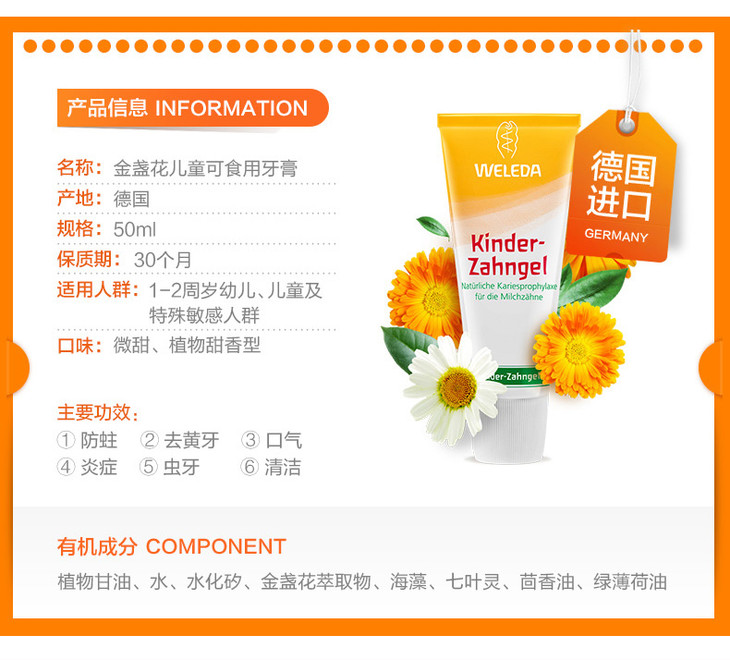 牙齿从小就要呵护,对于刚出牙的宝宝,更是如此。这款儿童牙膏呈啫喱状,刷牙无泡沫,不含研磨剂,原料采用纯天然材质,无氟可食用,对于刷牙不熟练,吐不干净牙膏的小宝宝,妈妈们可以不必担心误食造成的伤害。
