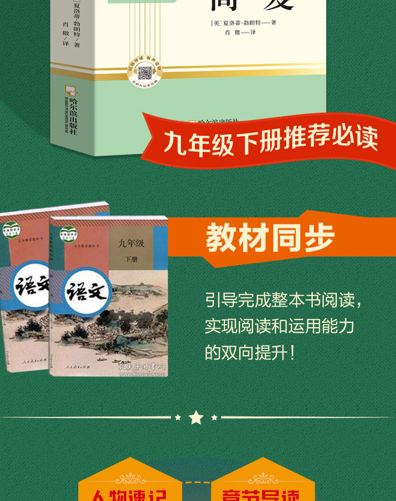 简爱书籍正版原著和儒林外史九年级必读课外阅读书籍经典名著白话文版初三下册教材配套同步阅读文学完整版无删减非人民教育出版社