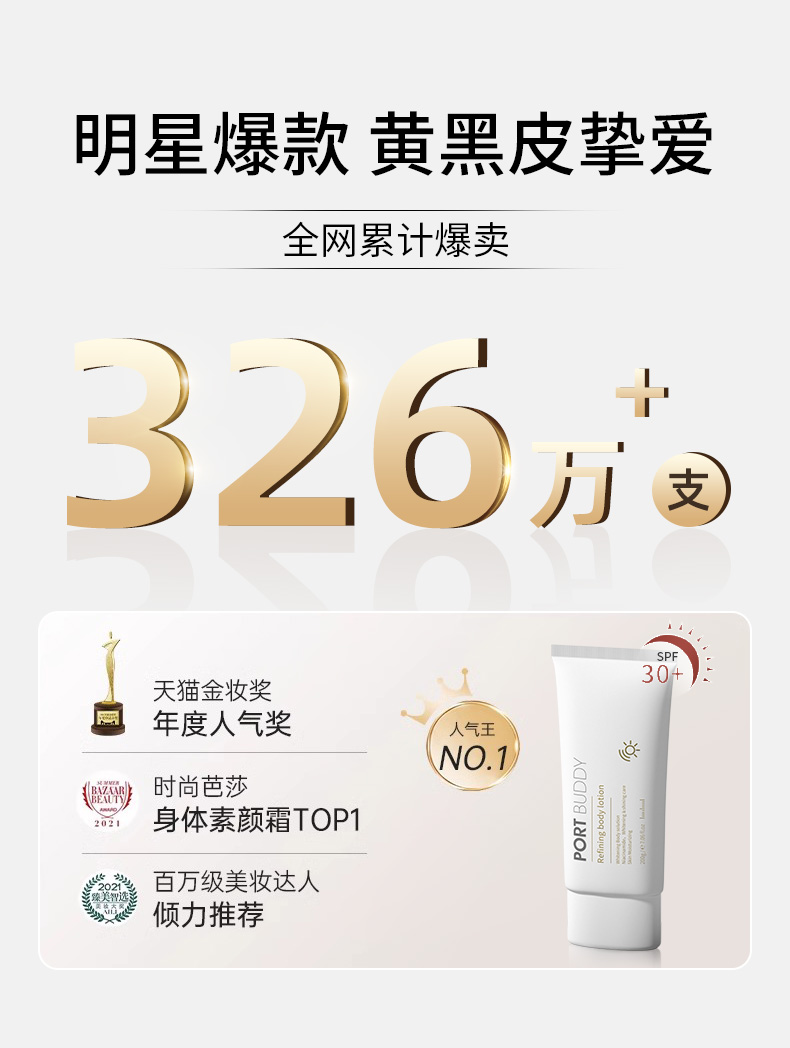 PORT BUDDY的身体素颜霜,除了让皮肤肉眼可见的白白外,还添加了三重面霜级mei白成分:99%精纯烟酰胺,纯度高,刺激性低,qu黑mei白效果更好;光果甘草根提取物被誉为“mei白黄金”,能抵御表皮氧化黯沉,阻断黑色素转运;VC异抗环血酸则能抑制酪氨酸酶活性和黑色素生成,并消除皮肤中的自由基。三合一,有效帮助yi制黑色素,ti亮肌肤,补水保湿,日常使用都像在做美白spa!而且它还加入了二氧化钛,能够12小时长效防晒,阻隔90%的紫外线,不用再额外涂抹防晒霜咯,而且沐浴露一冲即净,省时省事又省心。素颜霜成分全部通过专业检测,安全无虞,不含酒精、荧光剂、激素、重金属。