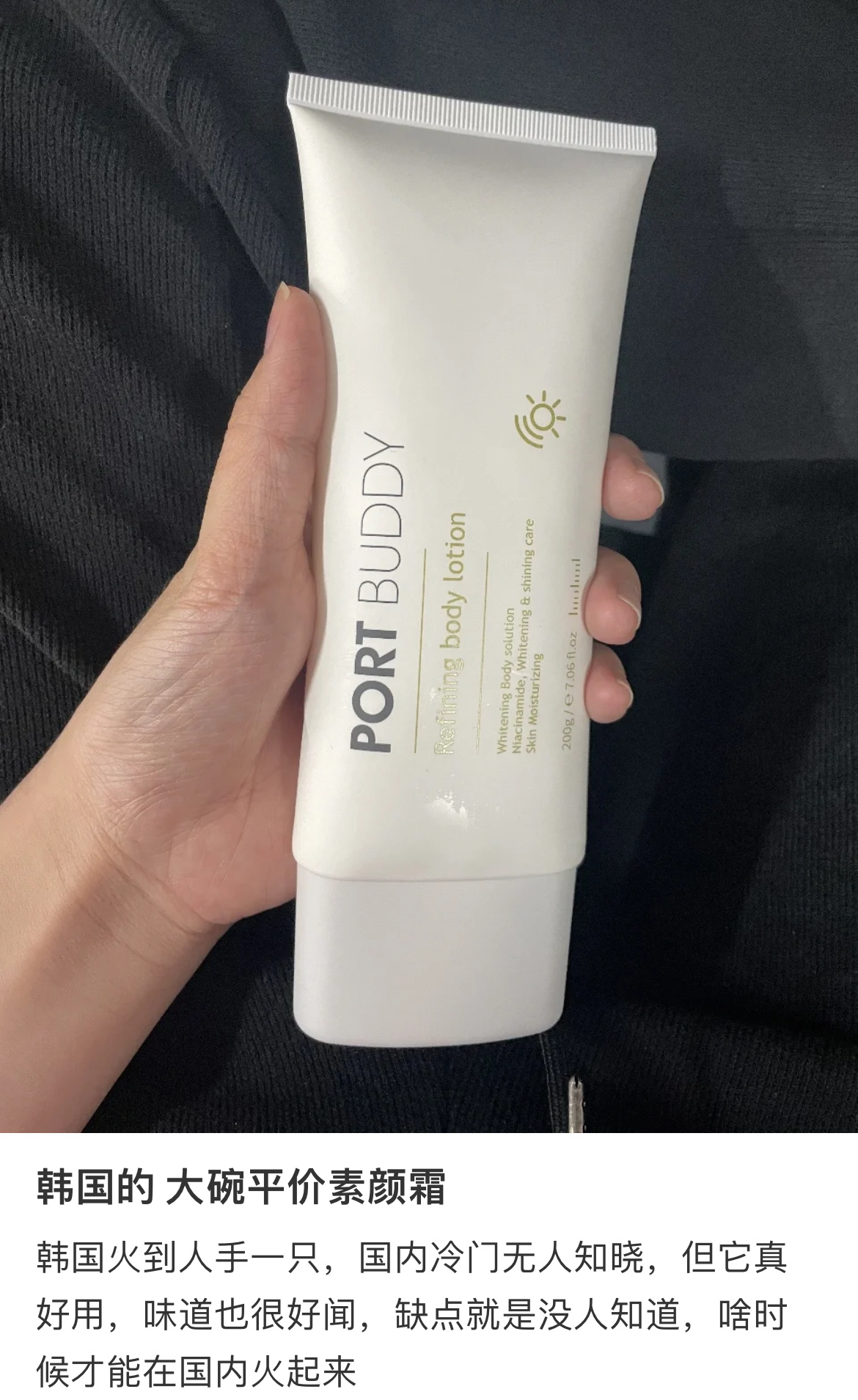 PORT BUDDY的身体素颜霜,真的绝!黄黑皮一涂上马上变冷白皮,而且肤感自然清透,还带防晒指数和三重焕白成分,简直是夏日作弊神器。。。我已经好多年不怎么上韩妆了,但这支是真不错用,200g那么大量,2支138,真的划算,一夏天足足够了!