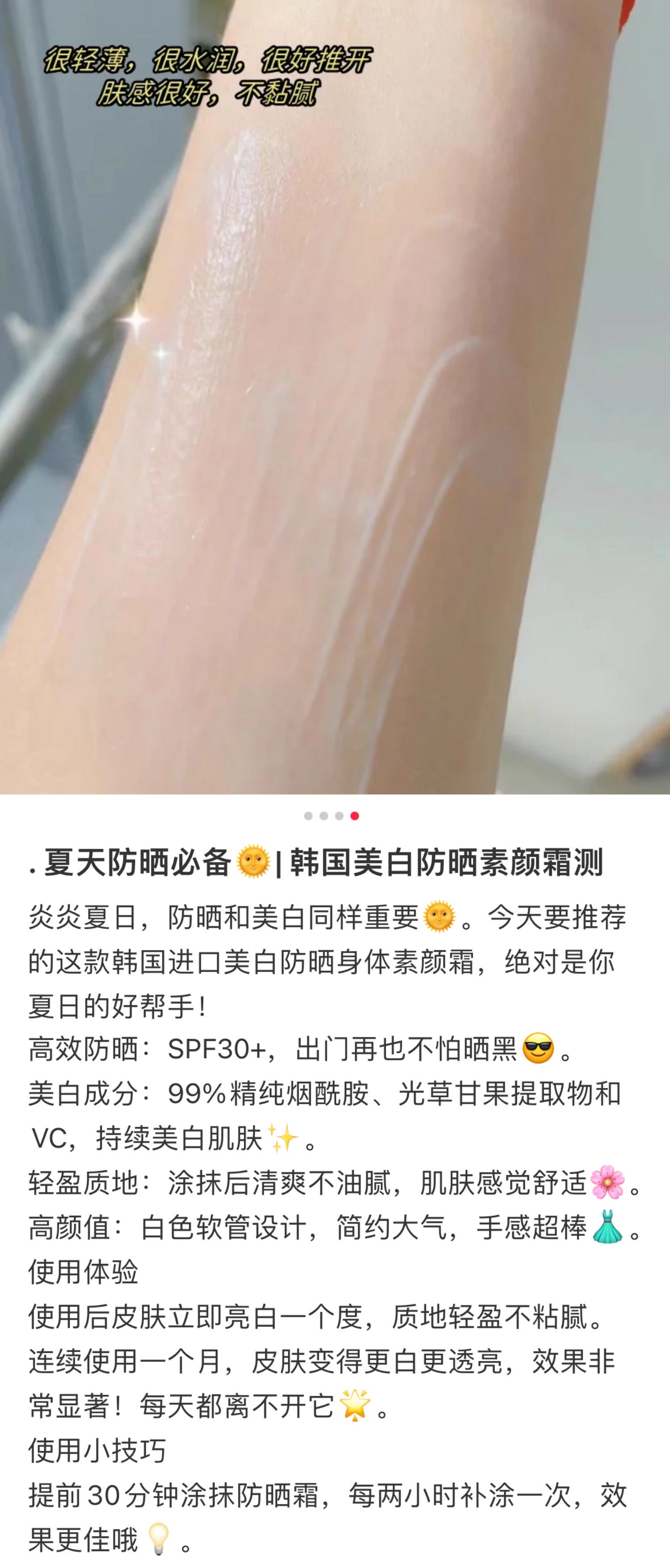 我最近其实试了蛮多支的,但PORT BUDDY一打开真的吓到,好大一支!质地也是比较轻薄,水润细腻,如牛奶乳液般易推开,延展性也不错,不假白不黏腻,是很自然的白皙,宛如天生奶油肌,而且还有防水成膜技术,即使出汗也不会流白汤!我也建议涂前先把毛毛刮干净,会更服帖,还得绕开纹身,不然图案上会有一层白膜,会雾蒙蒙的。。。洗起来超方便,日常沐浴露就可以啦!夏天想从头白到脚,赶紧冲!