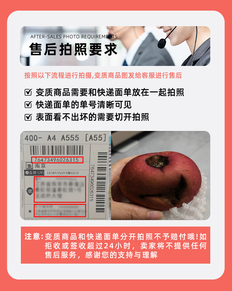 ④到货后,先签收,请在24小时内把快递单和坏果放一起拍照(能看到运单号、姓名,坏果情况),我们将根据果子实际损坏情况,按照“付款价格÷个数×坏果数量=赔付的金额”标准进行赔付