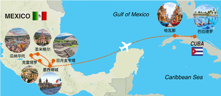 第07天 | 巴士/飞机 | 墨西哥城Q哈瓦那 参考航班:4O2900 MEXHAV 1115/1450 | 早餐 自理 晚餐 |