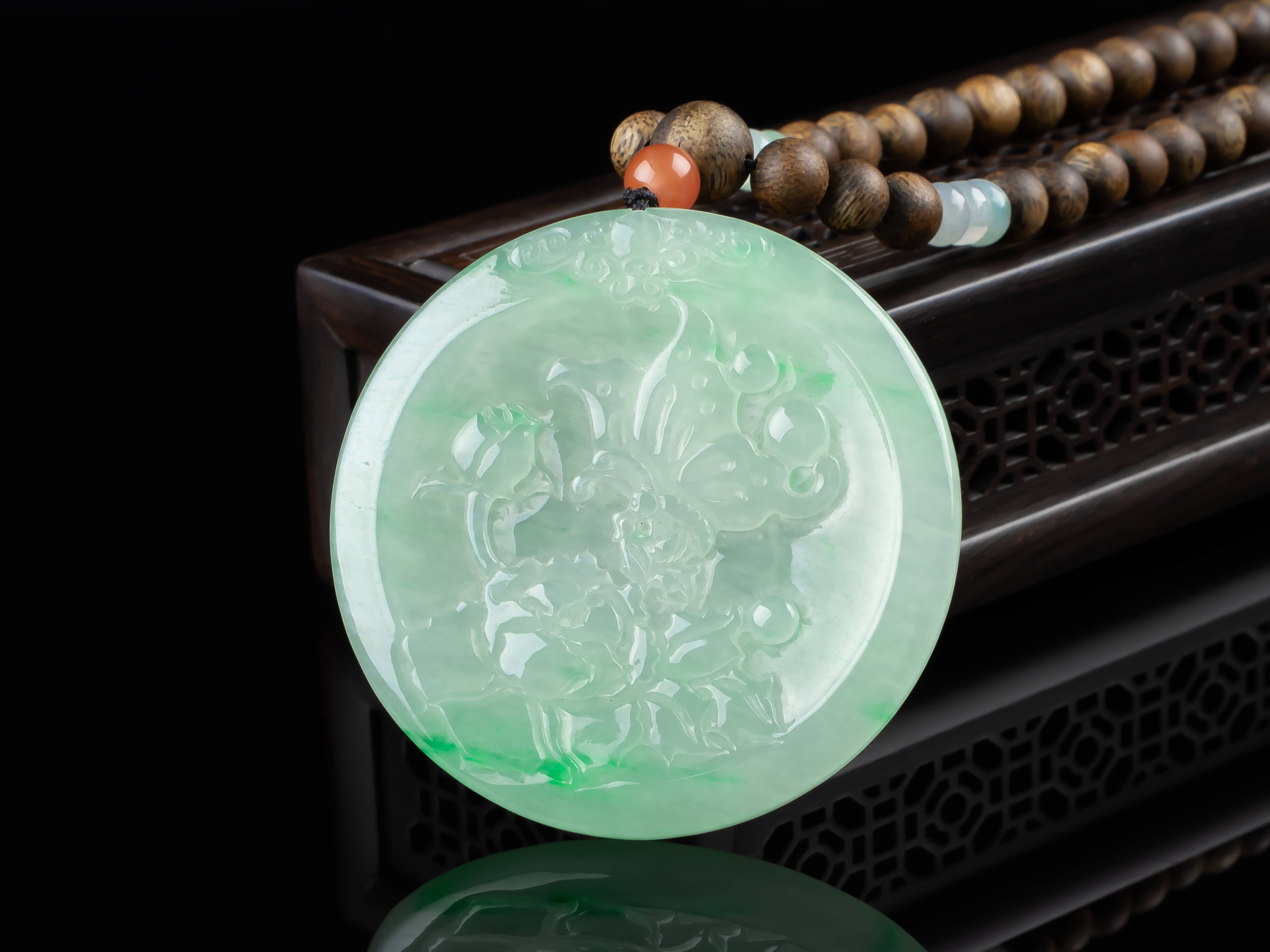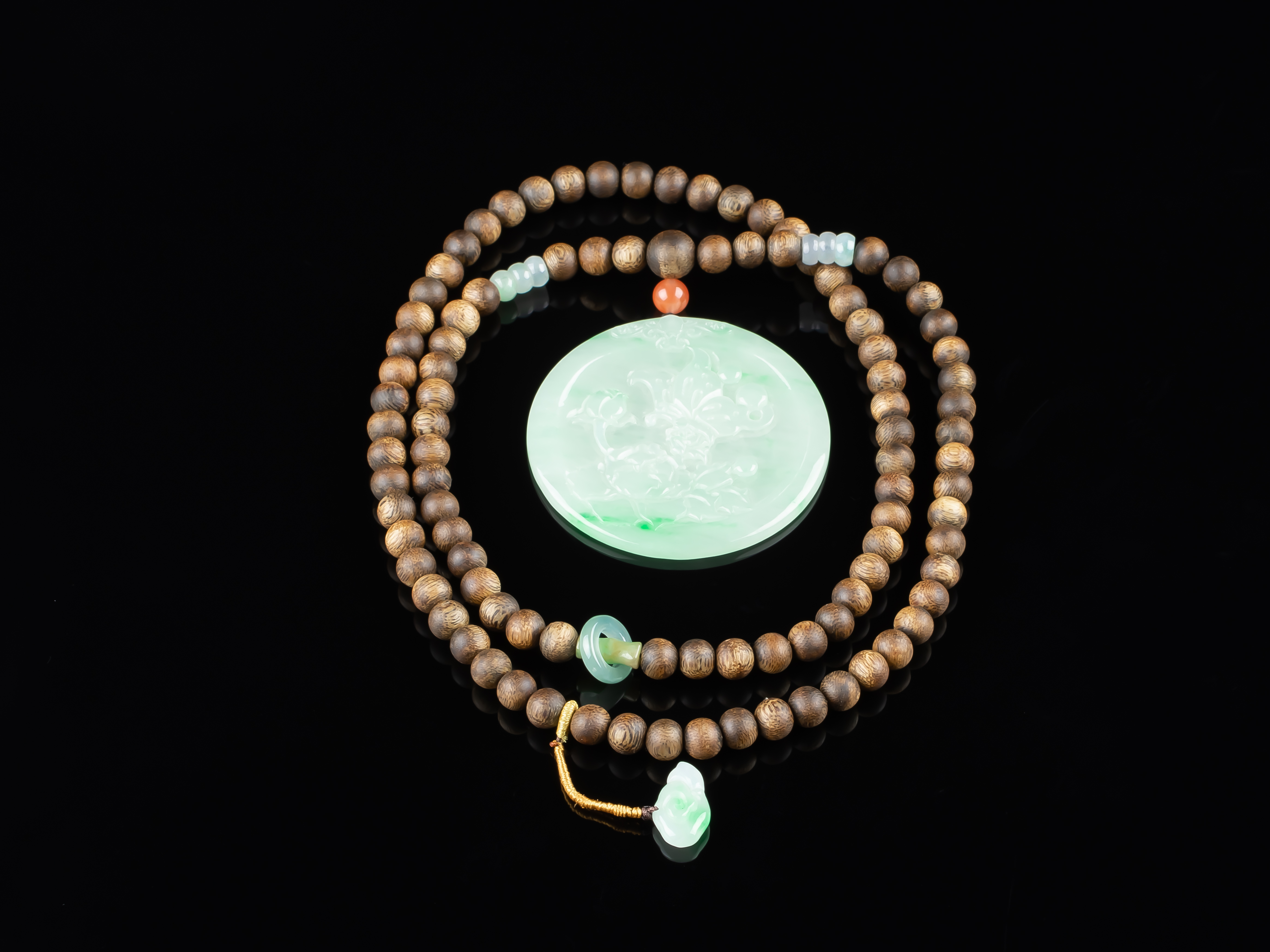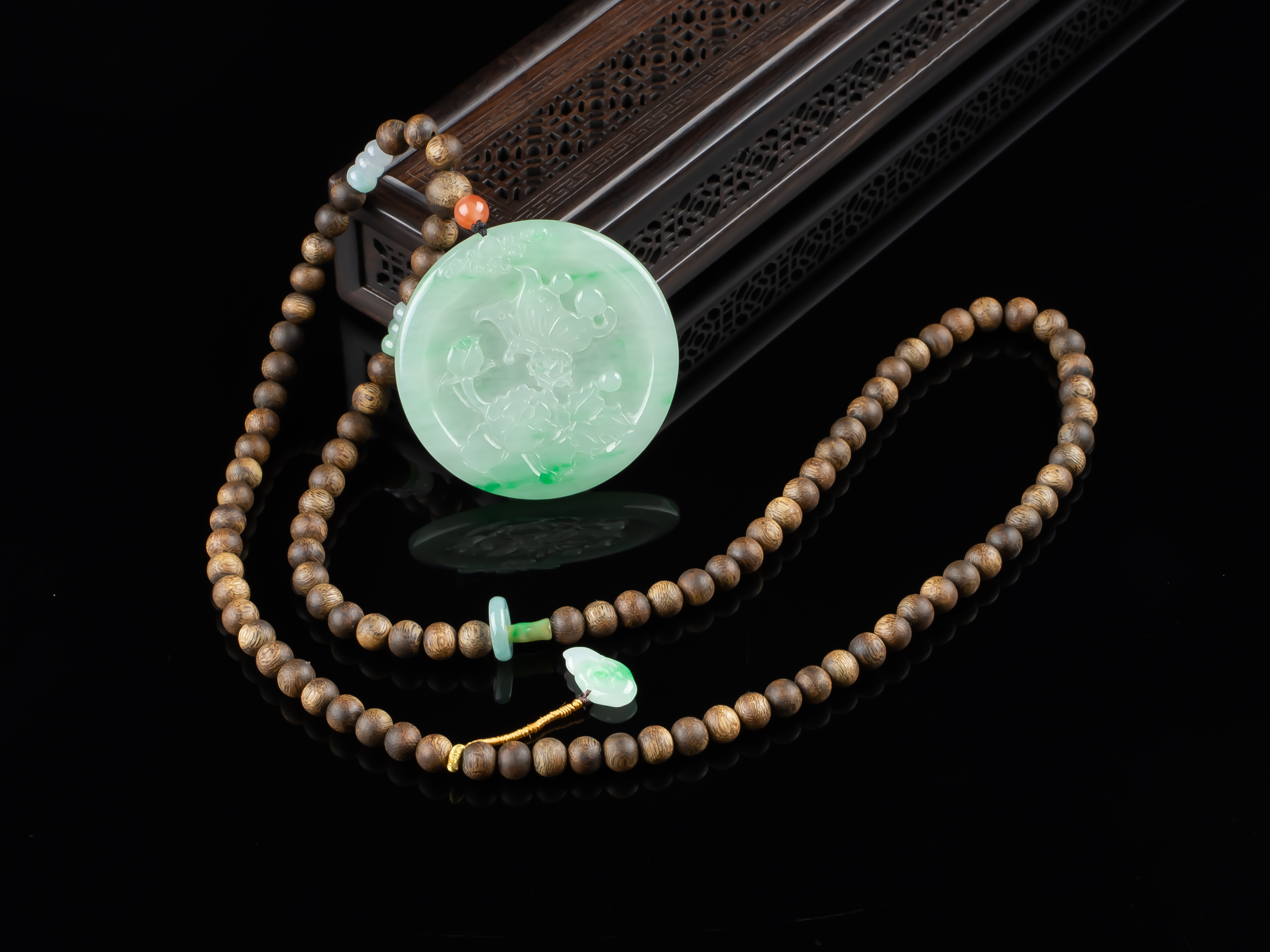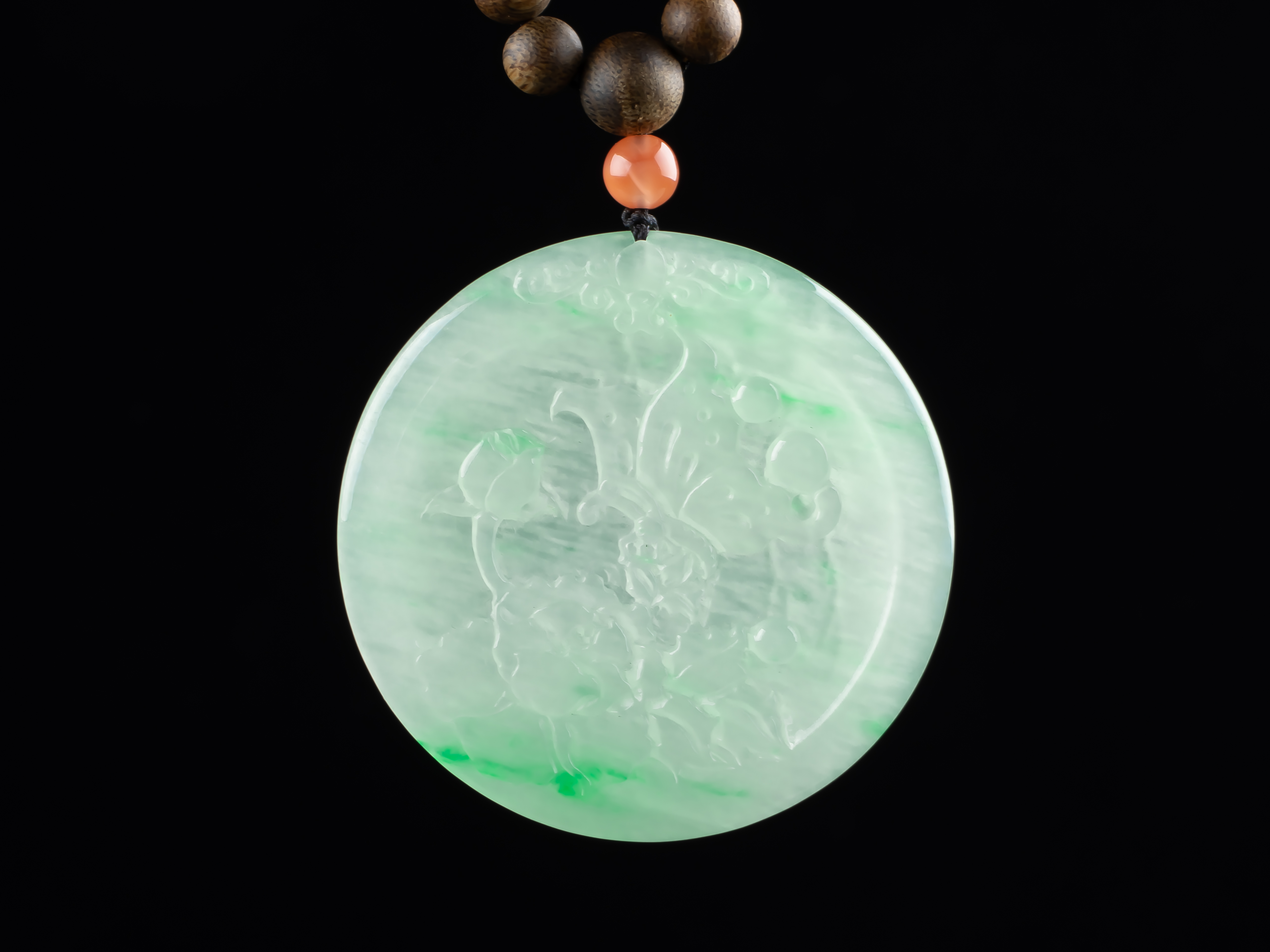 XY0169沉香+翡翠蝶恋花圆牌挂件,天然沉香圆珠7.3mm,原色原味,香味自然清甜。配珠:南红、翡翠。冰种的翡翠大圆牌,约56×4.5mm,冰润细腻,蝶恋花雕刻精细,配翡翠跑环、祥云小提溜,款式典雅大方,佩戴效果非常大气、富贵。