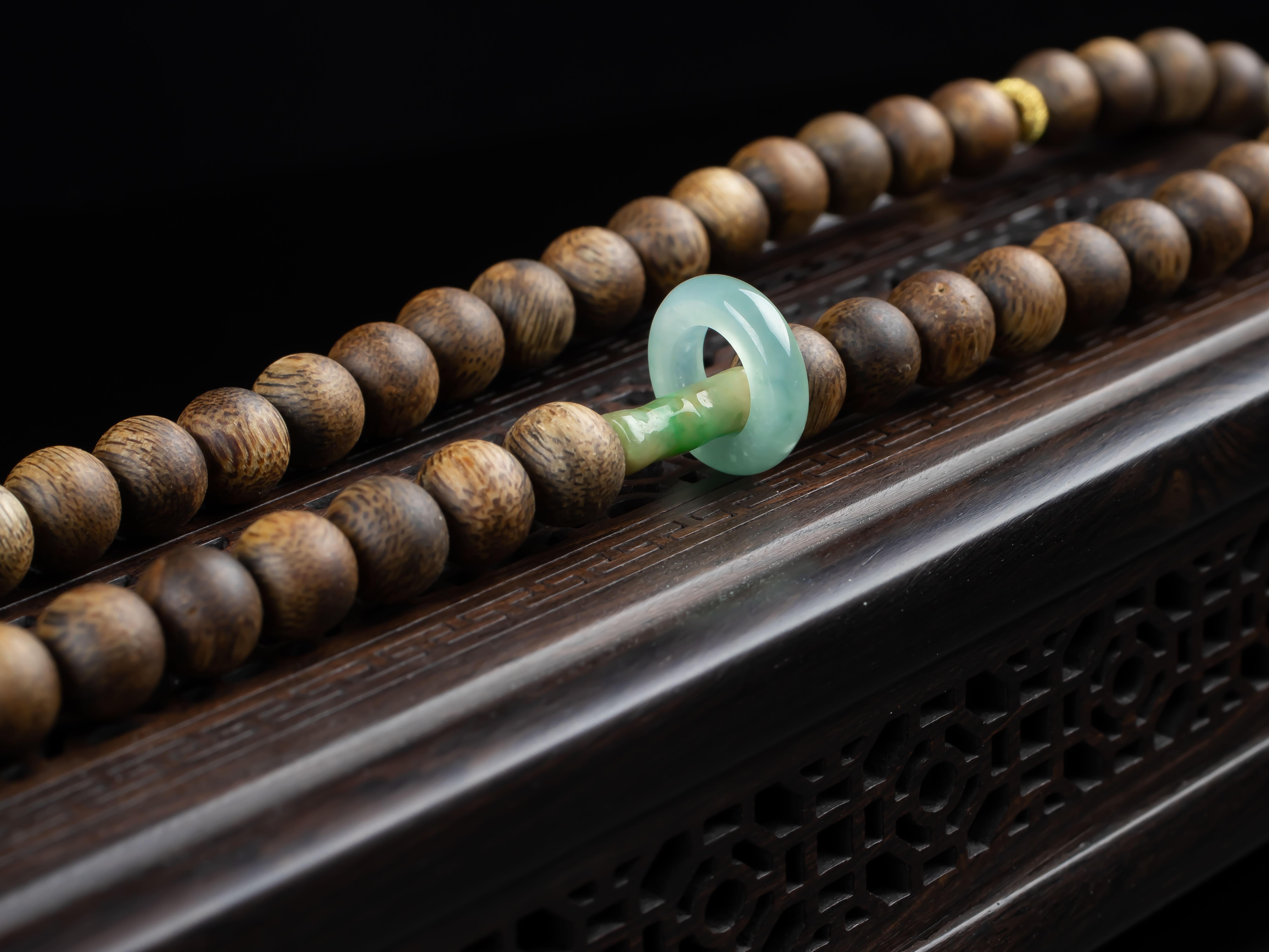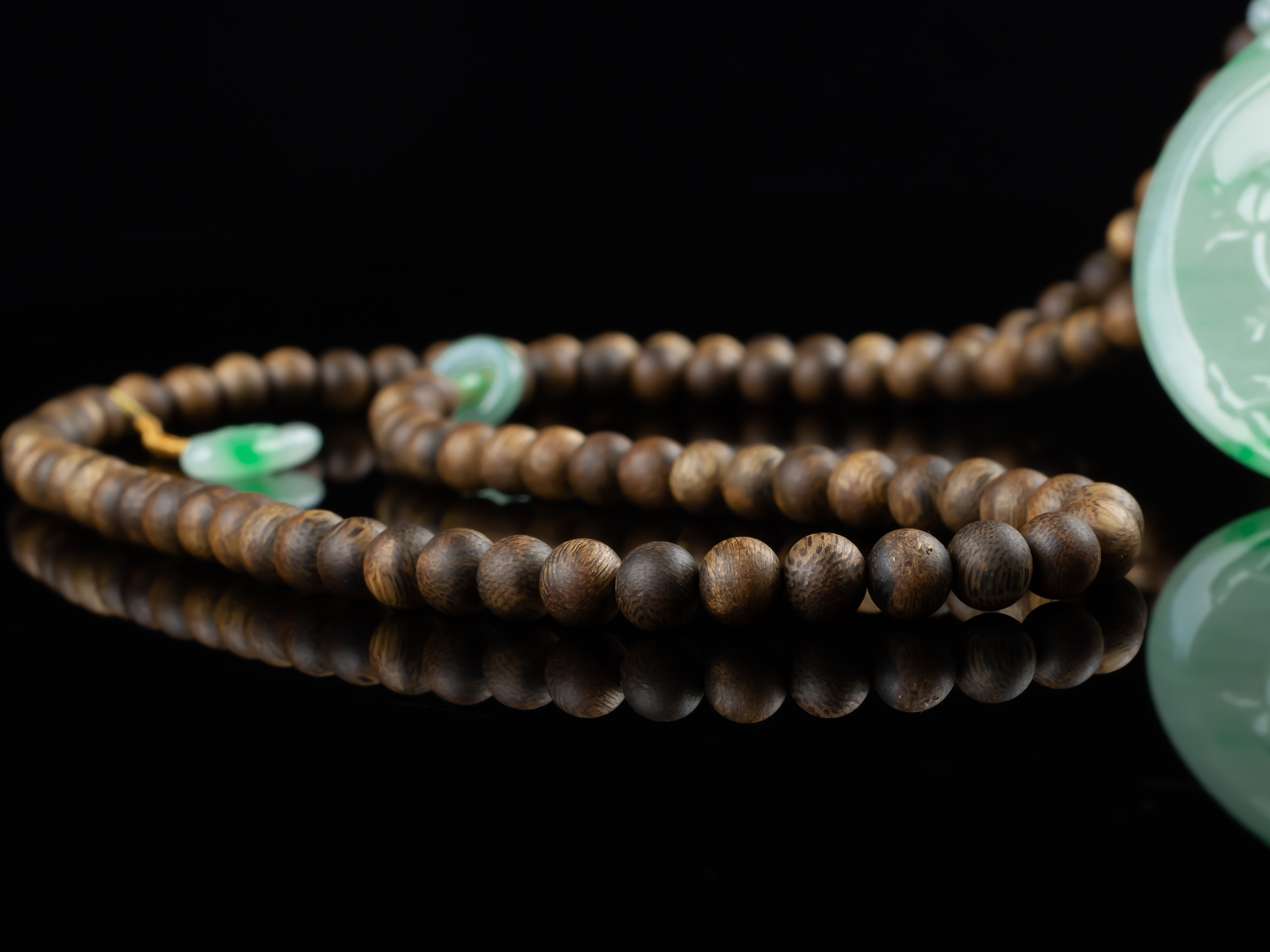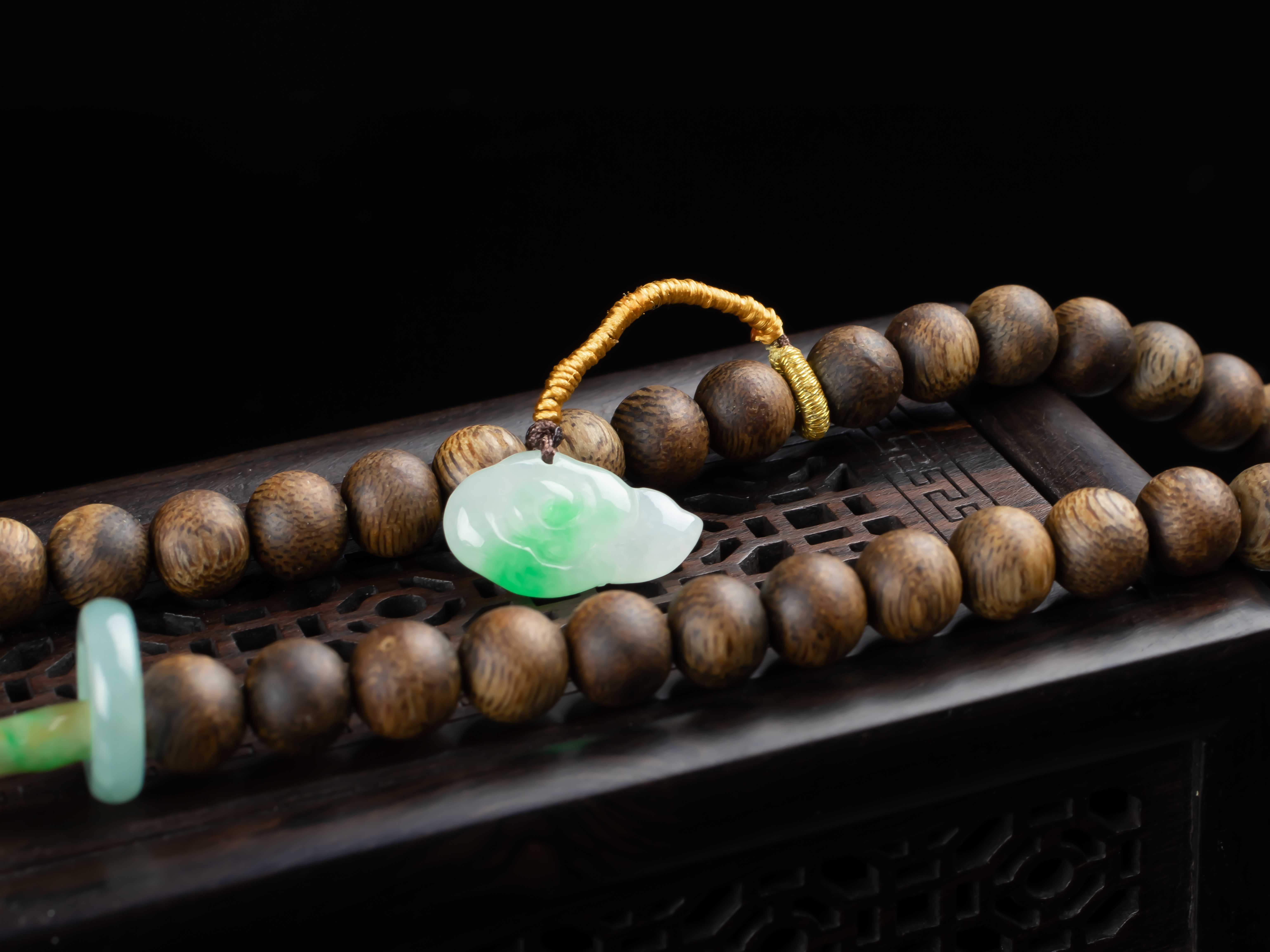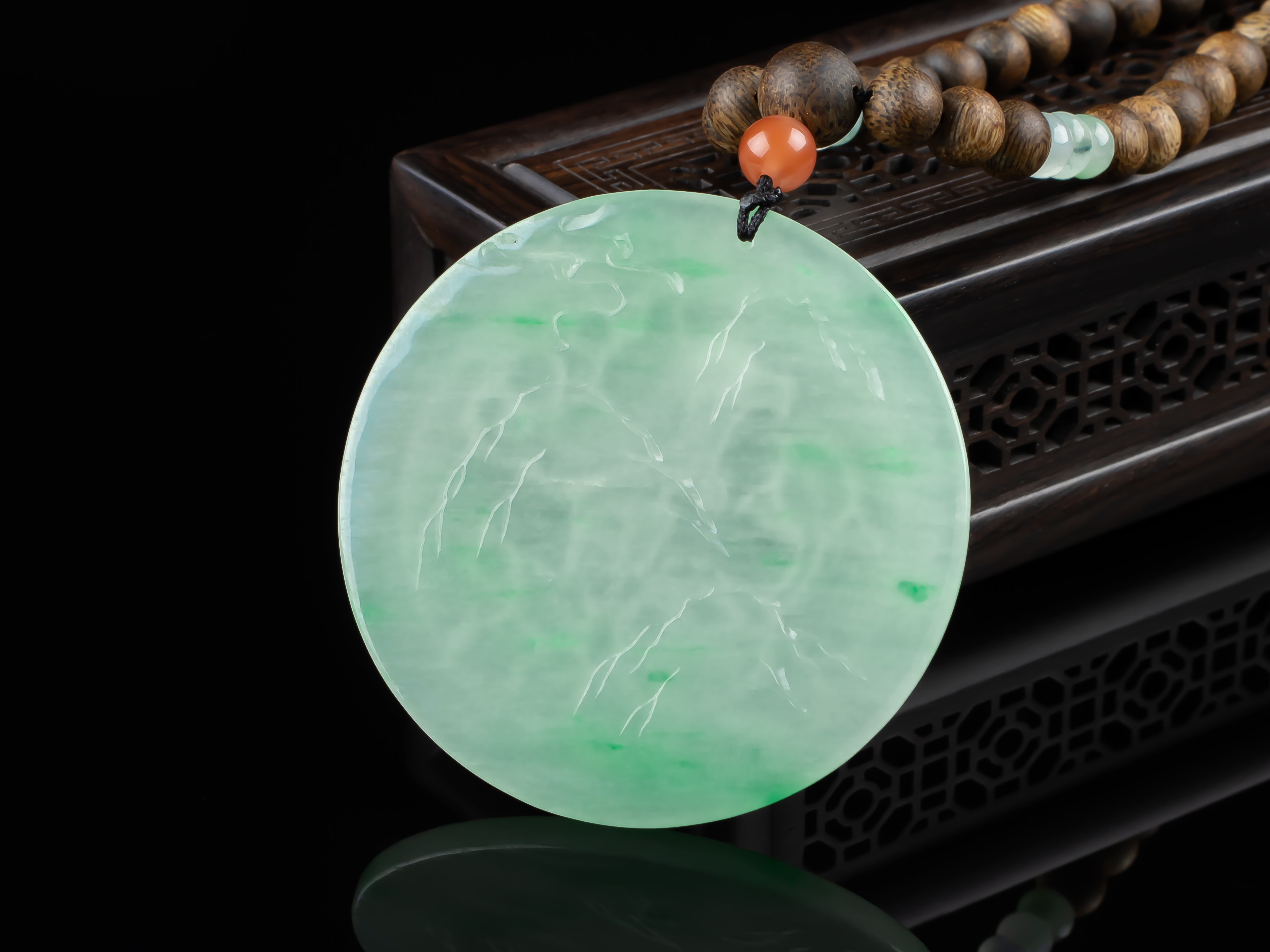 XY0169沉香+翡翠蝶恋花圆牌挂件,天然沉香圆珠7.3mm,原色原味,香味自然清甜。配珠:南红、翡翠。冰种的翡翠大圆牌,约56×4.5mm,冰润细腻,蝶恋花雕刻精细,配翡翠跑环、祥云小提溜,款式典雅大方,佩戴效果非常大气、富贵。