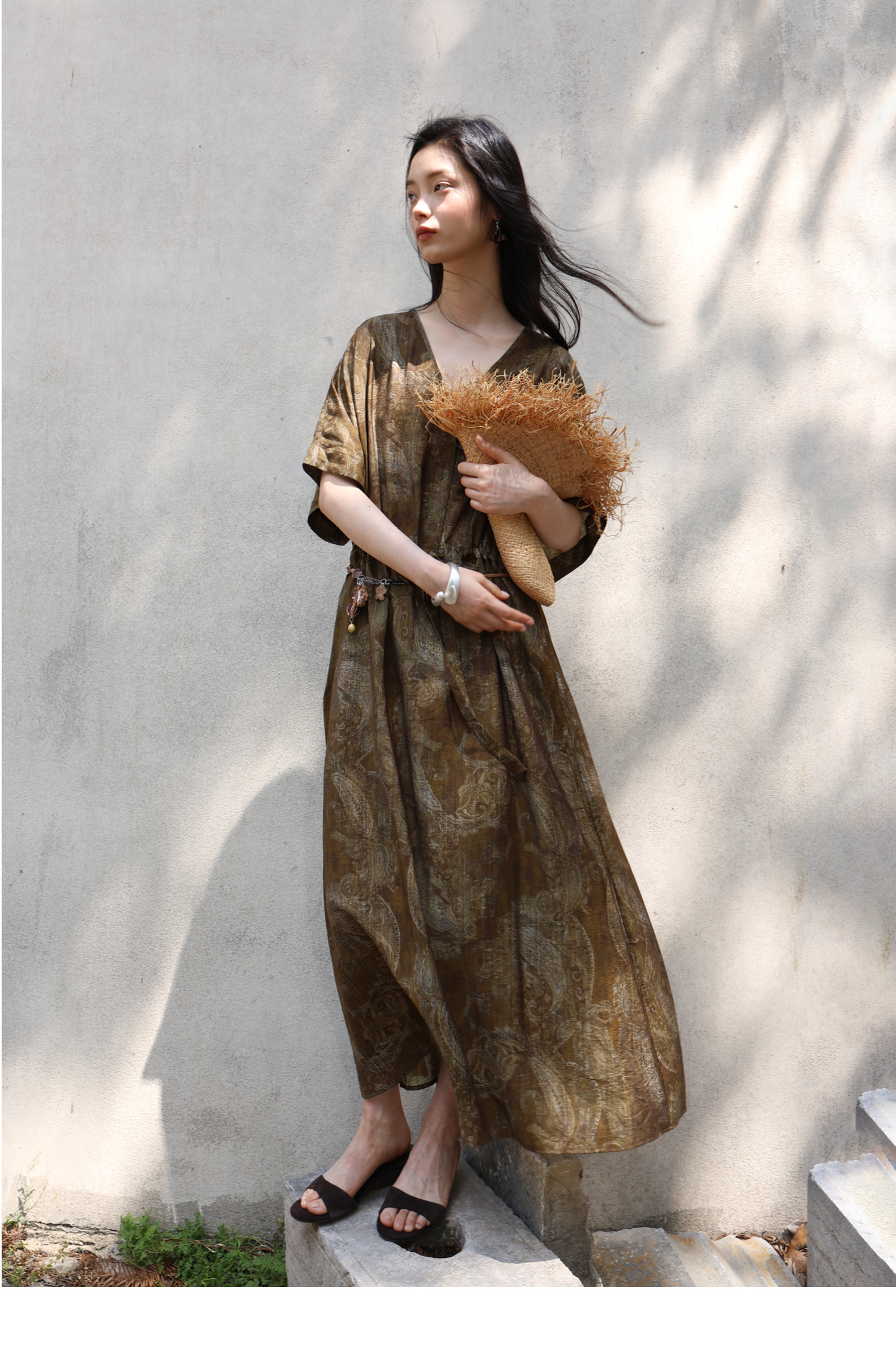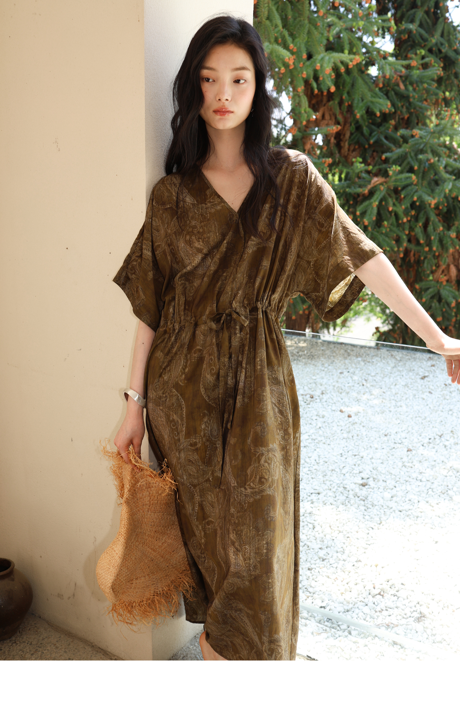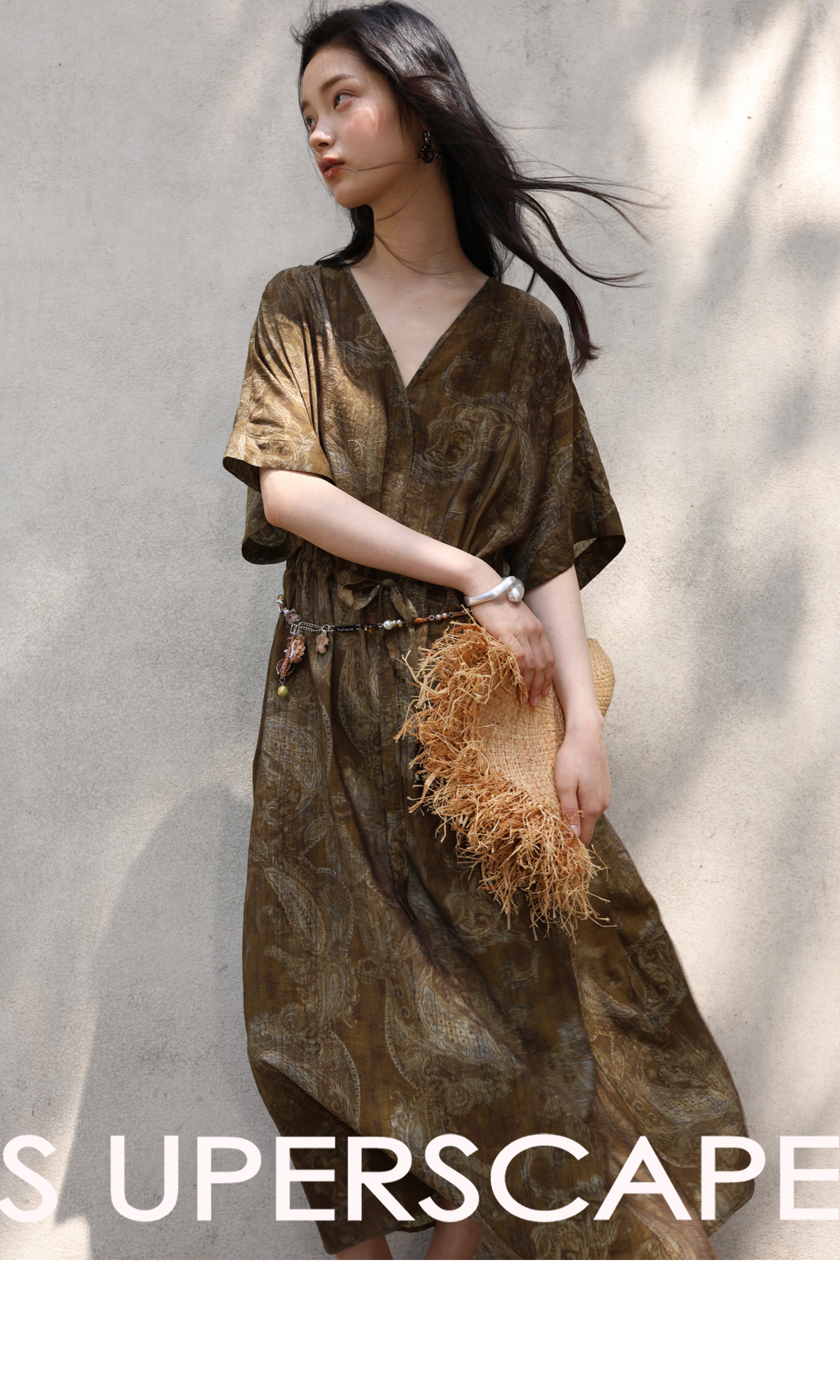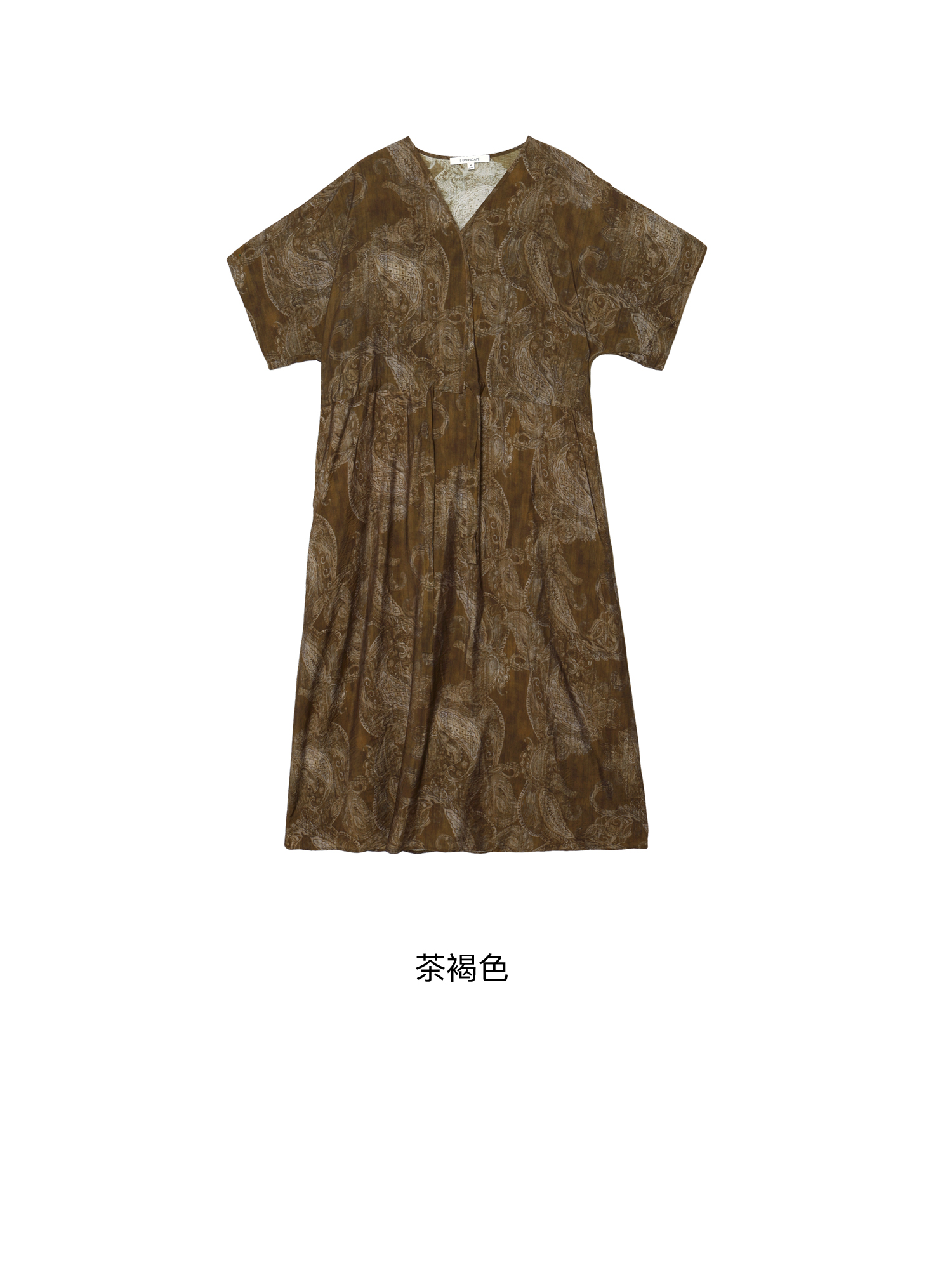 素舶 柔顺垂感印花抽皱V领收腰有袖度假感连衣裙SUPERSCAPE