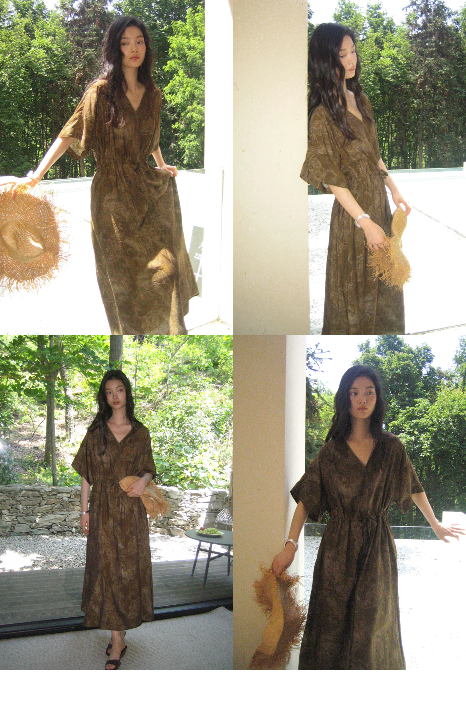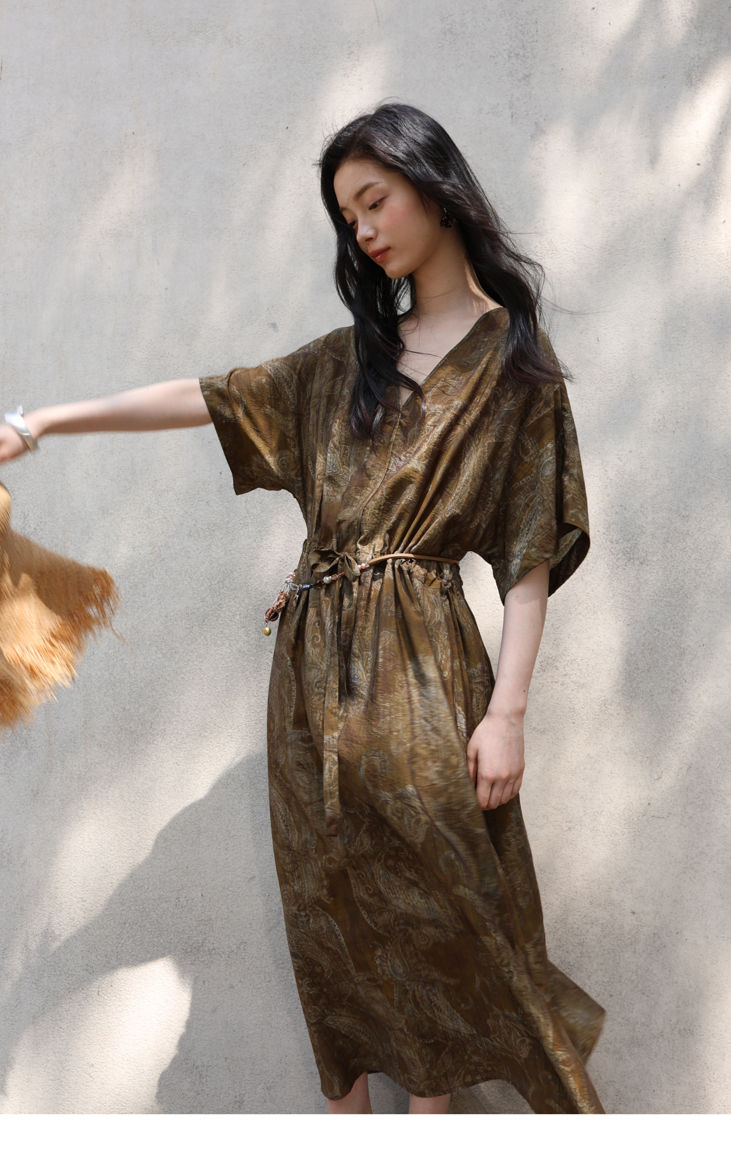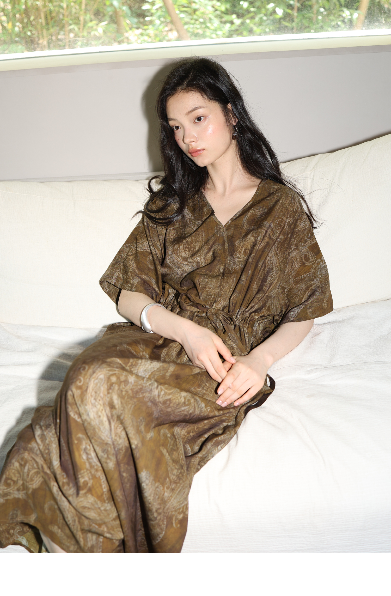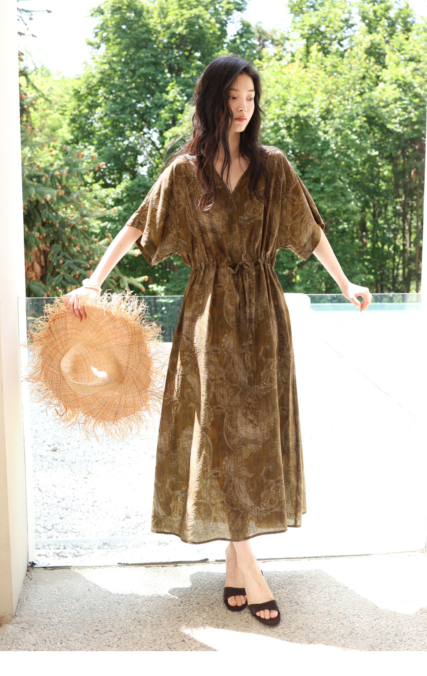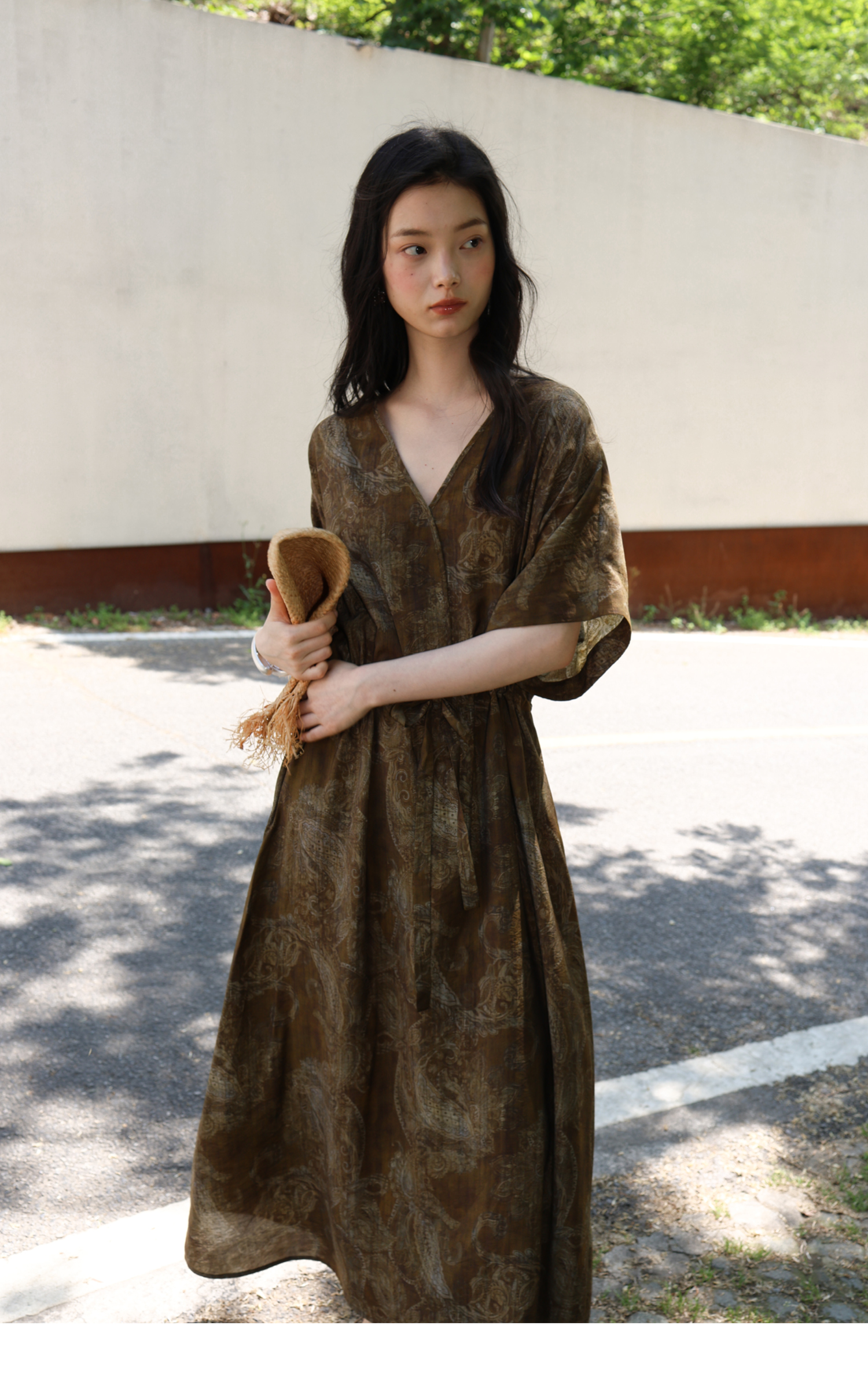 素舶 柔顺垂感印花抽皱V领收腰有袖度假感连衣裙SUPERSCAPE
