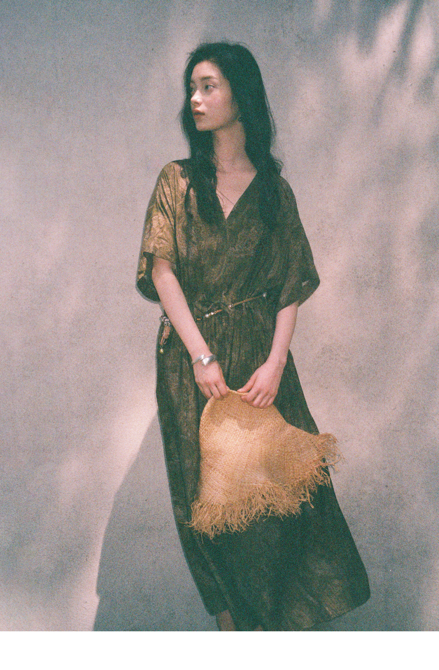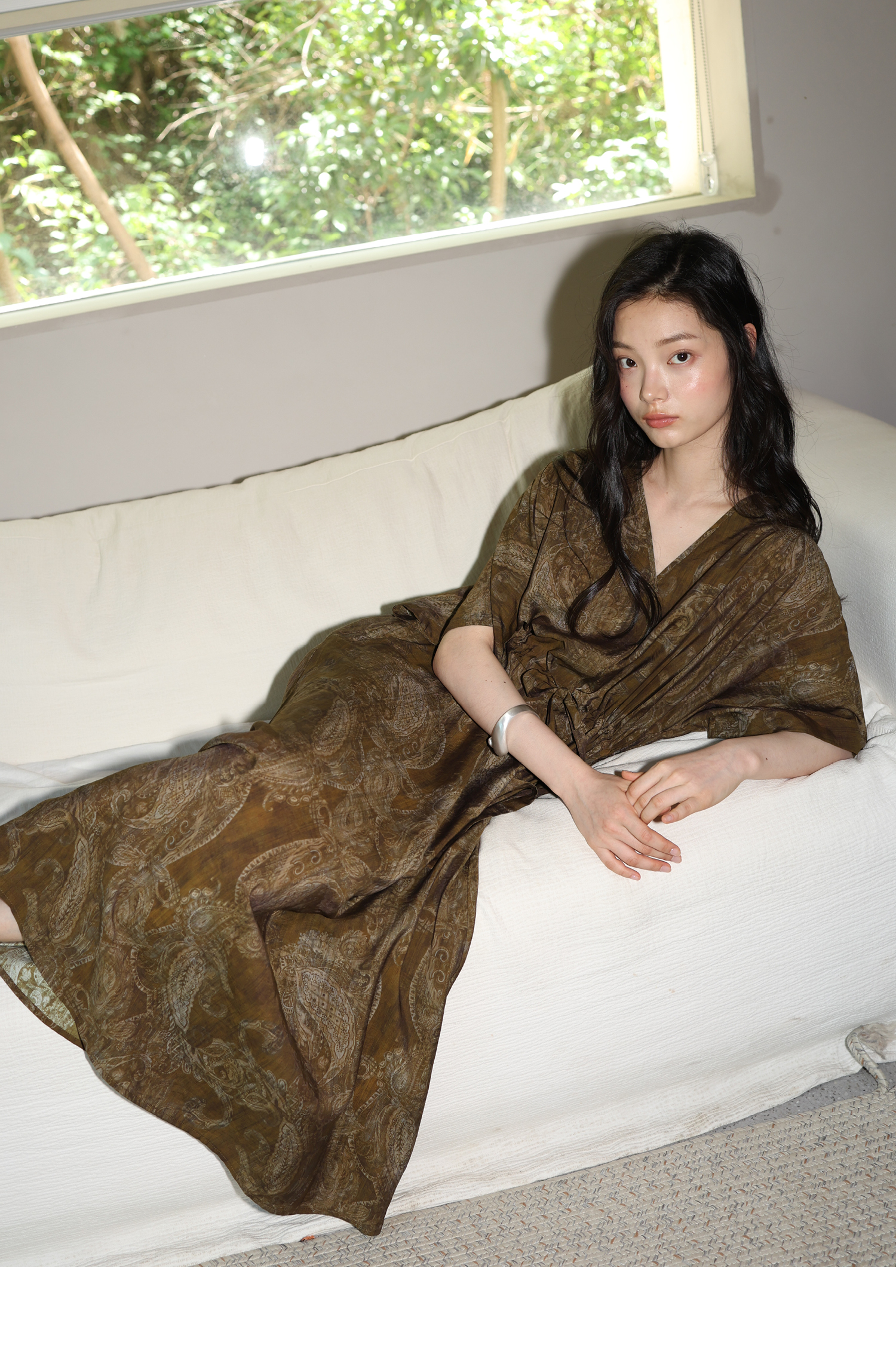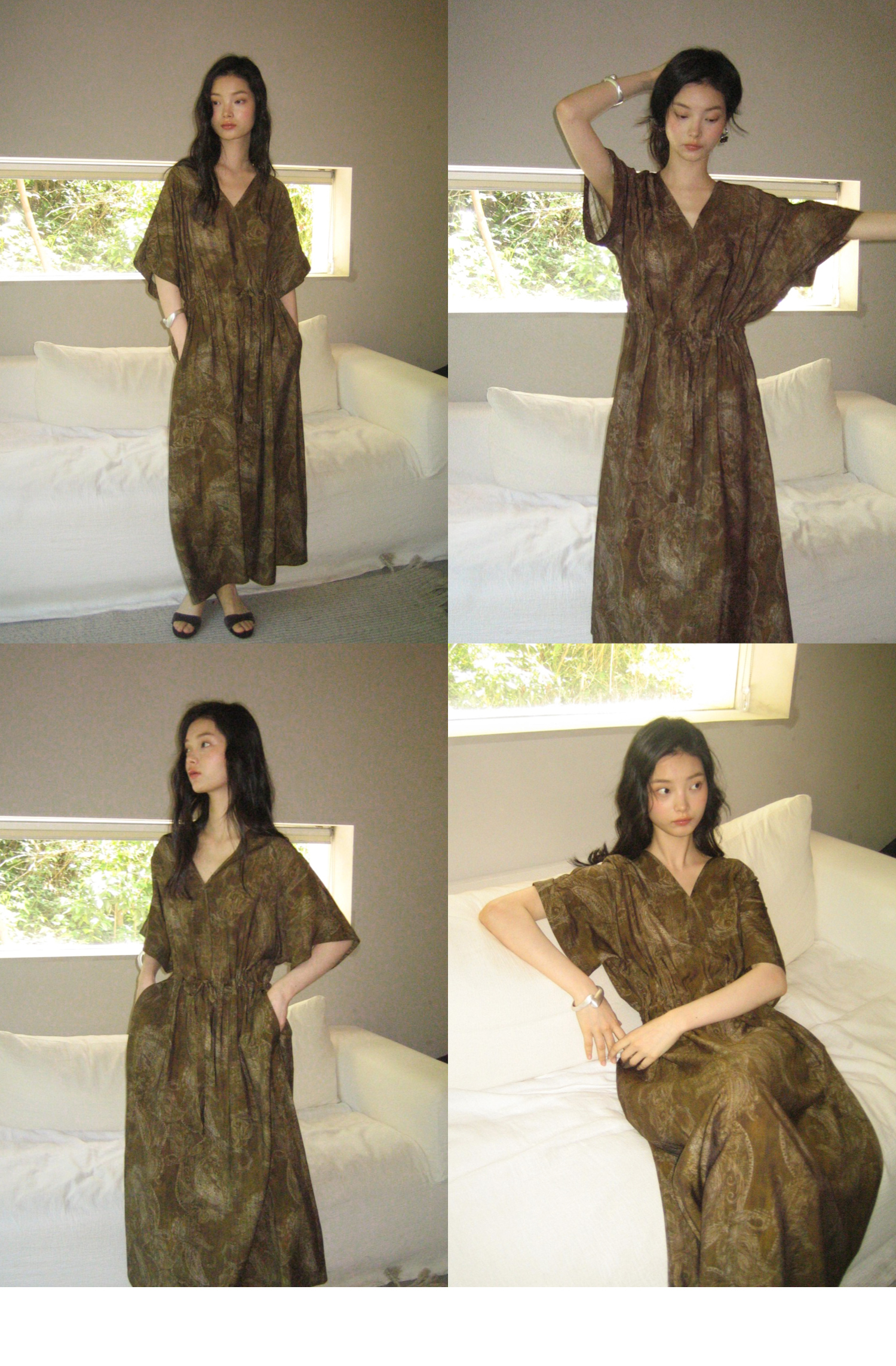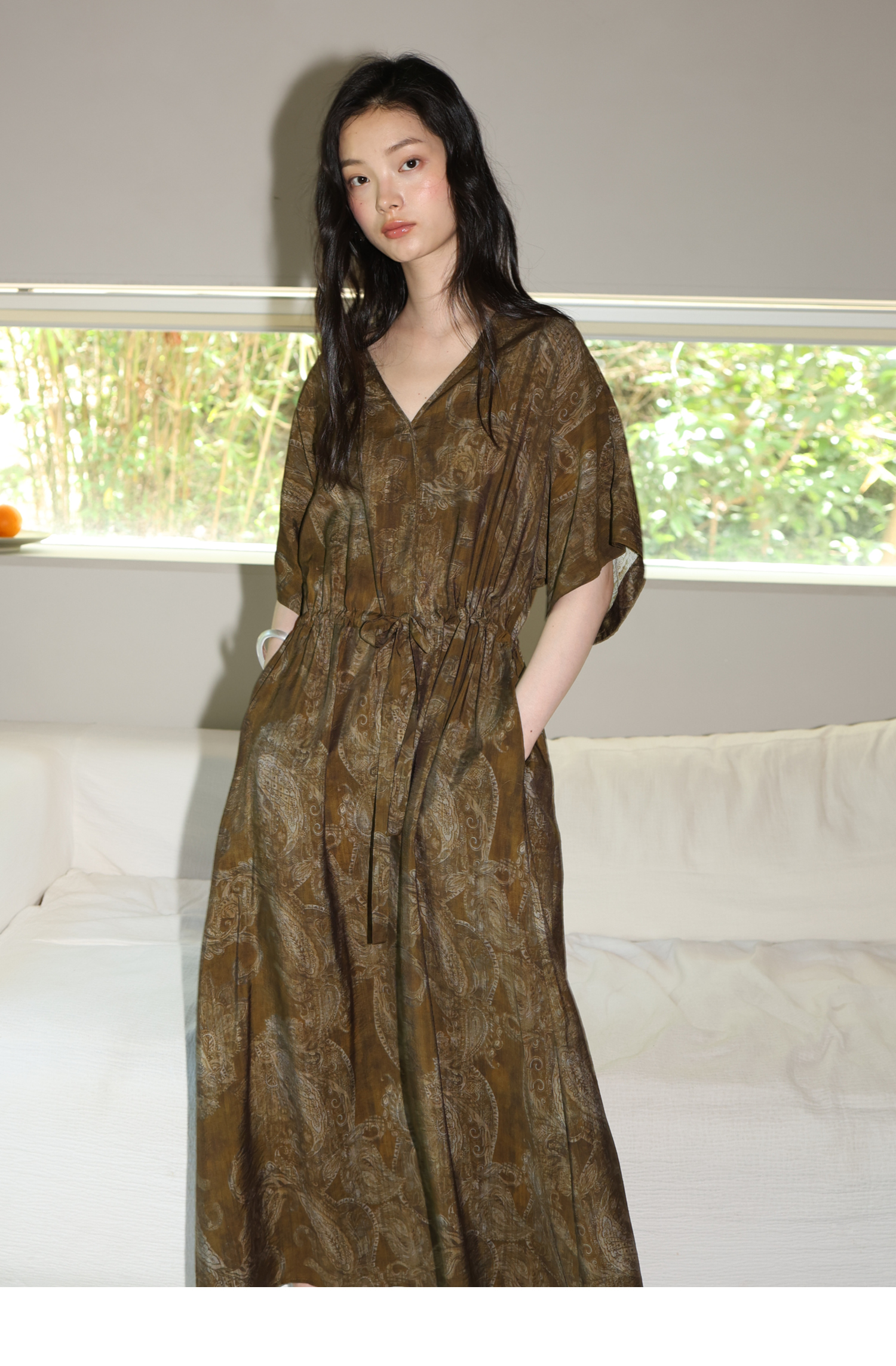 素舶 柔顺垂感印花抽皱V领收腰有袖度假感连衣裙SUPERSCAPE