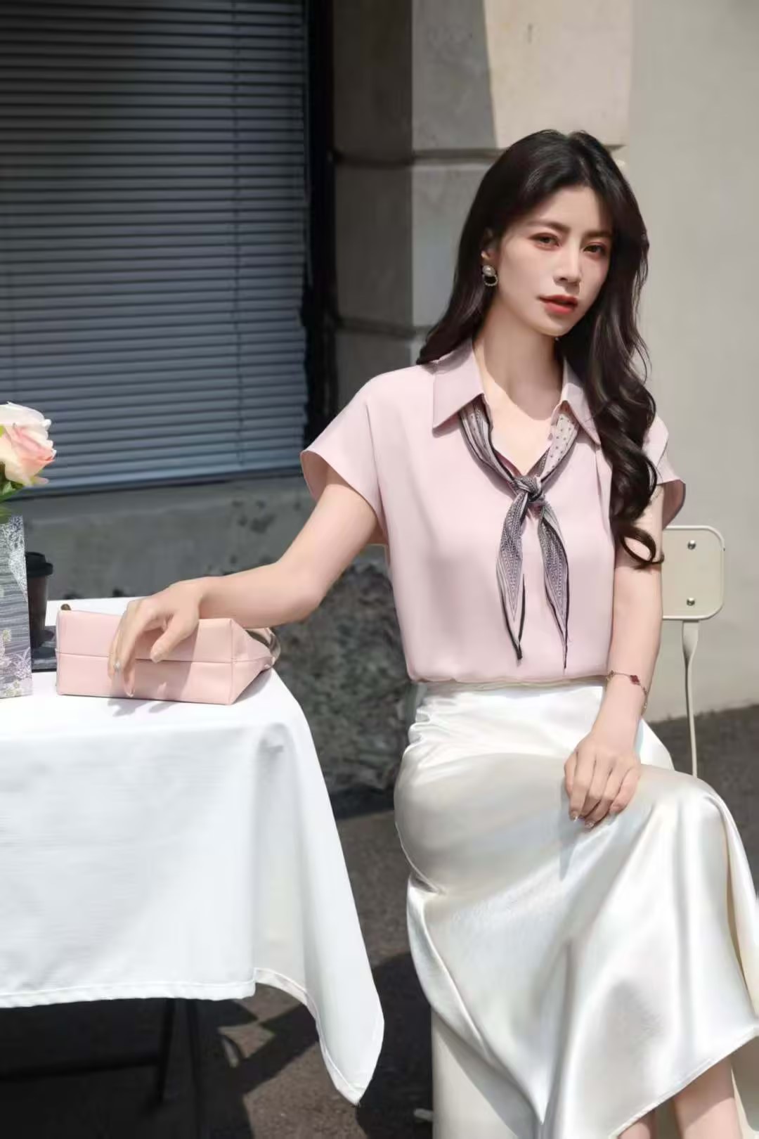 SZ2F56_盈盈色_上衣_夏季_领V领短袖雪纺衬衫_高级女装_BERNIEELEN 伯妮斯茵
