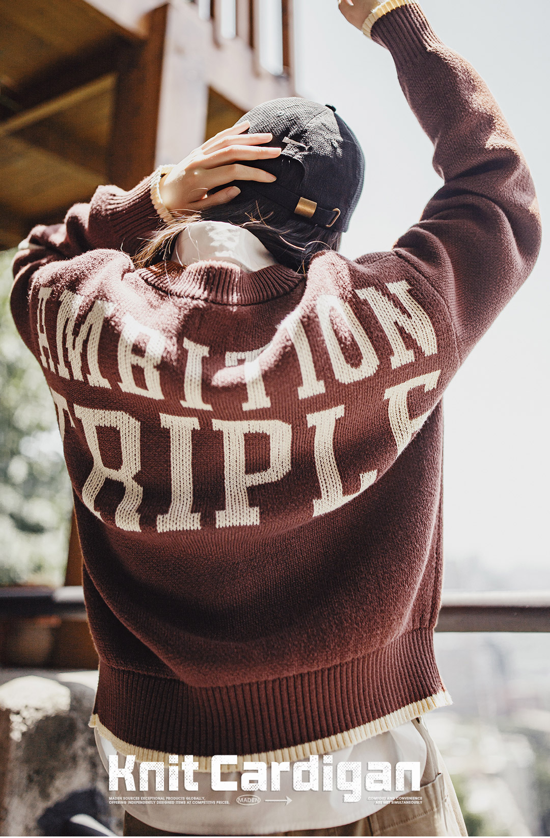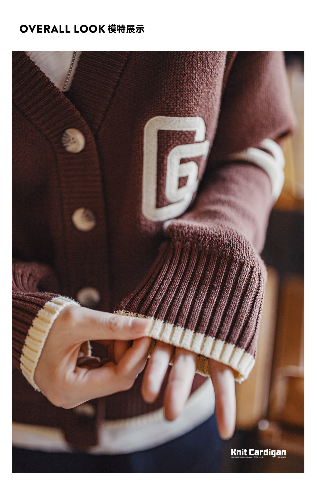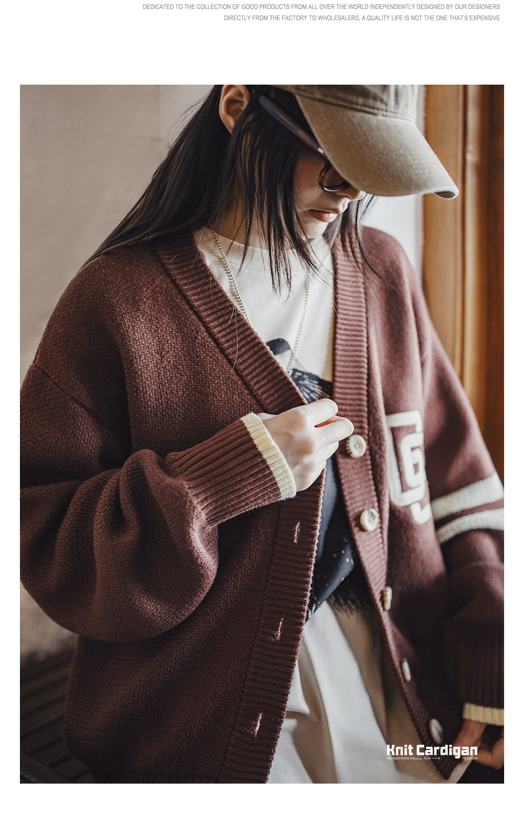 马登美式复古长袖棕色V领针织开衫外套上衣宽松撞色毛衣女士秋冬