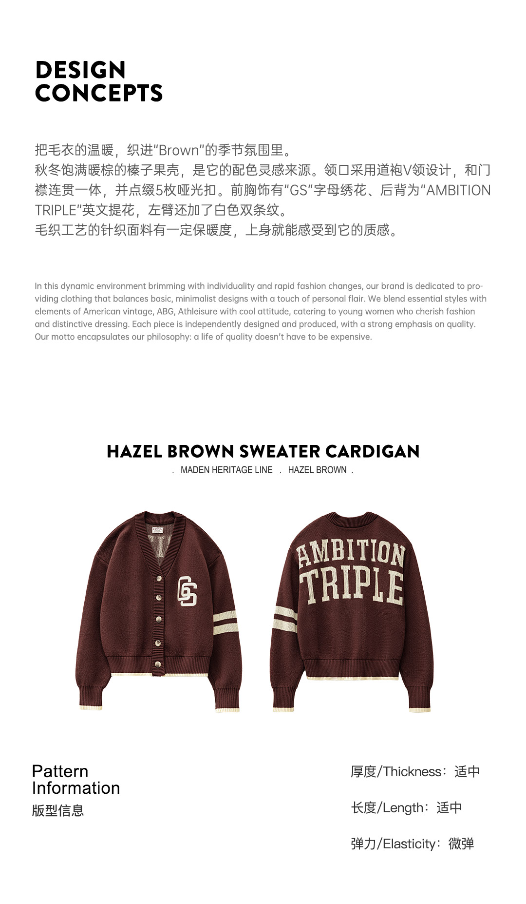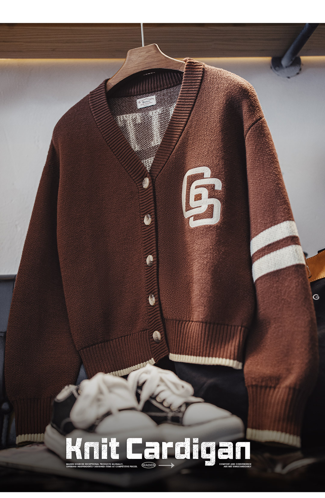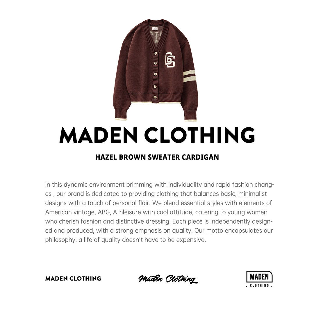 马登美式复古长袖棕色V领针织开衫外套上衣宽松撞色毛衣女士秋冬