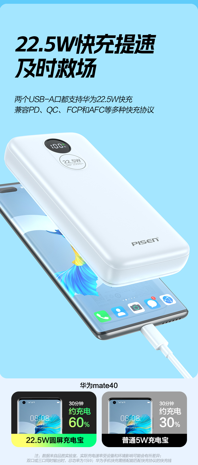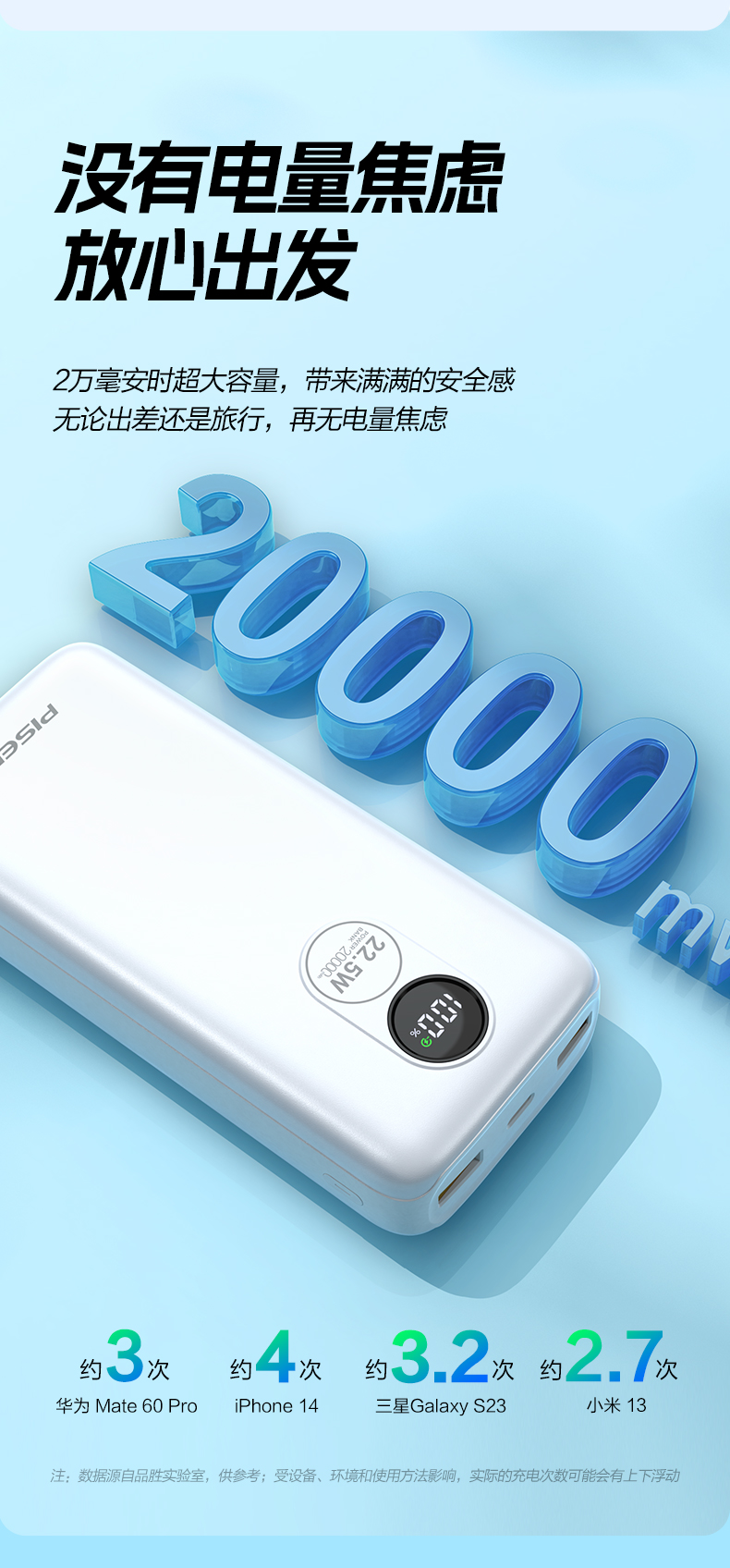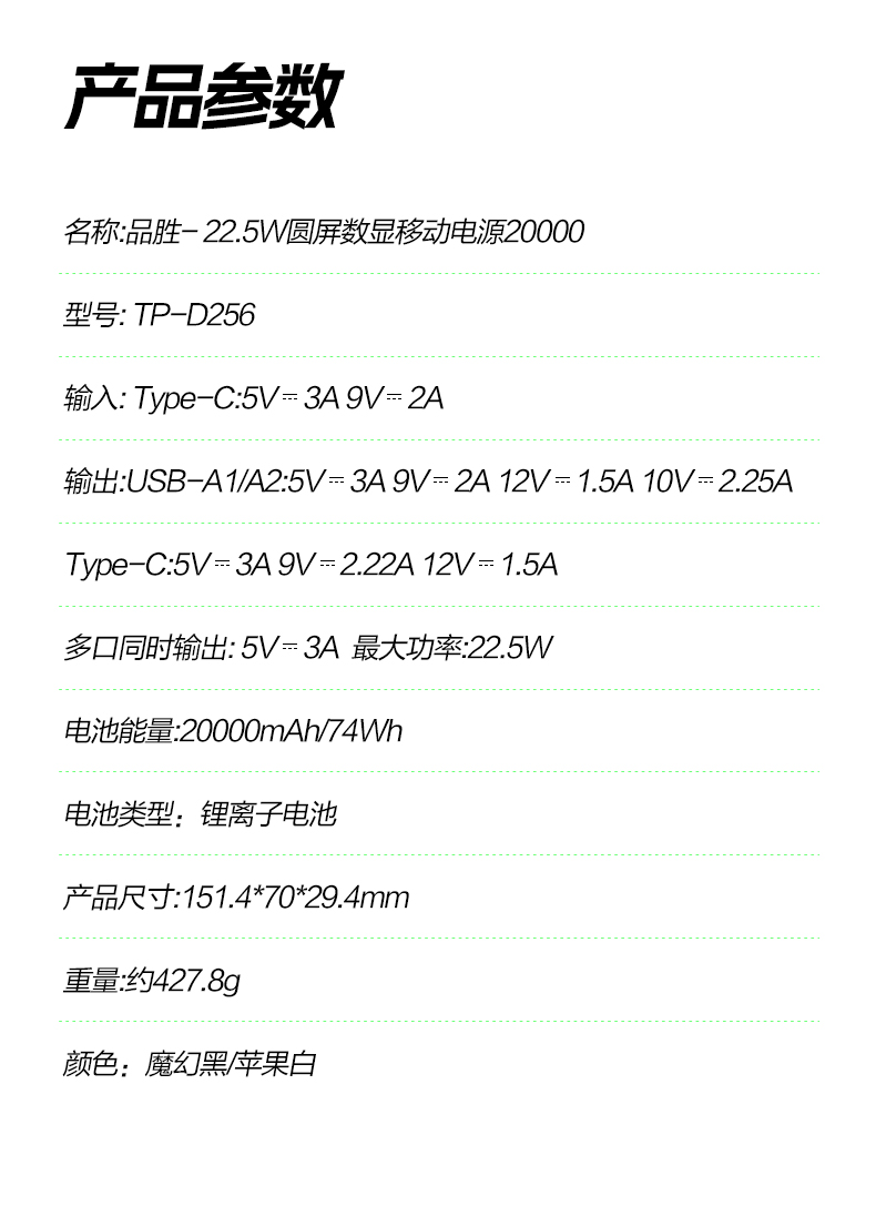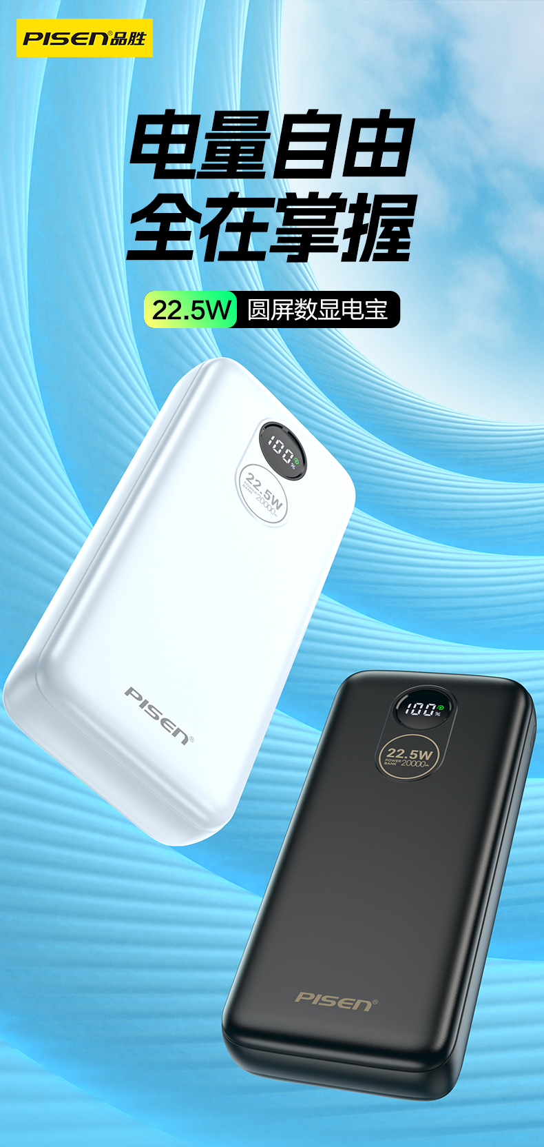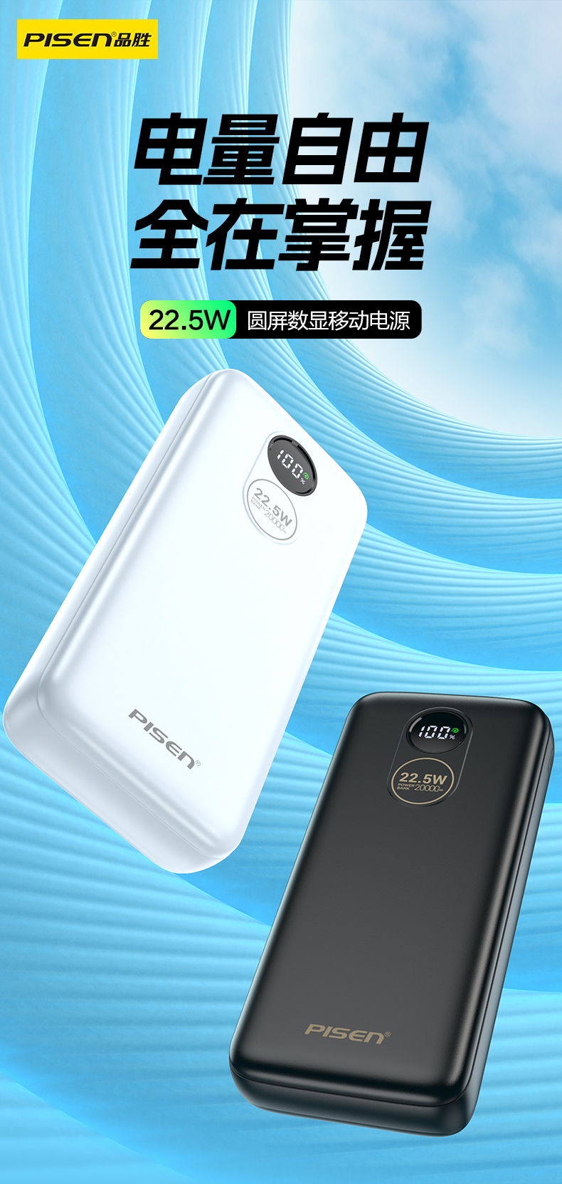 品胜 22.5W圆屏数显充电宝20000毫安移动电源 支持苹果/华为/小米/荣耀等设备