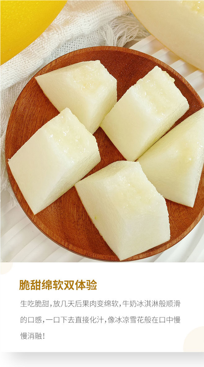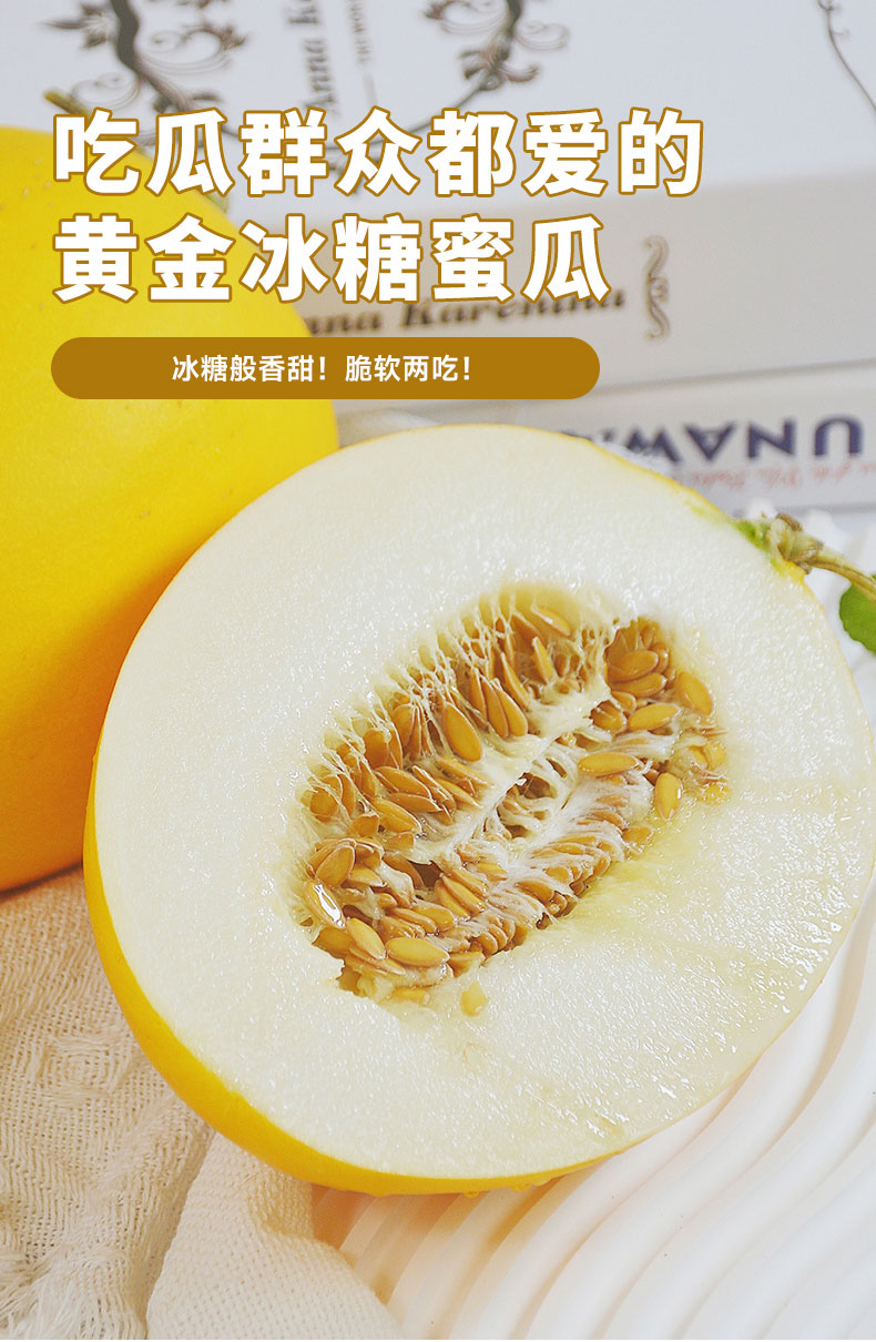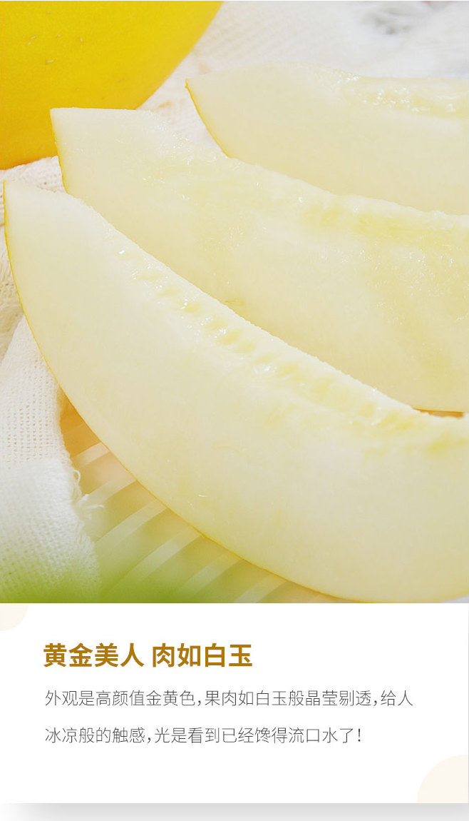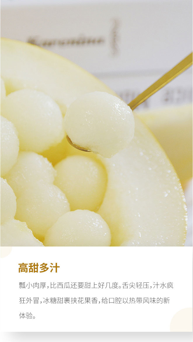 刚摘下的黄金冰糖蜜瓜,外表是高颜值金黄色,果肉如白玉般晶莹剔透,内芯细嫩,外层脆爽,喜欢脆瓜就可以直接开吃了,如果是爱绵如水蜜桃的口感,可以放两三天,果肉会变得软糯,用勺子一转,瓜肉就旋成一颗会淌汁的小甜球儿!春夏吃上一口,超解腻,甜滋滋,口感清爽,每一口都能浇灭燥热的小火苗!