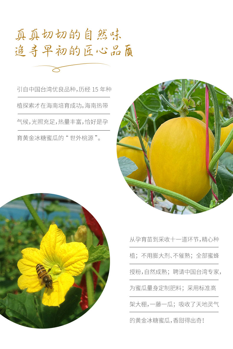 云南和海南的气候非常有利于瓜果积累糖分,因此这里的蜜瓜自然特别甜,为了还原黄金冰糖蜜瓜的美味,果园还聘请了台湾知名农业专家量身定制肥料,使用纯天然的动植物原料和枯草芽孢杆菌等十几种生物菌的绿色肥料种植,让每个瓜都是干净健康的小宝贝,没有农药残留,孕妇和宝宝都能安心享用。